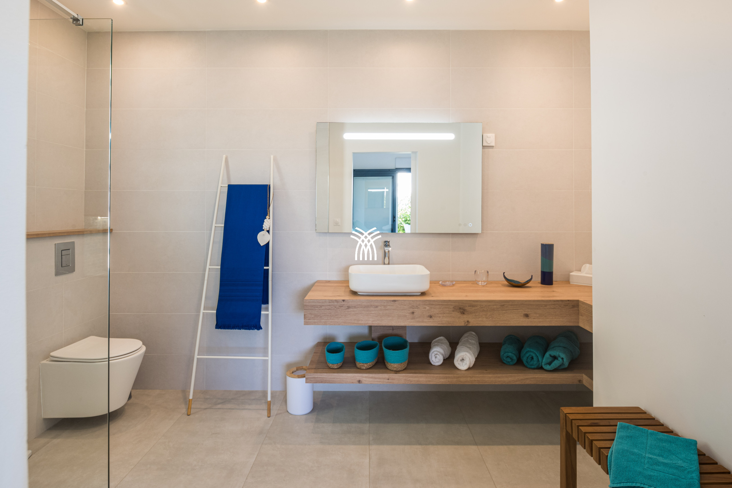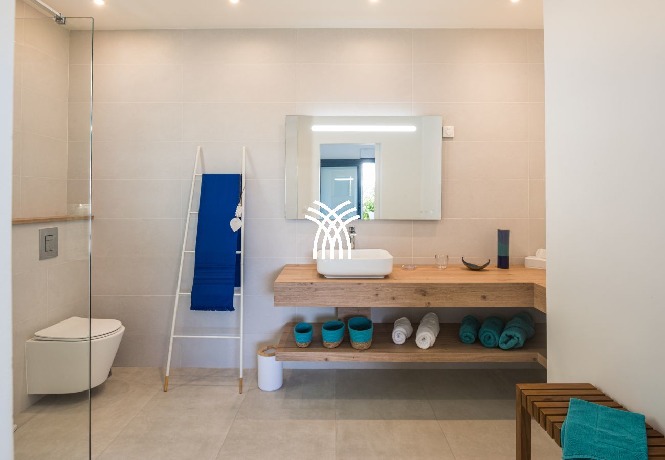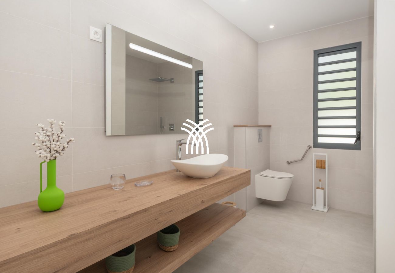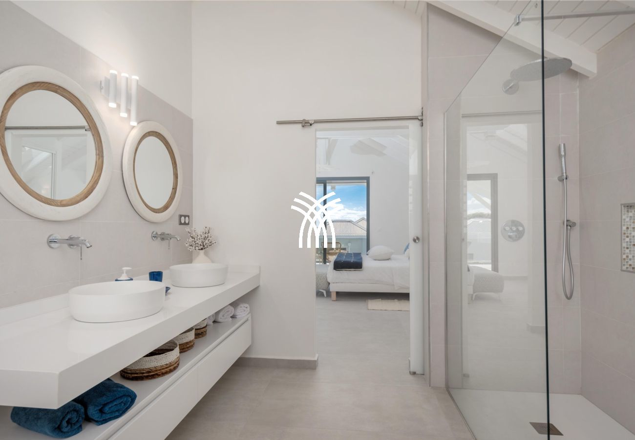 Les vastes espaces de la villa ont été conçus pour offrir un confort absolu et préserver l’intimité de chaque invité. Composée de trois suites luxueuses avec lits King Size, la villa garantit un hébergement de qualité. La suite parentale, située à l’étage, offre une vue imprenable sur la piscine de 12 mètres et s’ouvre sur un solarium privé. Dotée d’un réfrigérateur et d’une cafetière, elle permet une totale autonomie et promet des réveils paisibles avec une vue apaisante sur l’île de Marie-Galante.