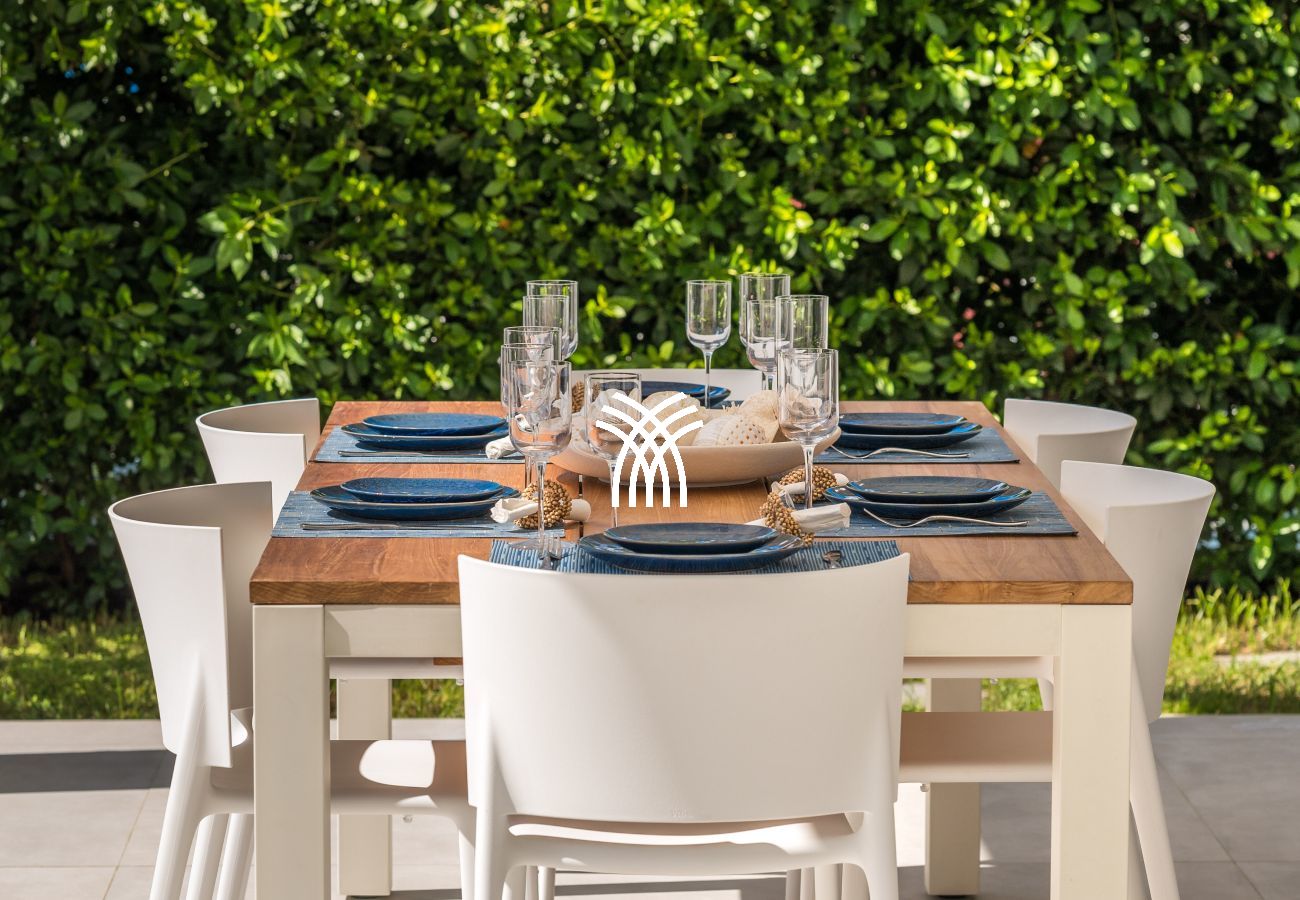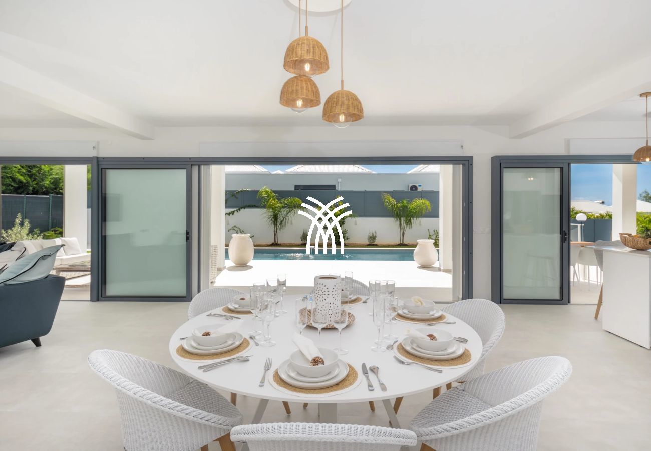 Le cœur de la villa est un espace lumineux et convivial où se rencontrent la cuisine parfaitement équipée, la salle à manger élégante et un salon confortable, idéal pour des moments de partage. À l’extérieur, une galerie s’étend autour de la piscine, offrant un espace lounge accueillant et une grande table pour 12 personnes, parfaite pour savourer des repas en plein air tout en profitant de la végétation tropicale environnante.