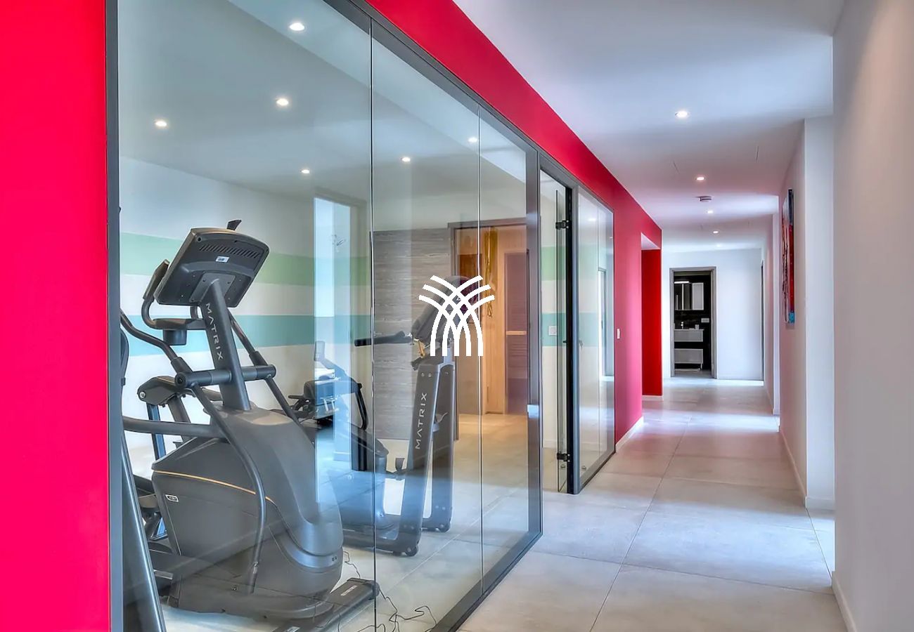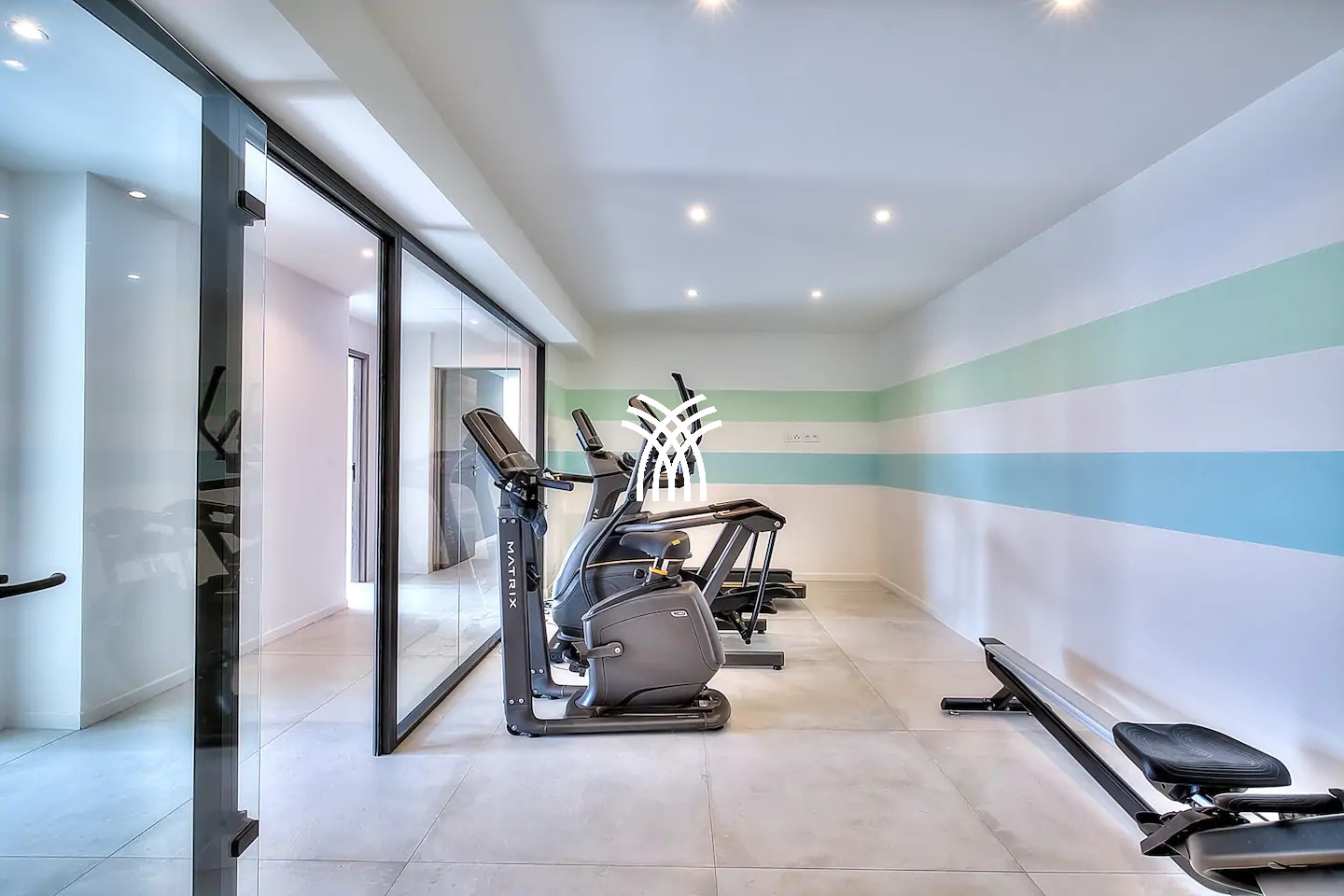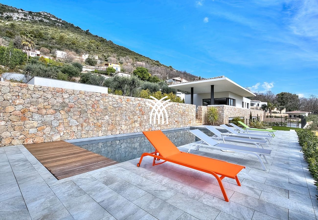 À l’extérieur, la villa dispose d’une vaste terrasse en bois bordée d’une piscine privée, idéale pour se relaxer et profiter du climat ensoleillé de la Côte d’Azur. Vous pourrez également profiter de moments de détente dans l’un des nombreux salons extérieurs aménagés, offrant une vue imprenable sur la mer et les collines.