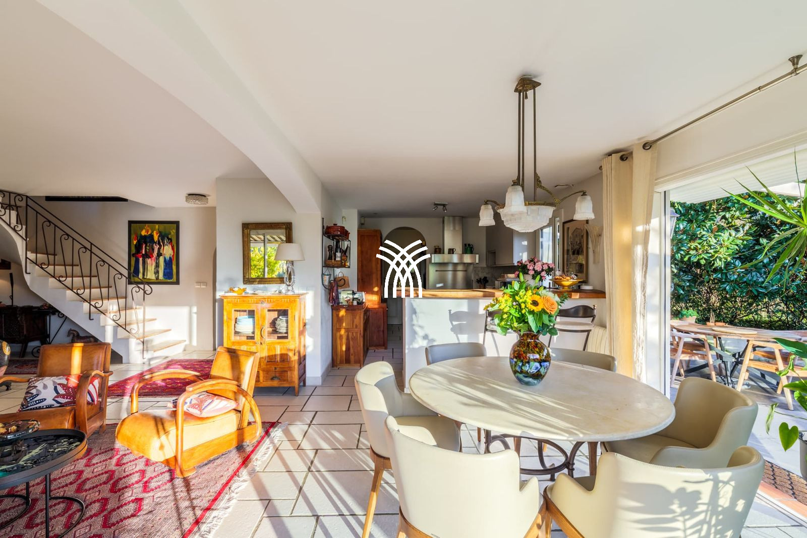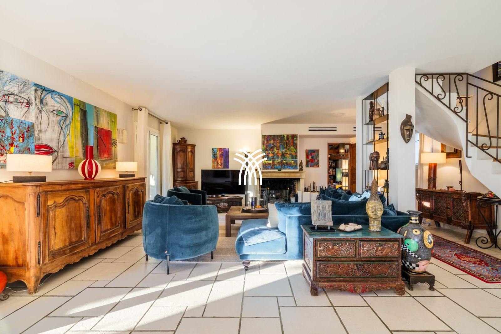 Le salon, baigné de lumière, offre des espaces détente et lecture, parfaits pour des moments de convivialité ou de relaxation. La villa dispose de plusieurs niveaux, ainsi que de restanques aménagées côté extérieur, offrant une belle harmonie entre architecture et nature.
