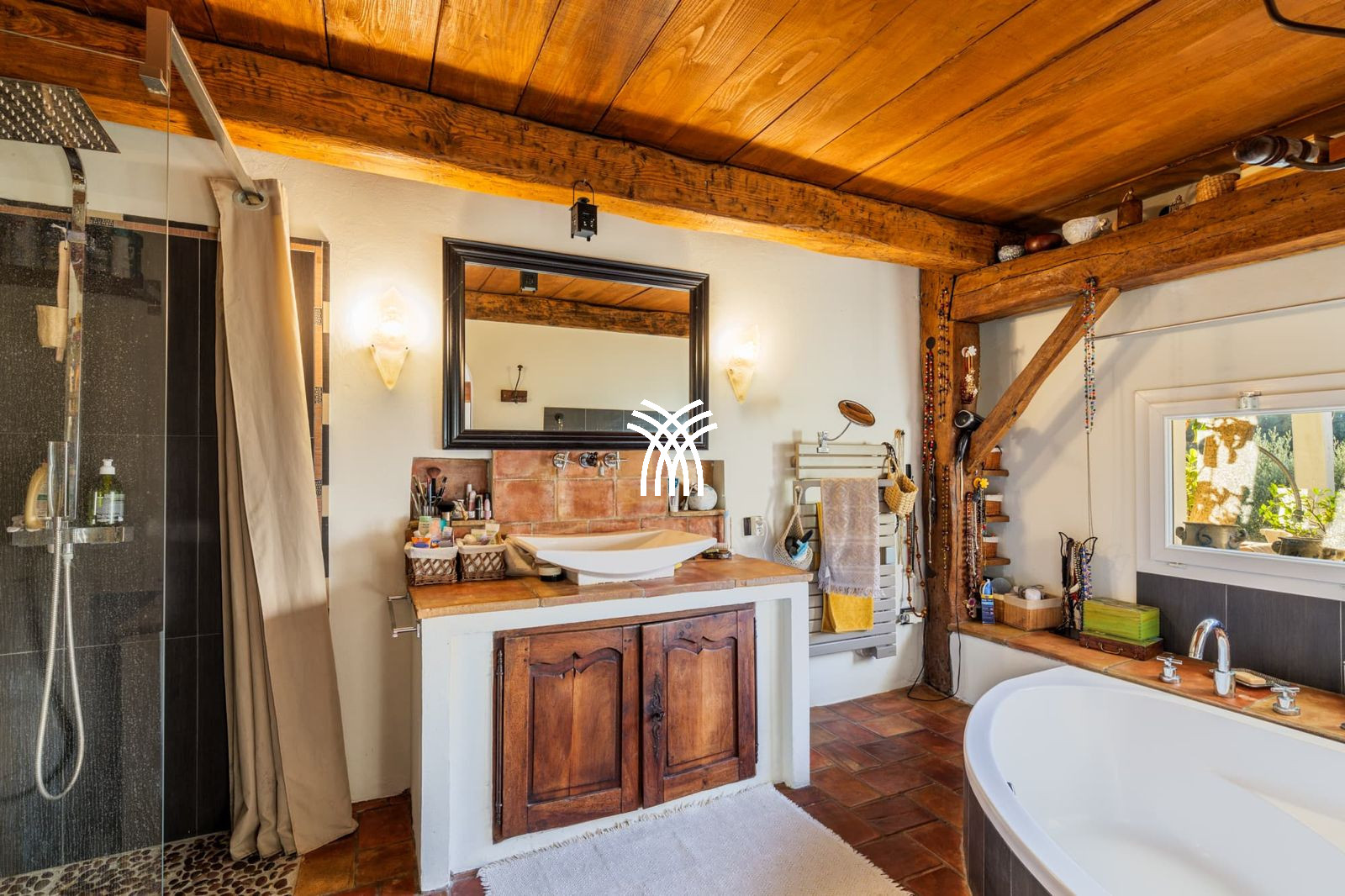 Ce domaine privé comprend également une piscine à débordement pouvant être chauffée, un jacuzzi, un sauna infrarouge, plusieurs restanques, un terrain de pétanque et un parking pour 5 voitures équipé de câbles de recharge pour véhicules électriques. À noter que le niveau de la maison n'est pas adapté pour les personnes à mobilité réduite.