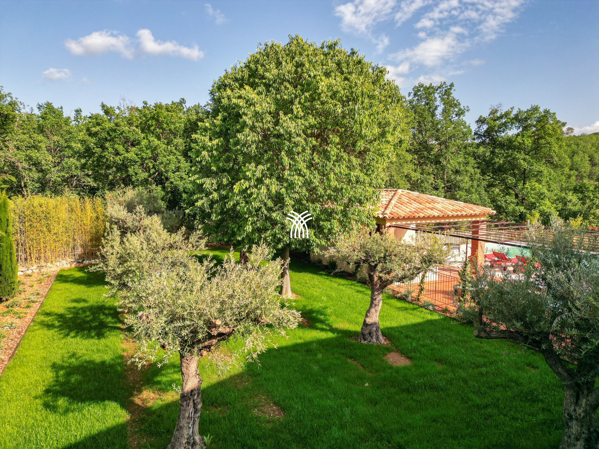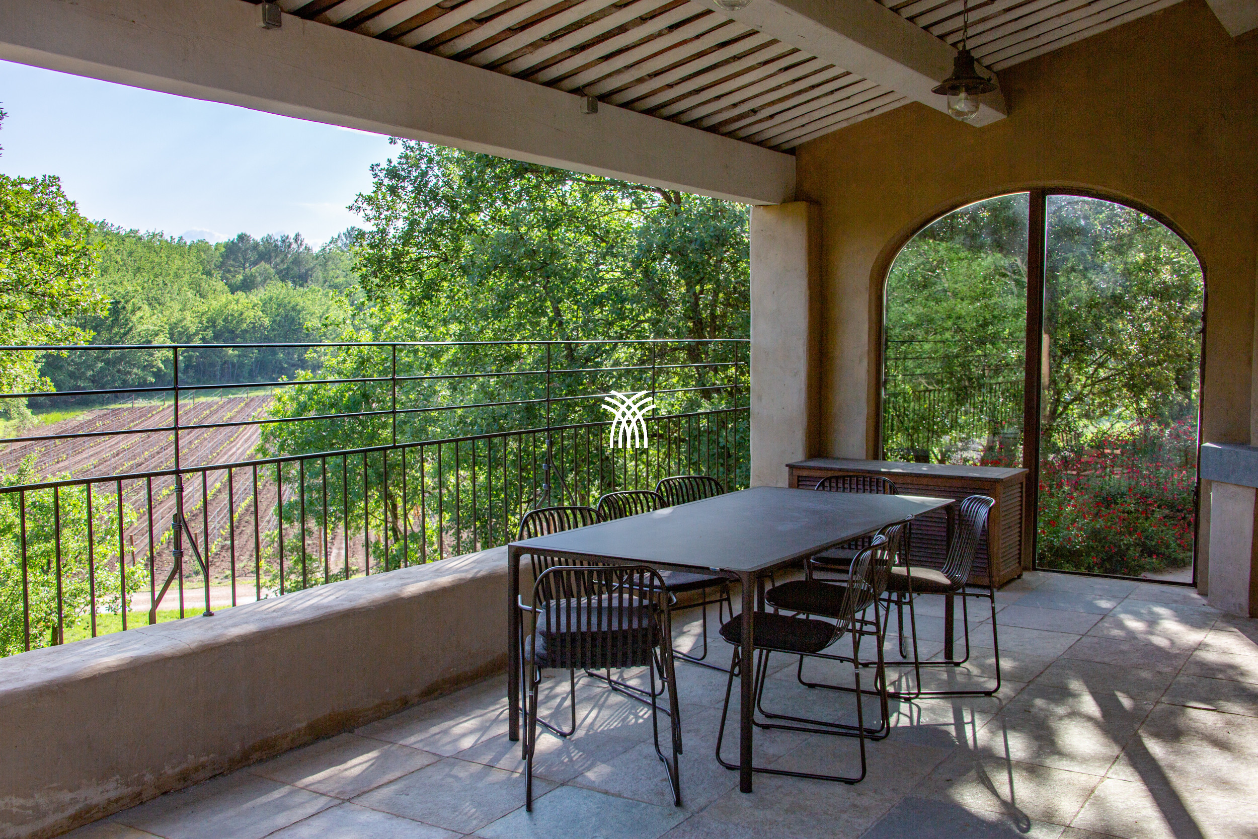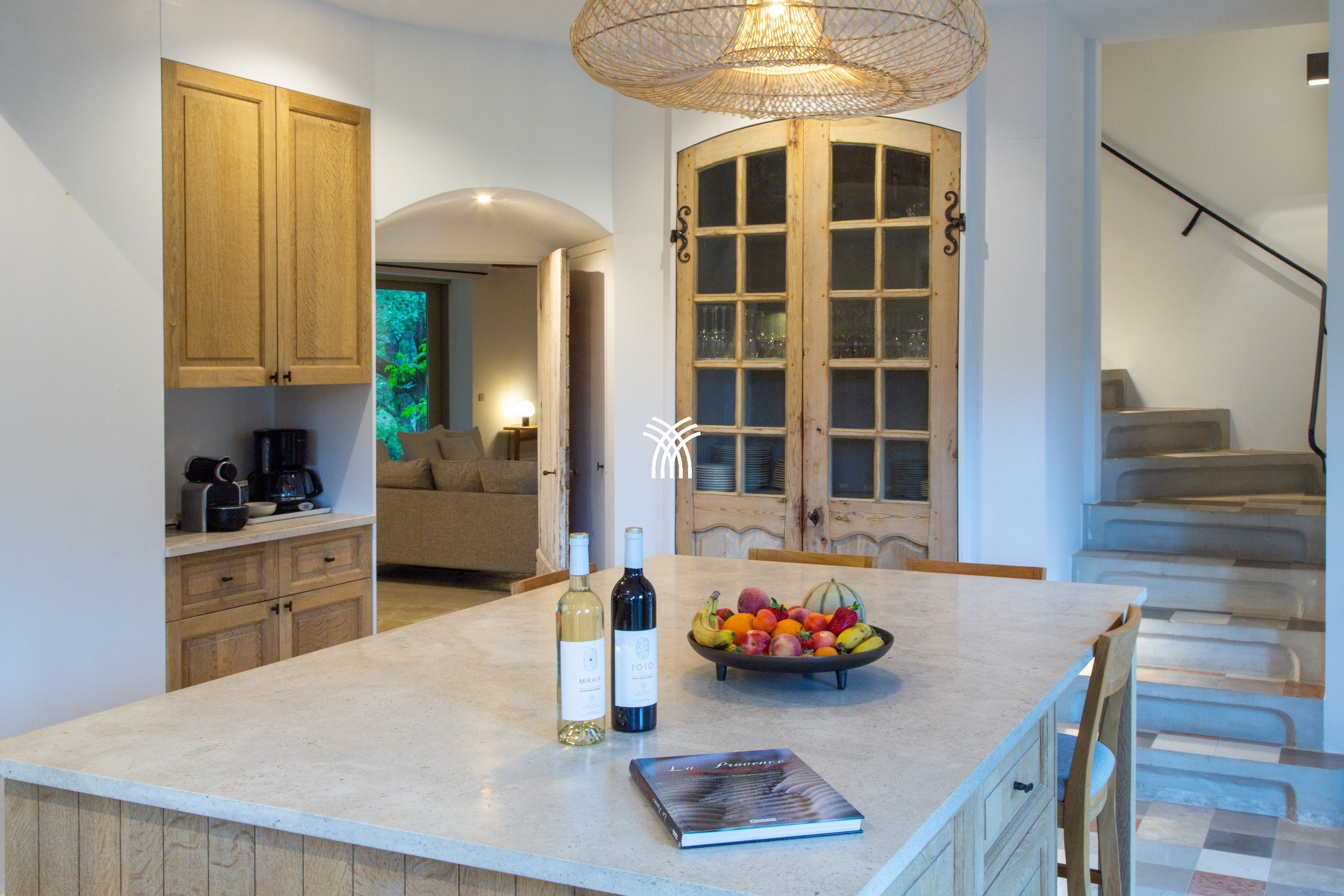 Au cœur de la maison, une cuisine saisissante avec un îlot central, une chambre froide et un ensemble d'appareils s'ouvre sur des vues captivantes de la piscine d'un côté et d'une vallée bordée d'arbres avec des vignobles de l'autre. Cet espace est conçu pour des expériences partagées, que ce soit en préparant des repas, en découvrant la richesse de la cuisine provençale, ou simplement en profitant de la beauté des alentours. La salle à manger, encadrée par de grandes baies vitrées donnant sur les bois, renforce cette connexion à la nature, tandis qu'un petit bureau avec vue sur la cave à fûts et une salle de télévision séparée offrent des coins tranquilles pour la réflexion.