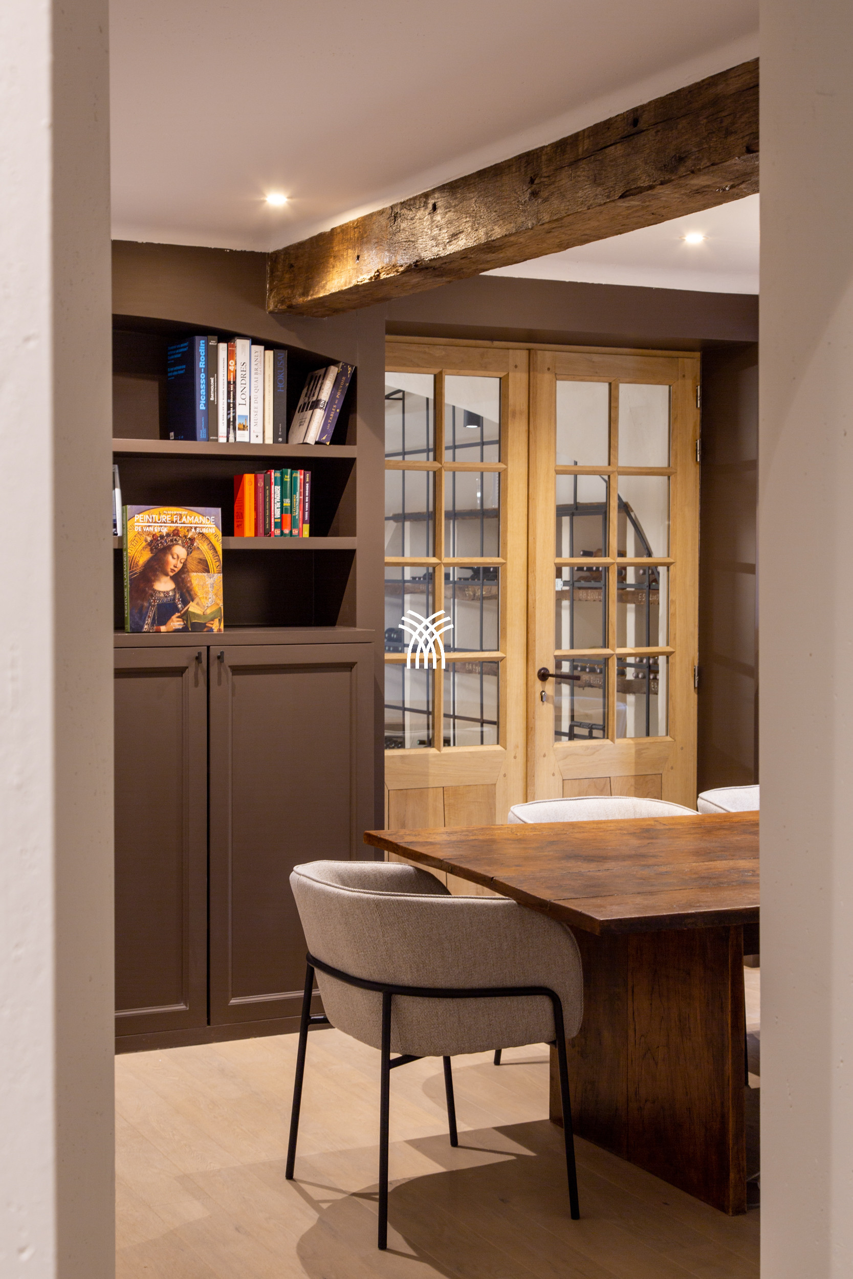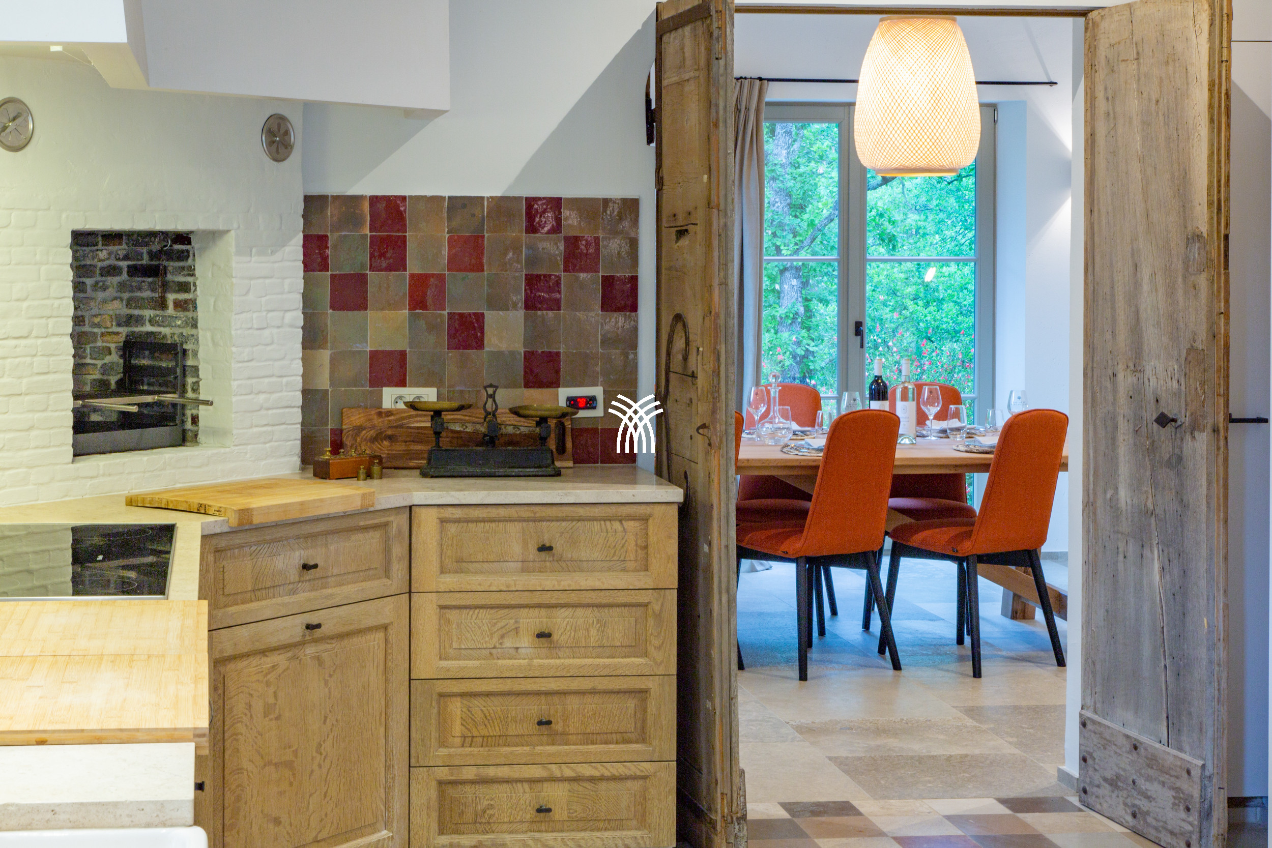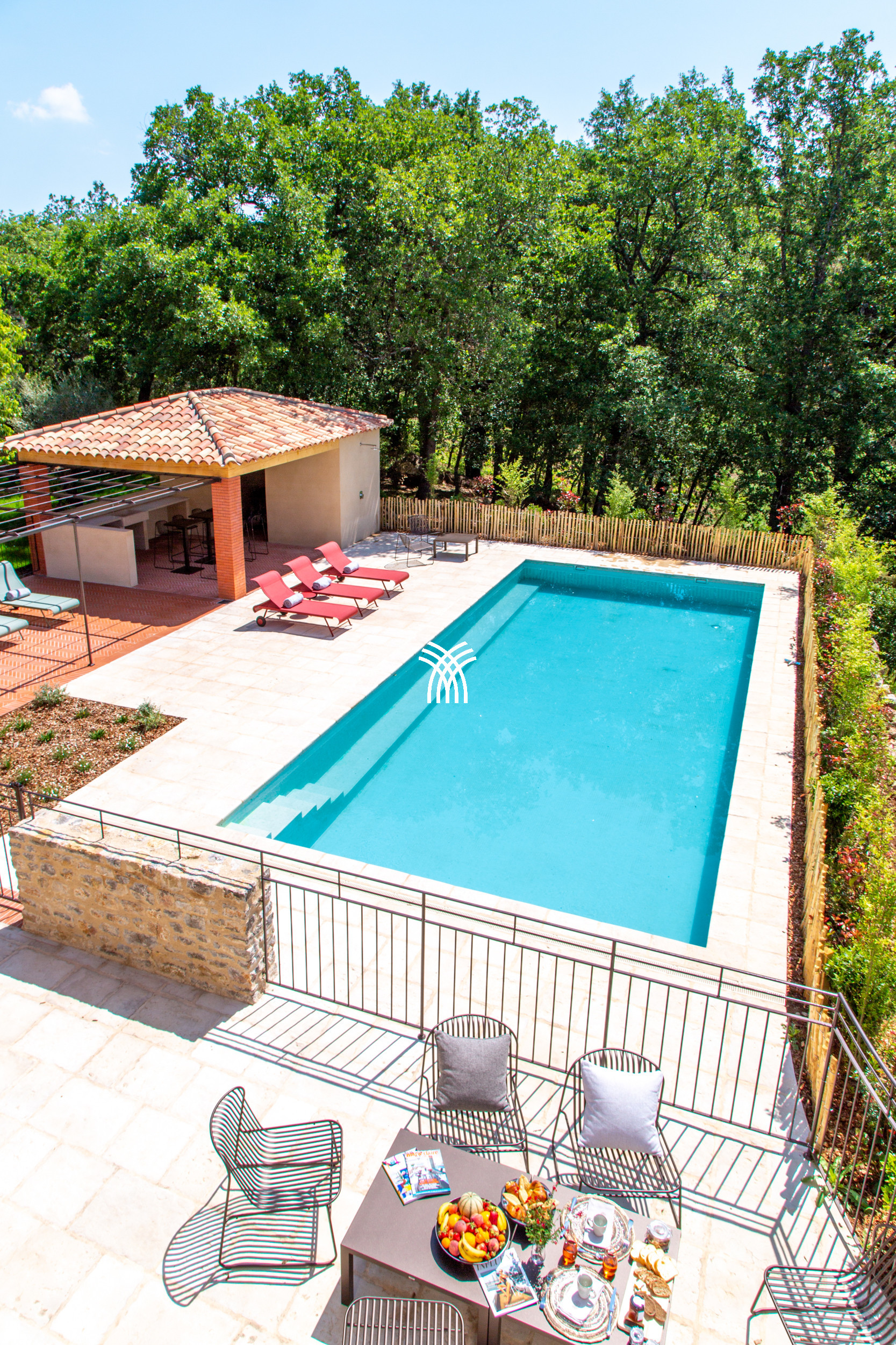 Au cœur de la maison, une cuisine saisissante avec un îlot central, une chambre froide et un ensemble d'appareils s'ouvre sur des vues captivantes de la piscine d'un côté et d'une vallée bordée d'arbres avec des vignobles de l'autre. Cet espace est conçu pour des expériences partagées, que ce soit en préparant des repas, en découvrant la richesse de la cuisine provençale, ou simplement en profitant de la beauté des alentours. La salle à manger, encadrée par de grandes baies vitrées donnant sur les bois, renforce cette connexion à la nature, tandis qu'un petit bureau avec vue sur la cave à fûts et une salle de télévision séparée offrent des coins tranquilles pour la réflexion.