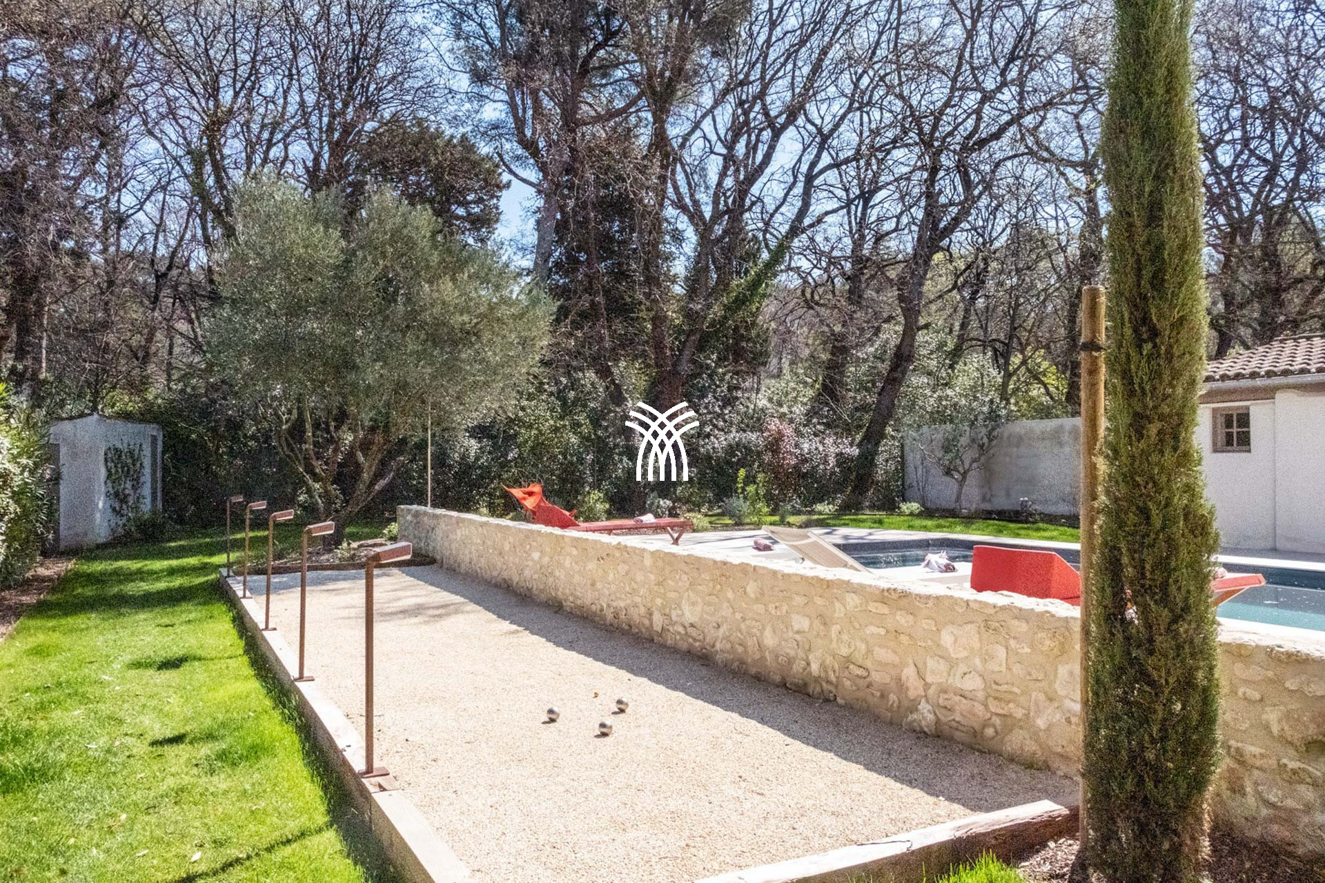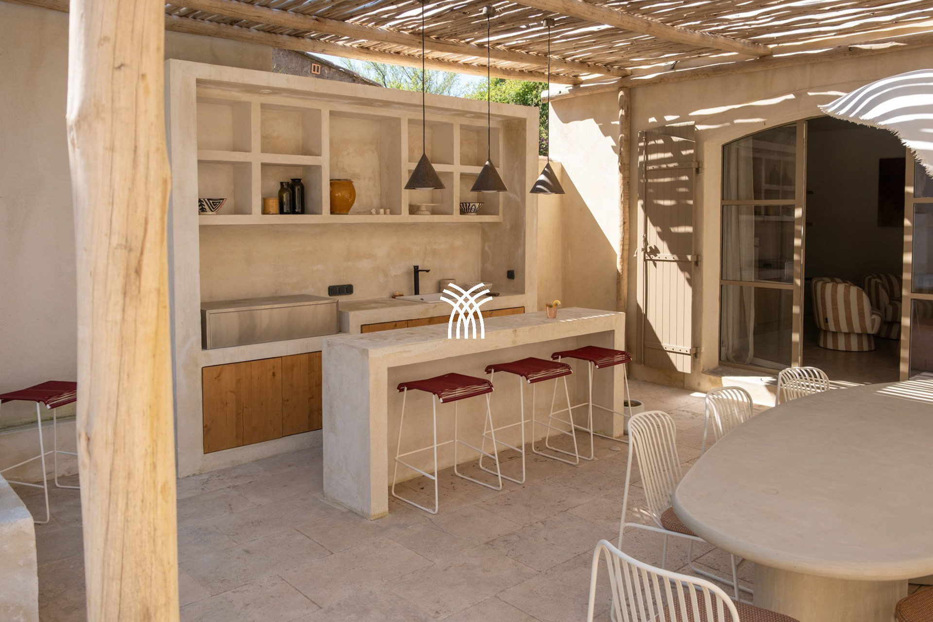 La piscine de 9x4 mètres, bordée de transats, s’intègre parfaitement dans un écrin de verdure, invitant à la détente et au farniente. Une cuisine d’été avec plancha, une grande table conviviale et une banquette intégrée permettent de savourer pleinement l’art de vivre en extérieur. Un terrain de pétanque complète ce lieu typiquement provençal, propice aux moments partagés et à la convivialité.