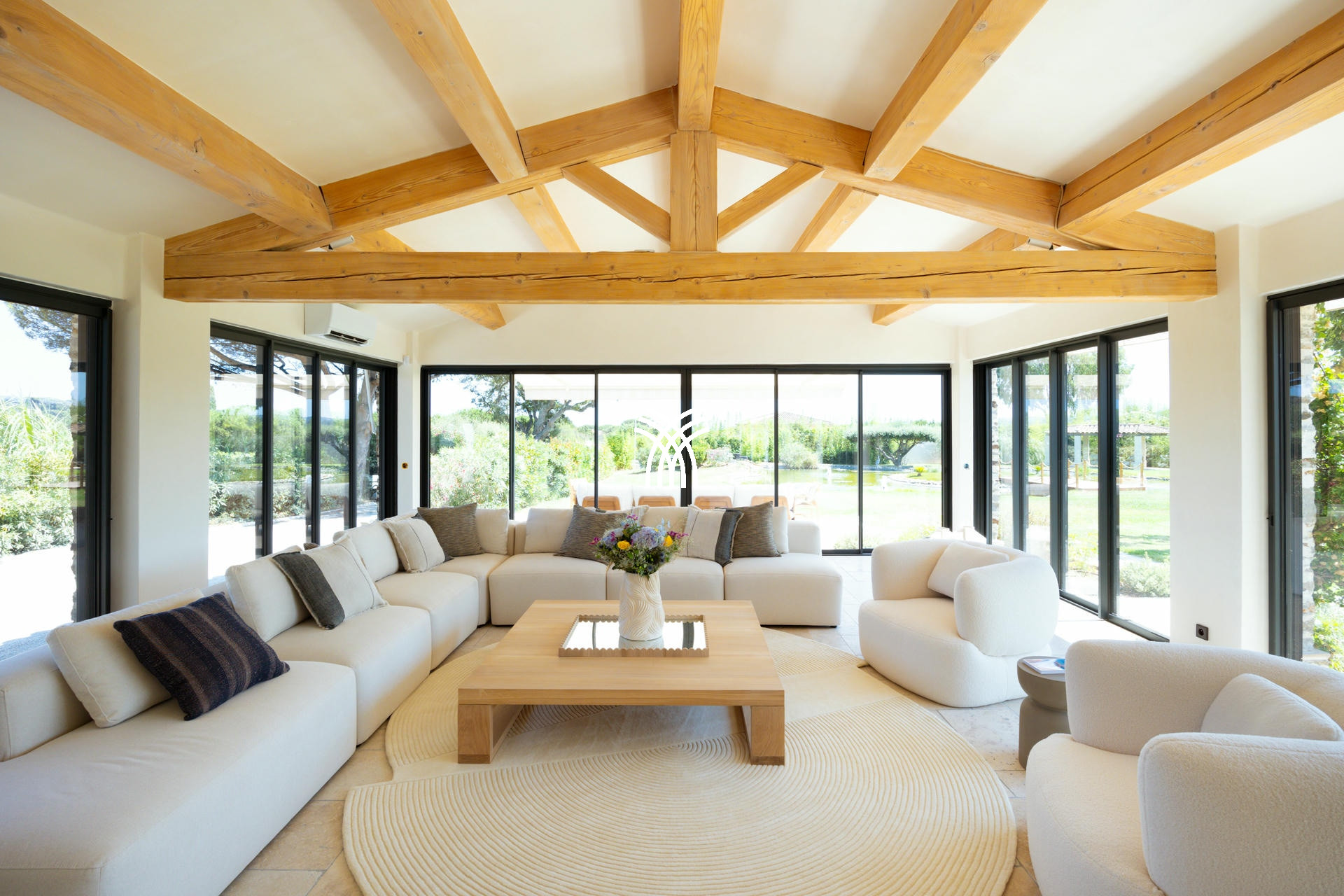 À l’extérieur, la piscine entourée de larges terrasses invite à la détente sous le soleil tropézien, tandis que les coins repas ombragés et le barbecue offrent un espace parfait pour des déjeuners ou dîners en famille ou entre amis.