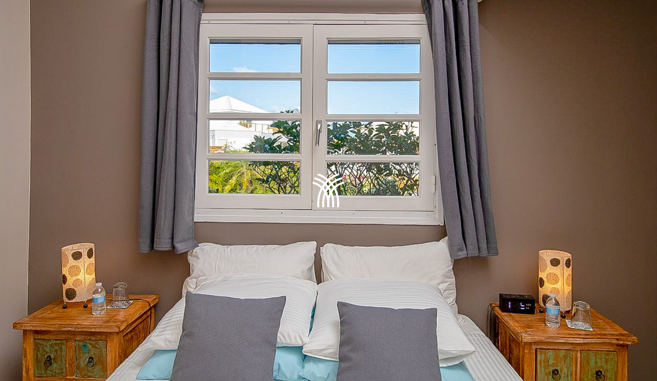 Lit queen size (160 x 200 cm), air-conditionné, moustiquaire, salle de bain avec baignoire et WC partagée avec chambre 2, vue mer