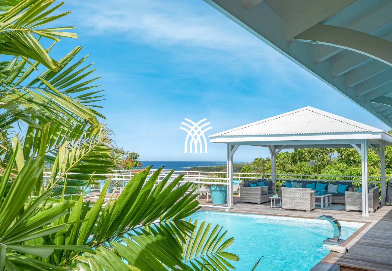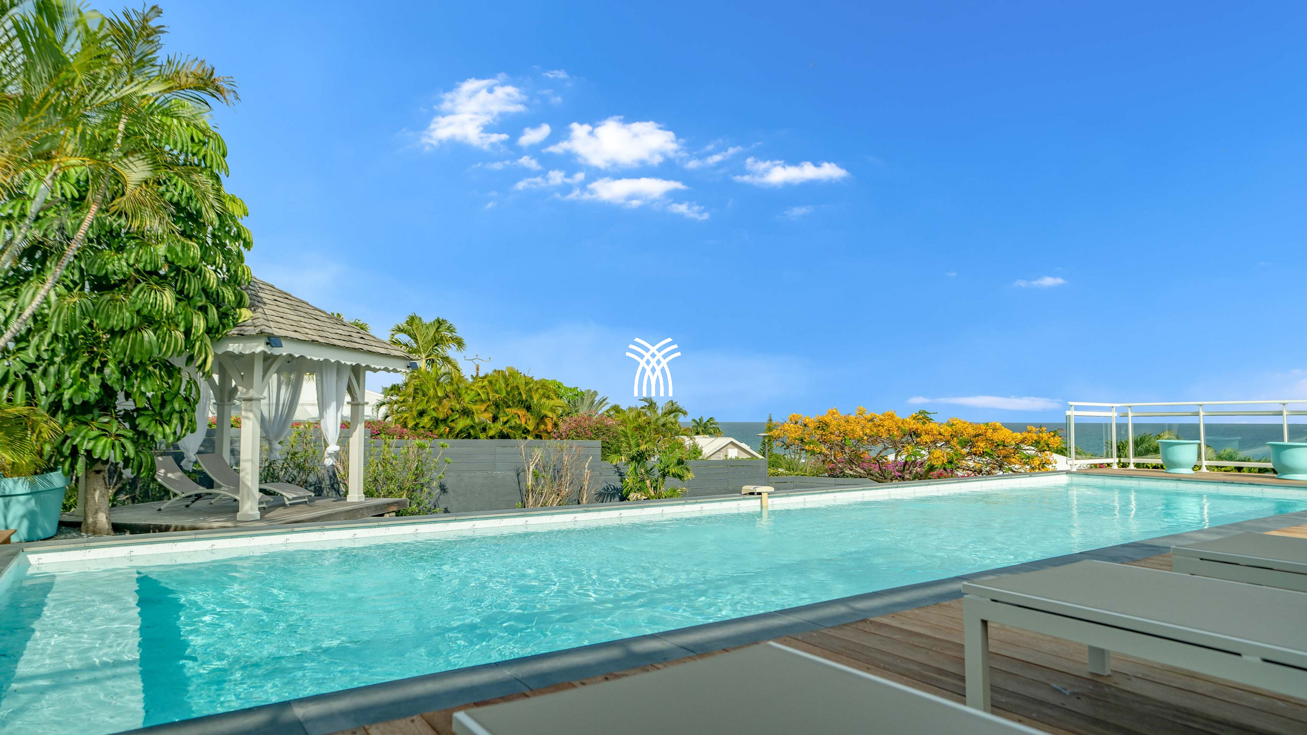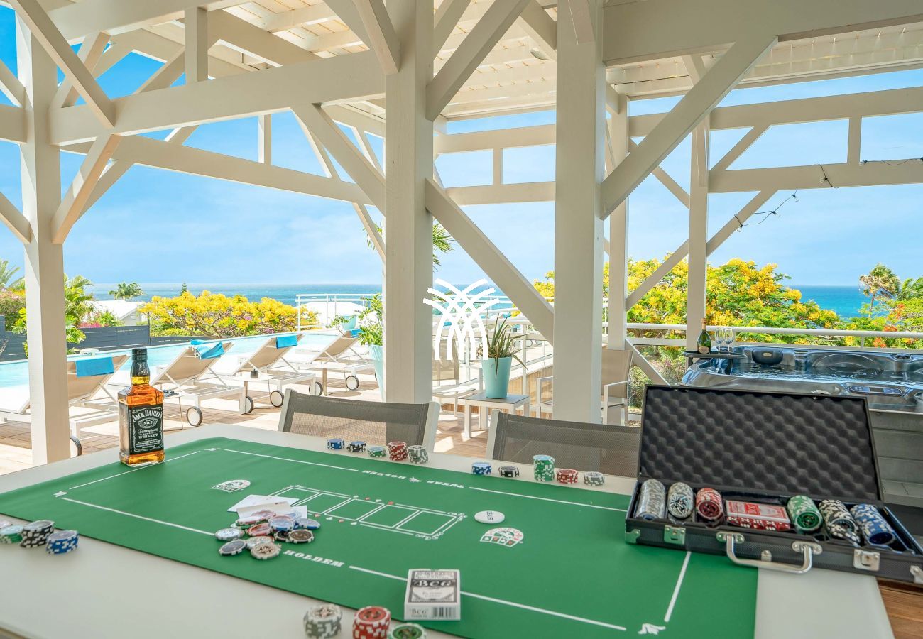 À l'extérieur, la villa dévoile un véritable havre de paix avec ses trois piscines, dont une à débordement avec une vue imprenable sur l’océan. Imaginez-vous commencer vos journées face à une vue spectaculaire à 180° sur Marie-Galante, les Saintes et la Basse-Terre, ou vous détendre dans le jacuzzi en fin de journée, bercé par les alizés. Le bassin pour enfants garantit également des moments de jeu en toute sécurité pour les plus jeunes, tandis que le terrain de pétanque promet des instants conviviaux sous le soleil antillais.