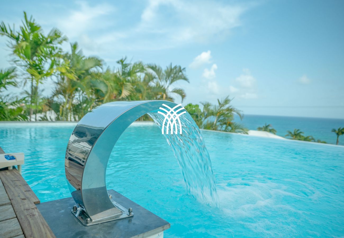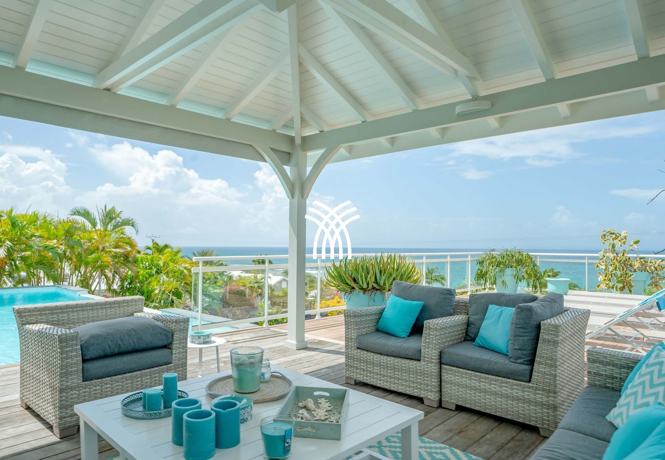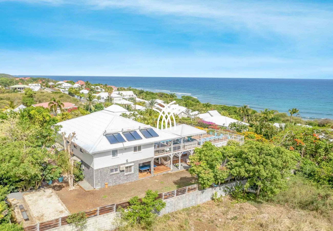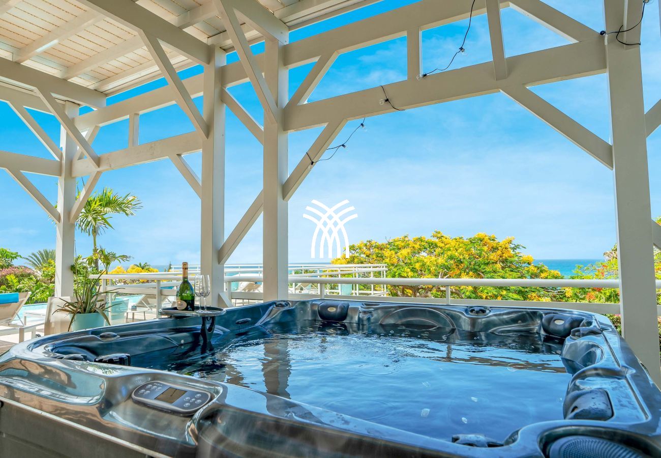 À l'extérieur, la villa dévoile un véritable havre de paix avec ses trois piscines, dont une à débordement avec une vue imprenable sur l’océan. Imaginez-vous commencer vos journées face à une vue spectaculaire à 180° sur Marie-Galante, les Saintes et la Basse-Terre, ou vous détendre dans le jacuzzi en fin de journée, bercé par les alizés. Le bassin pour enfants garantit également des moments de jeu en toute sécurité pour les plus jeunes, tandis que le terrain de pétanque promet des instants conviviaux sous le soleil antillais.