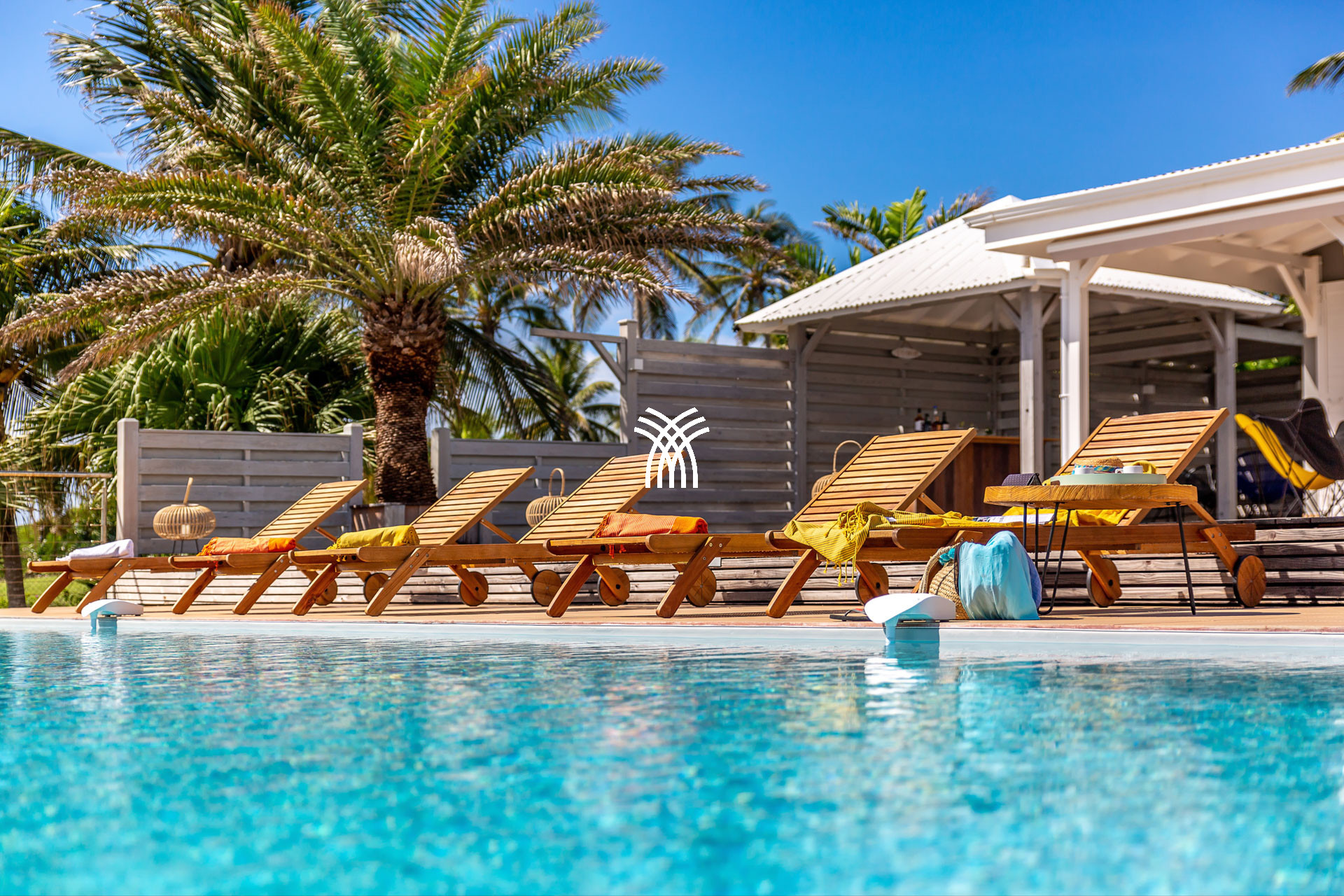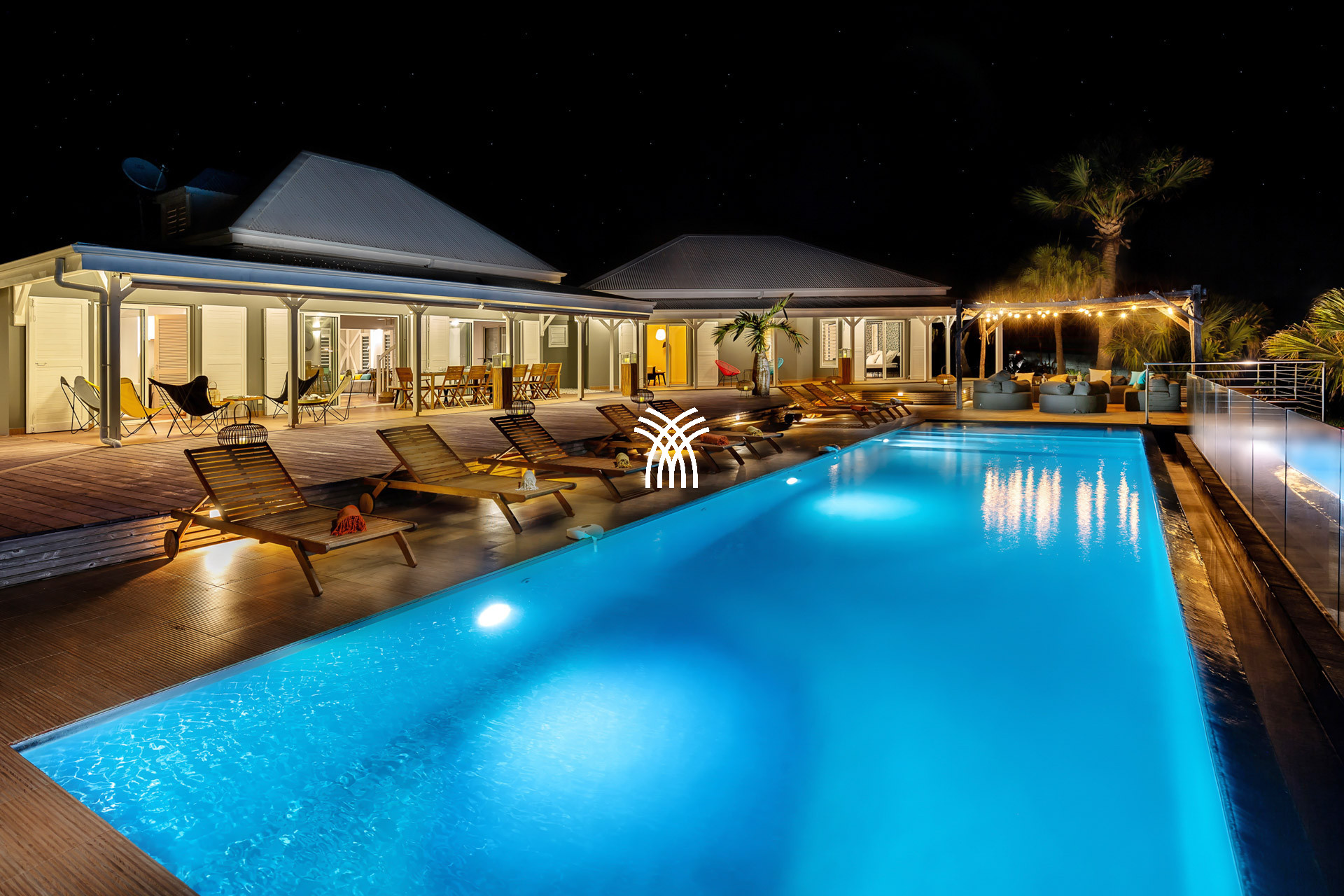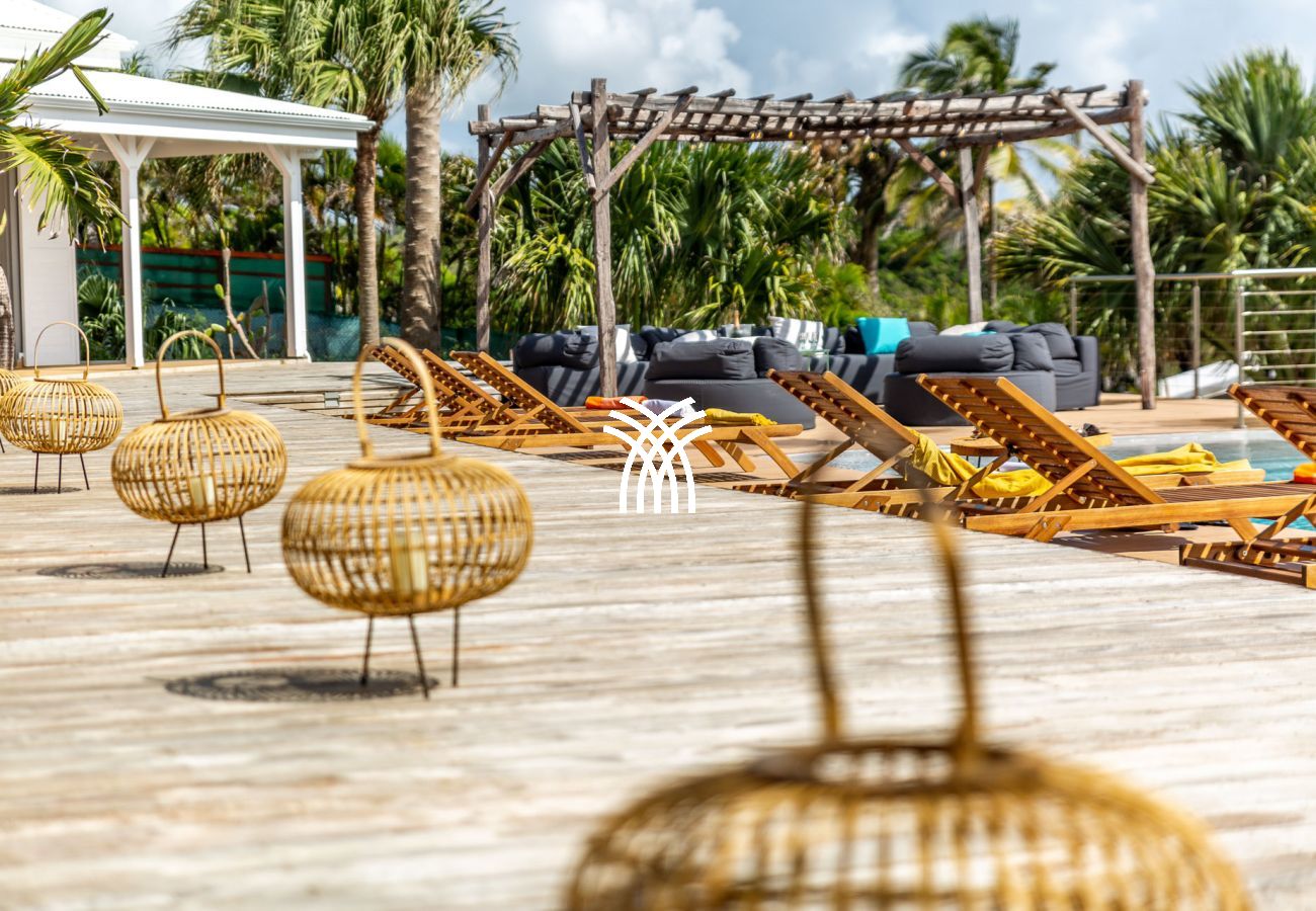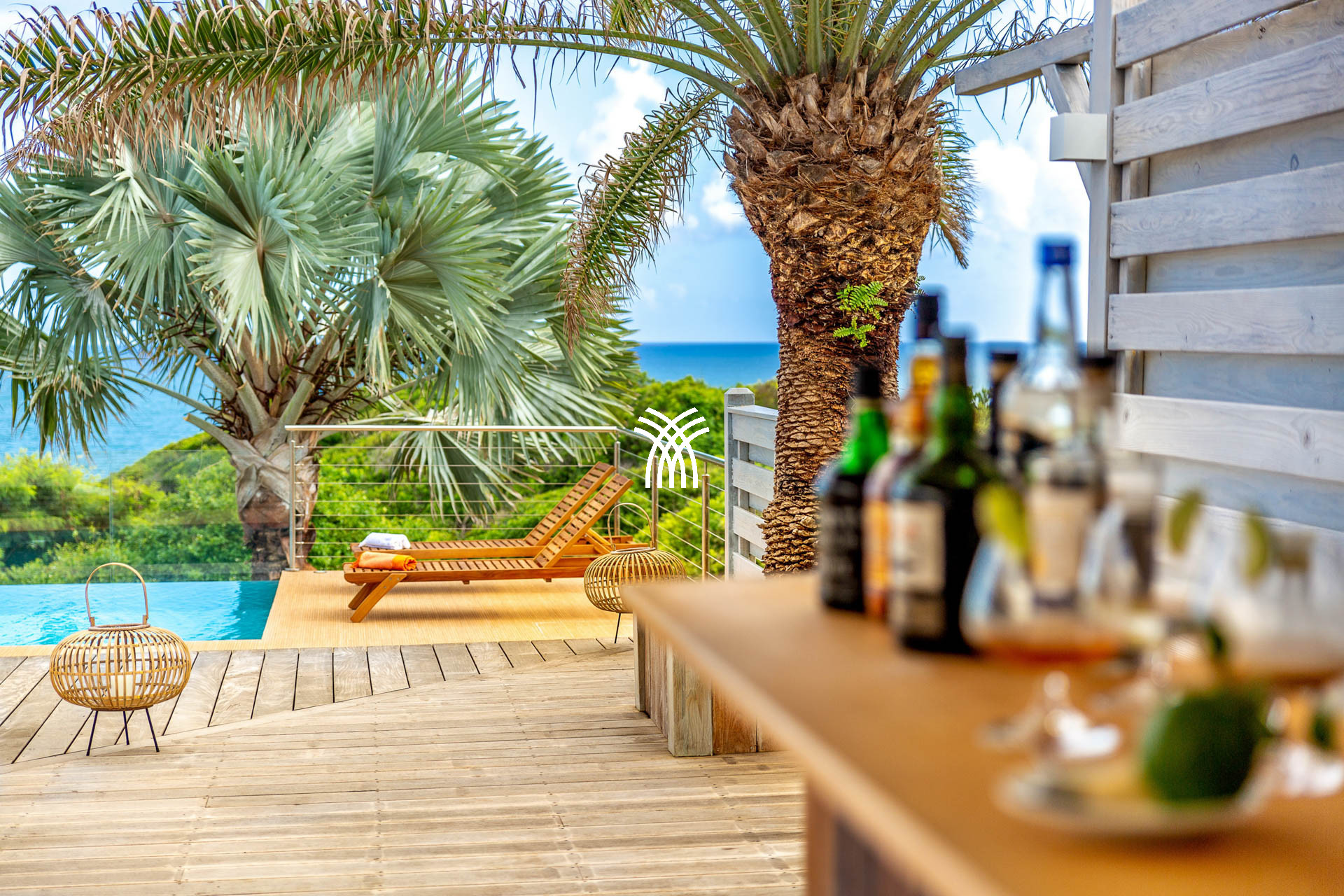 L’extérieur est un véritable havre de paix avec ses 400 m² de terrasse aménagée pour le farniente et la convivialité. Plusieurs espaces lounge permettent de se relaxer à l’ombre ou au soleil, tandis que le bar extérieur et les nombreux transats offrent un cadre idyllique face à la piscine scintillante. Entre charme créole et prestations haut de gamme, la Villa Flibustier est la promesse d’un séjour inoubliable à Sainte-Anne.