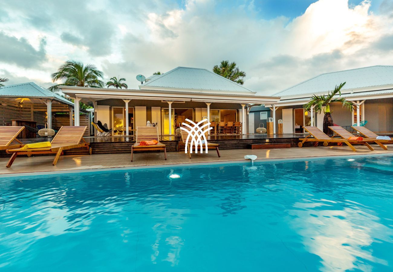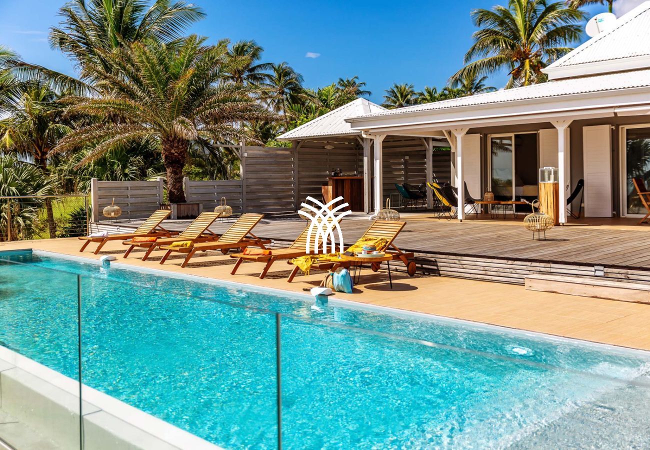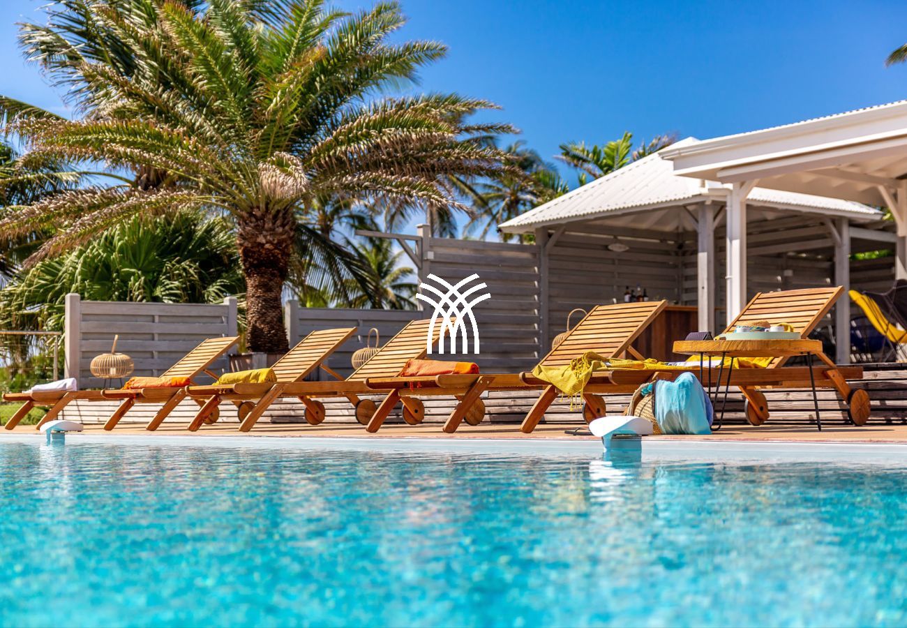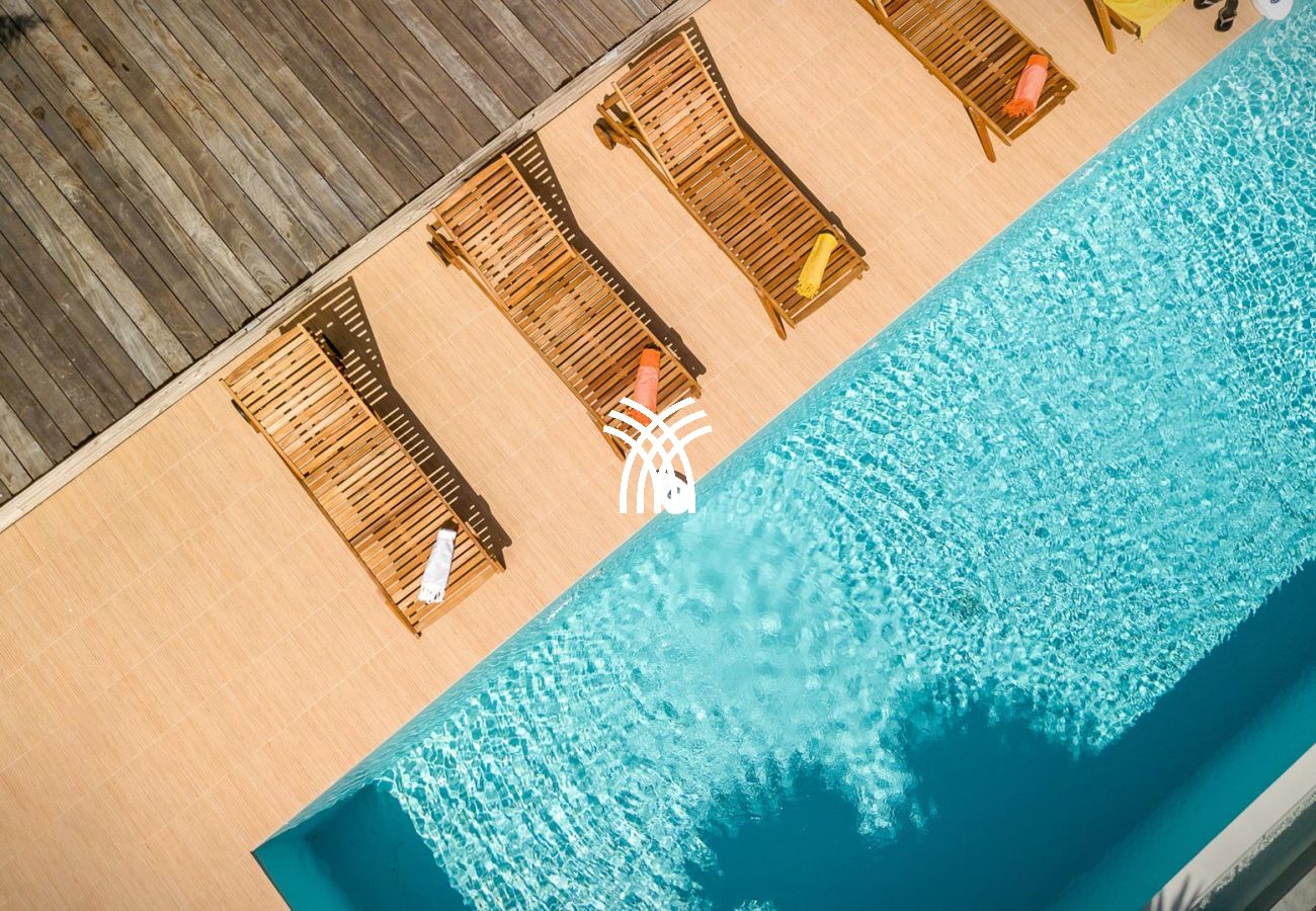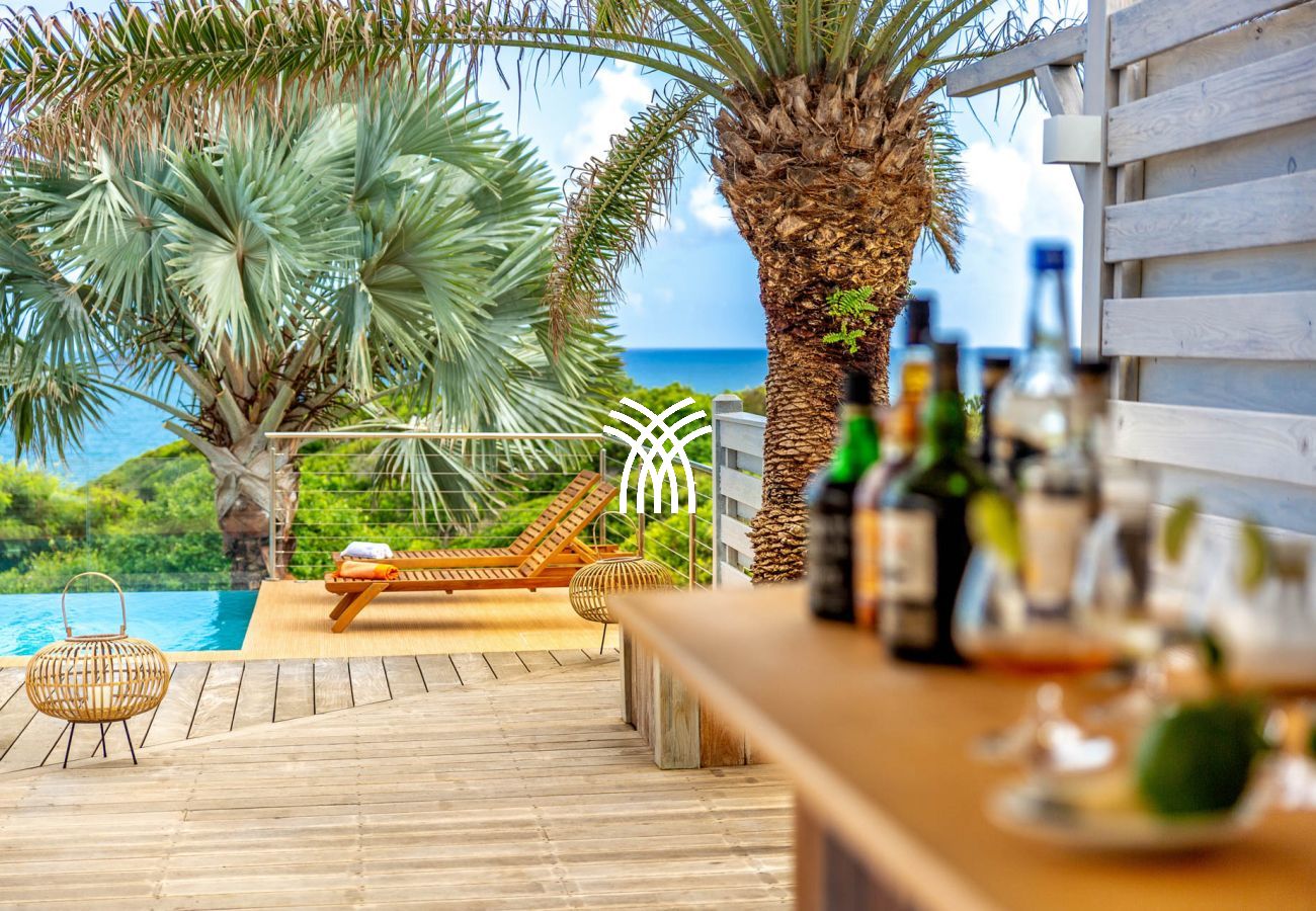 L’extérieur est un véritable havre de paix avec ses 400 m² de terrasse aménagée pour le farniente et la convivialité. Plusieurs espaces lounge permettent de se relaxer à l’ombre ou au soleil, tandis que le bar extérieur et les nombreux transats offrent un cadre idyllique face à la piscine scintillante. Entre charme créole et prestations haut de gamme, la Villa Flibustier est la promesse d’un séjour inoubliable à Sainte-Anne.