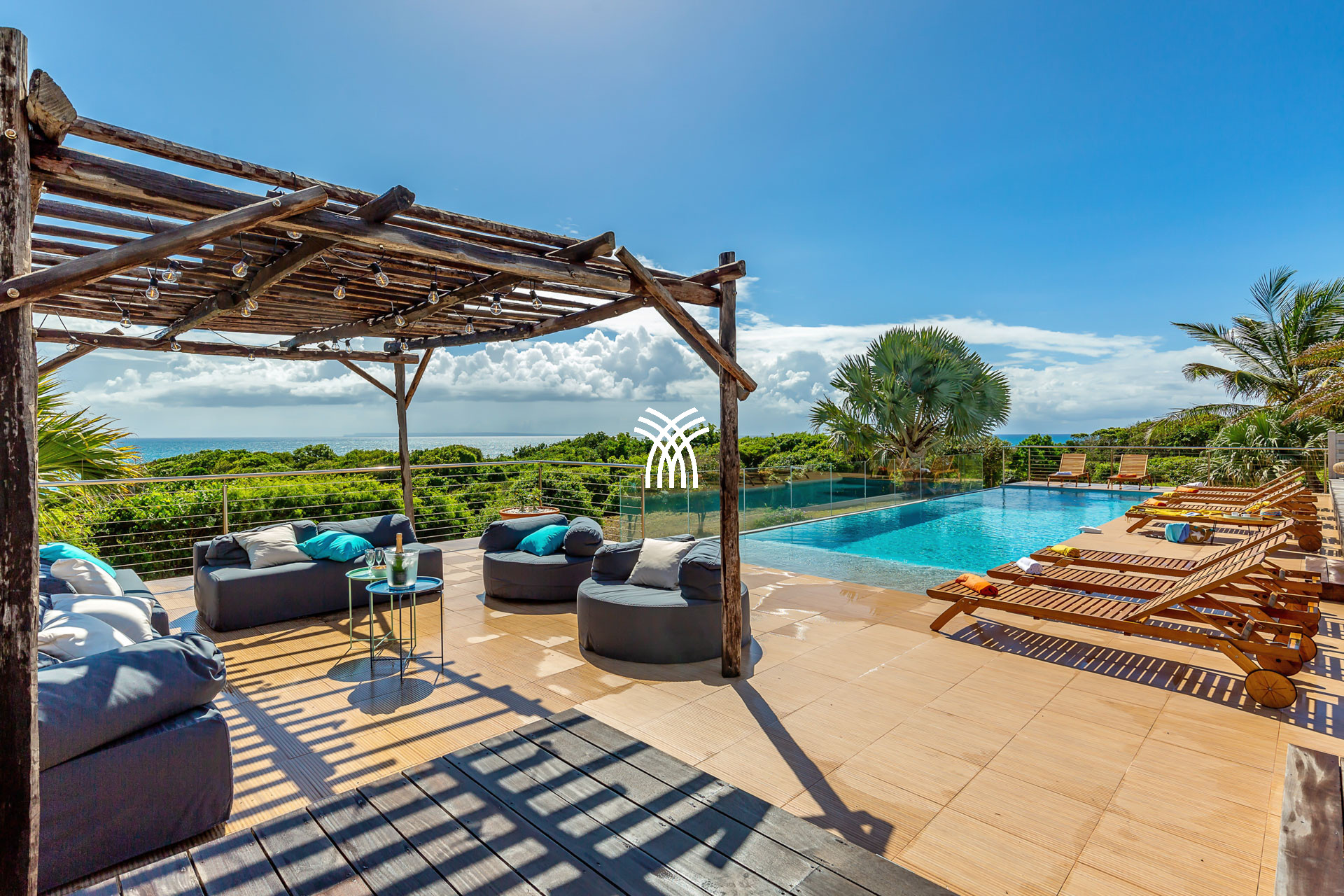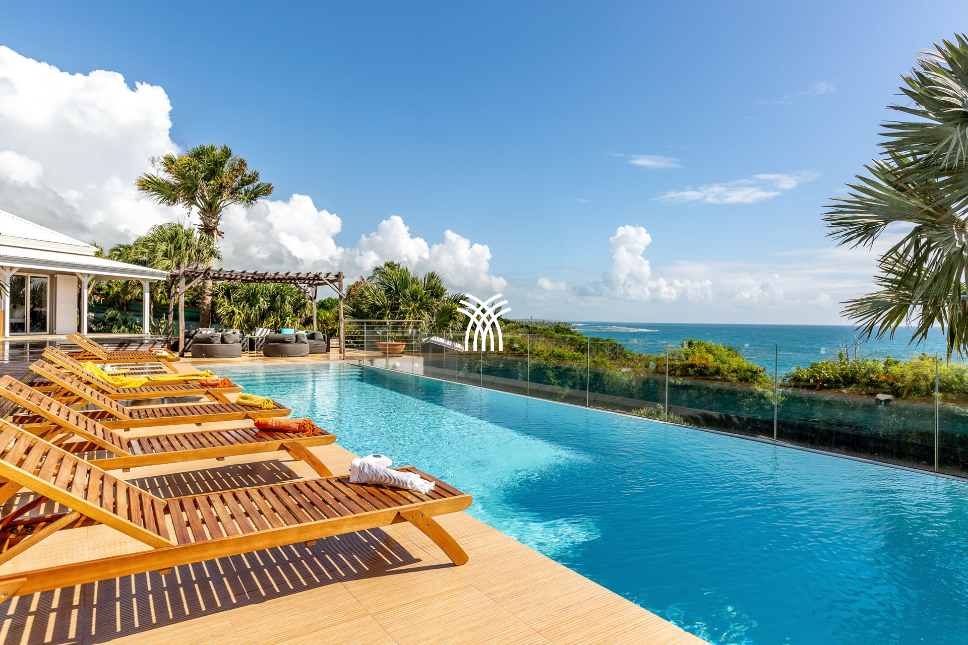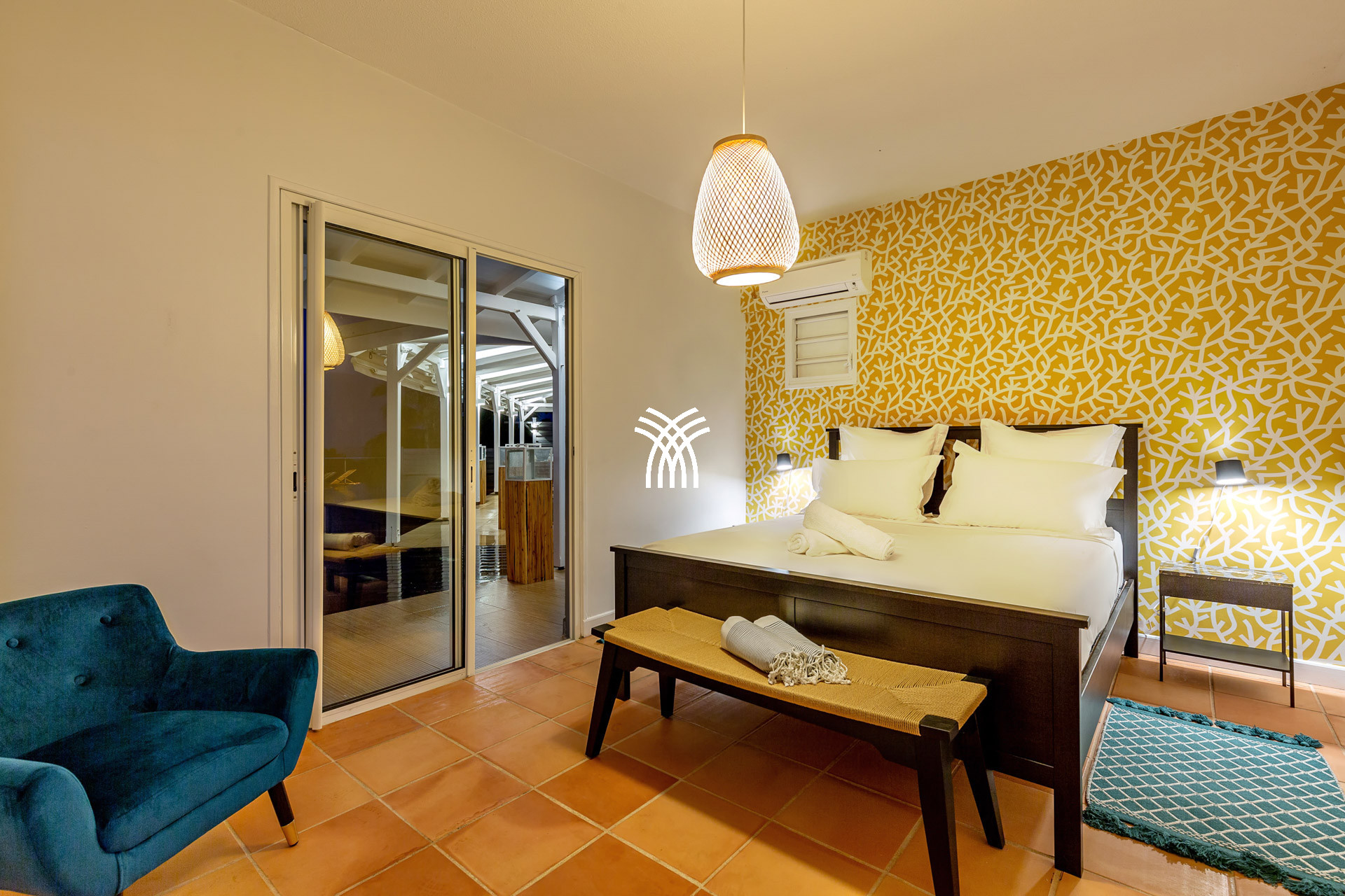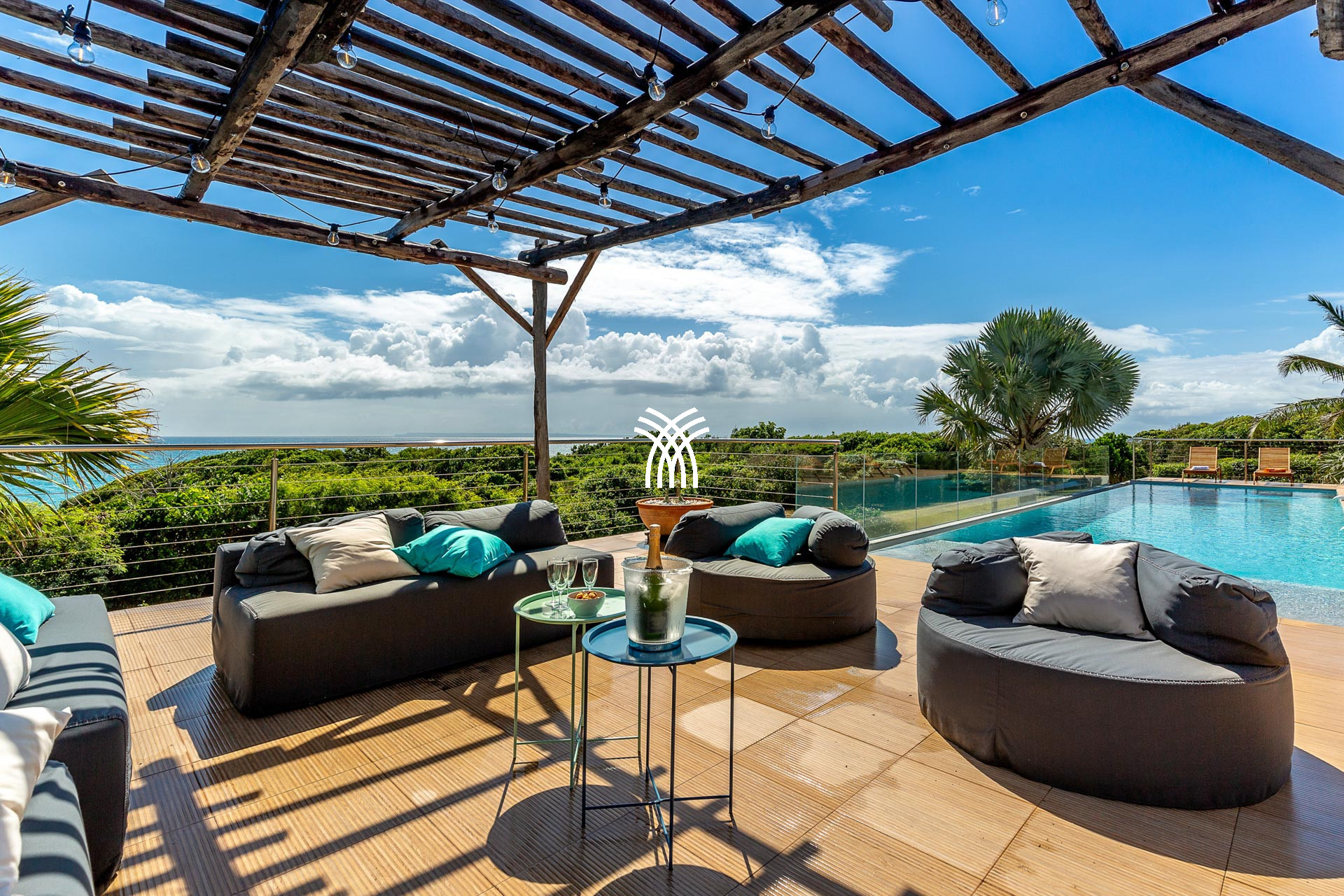 L’extérieur est un véritable havre de paix avec ses 400 m² de terrasse aménagée pour le farniente et la convivialité. Plusieurs espaces lounge permettent de se relaxer à l’ombre ou au soleil, tandis que le bar extérieur et les nombreux transats offrent un cadre idyllique face à la piscine scintillante. Entre charme créole et prestations haut de gamme, la Villa Flibustier est la promesse d’un séjour inoubliable à Sainte-Anne.