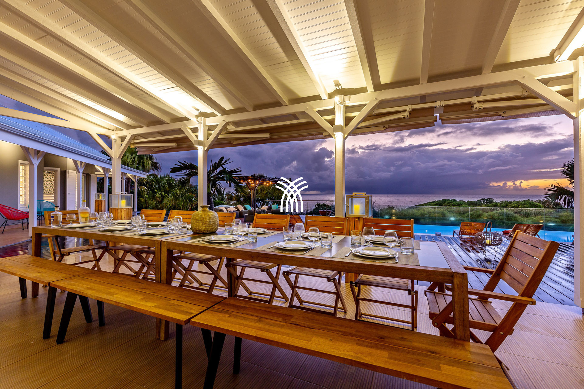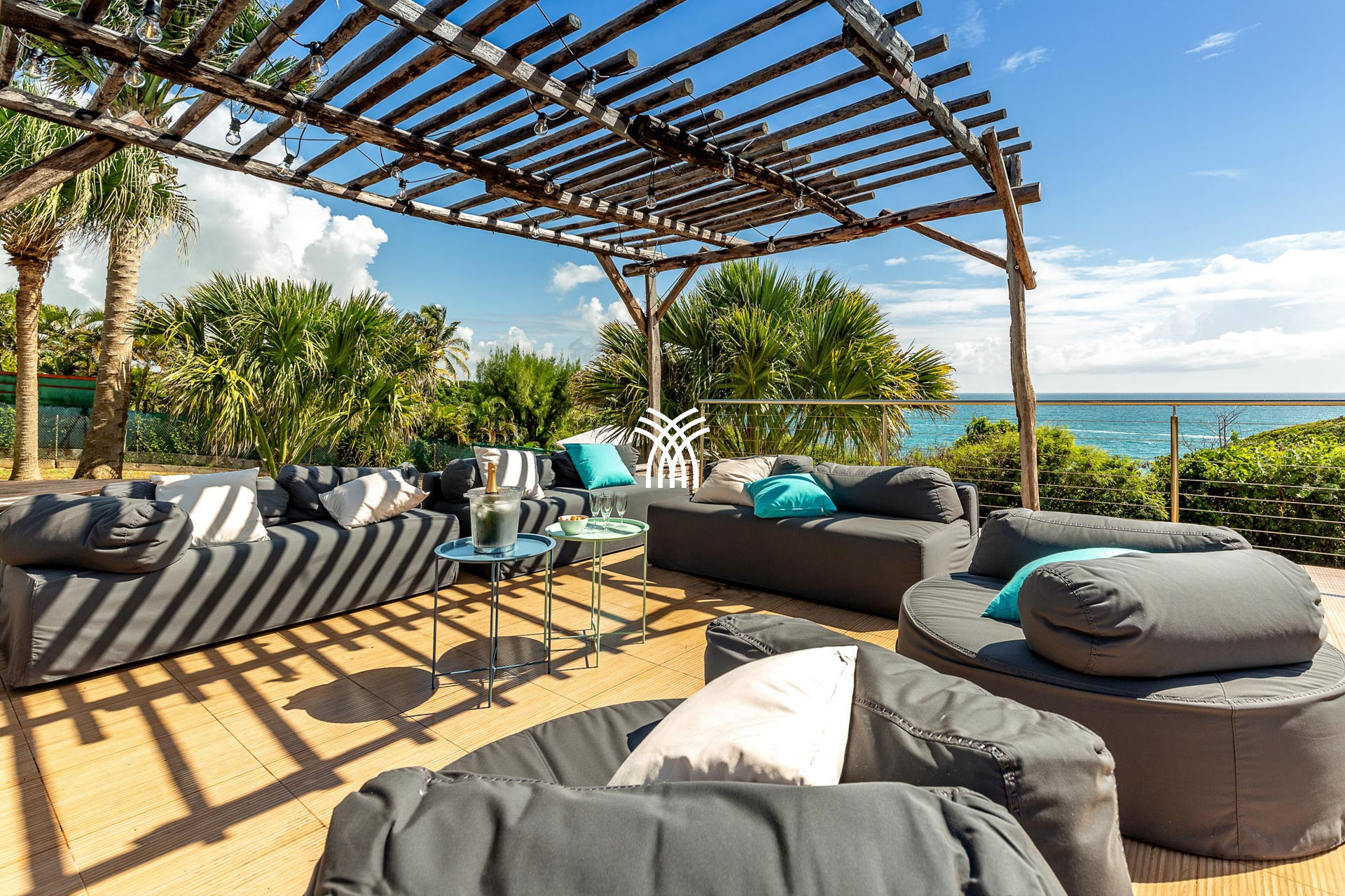 Les extérieurs de la Villa Coco Kafé sont un véritable paradis pour se détendre. Depuis la terrasse, admirez une vue imprenable sur la mer tout en vous relaxant sur les transats ou dans le canapé sous le carbet, un espace propice aux moments de convivialité ou de sérénité absolue. Chaque coucher de soleil devient un spectacle naturel inoubliable.