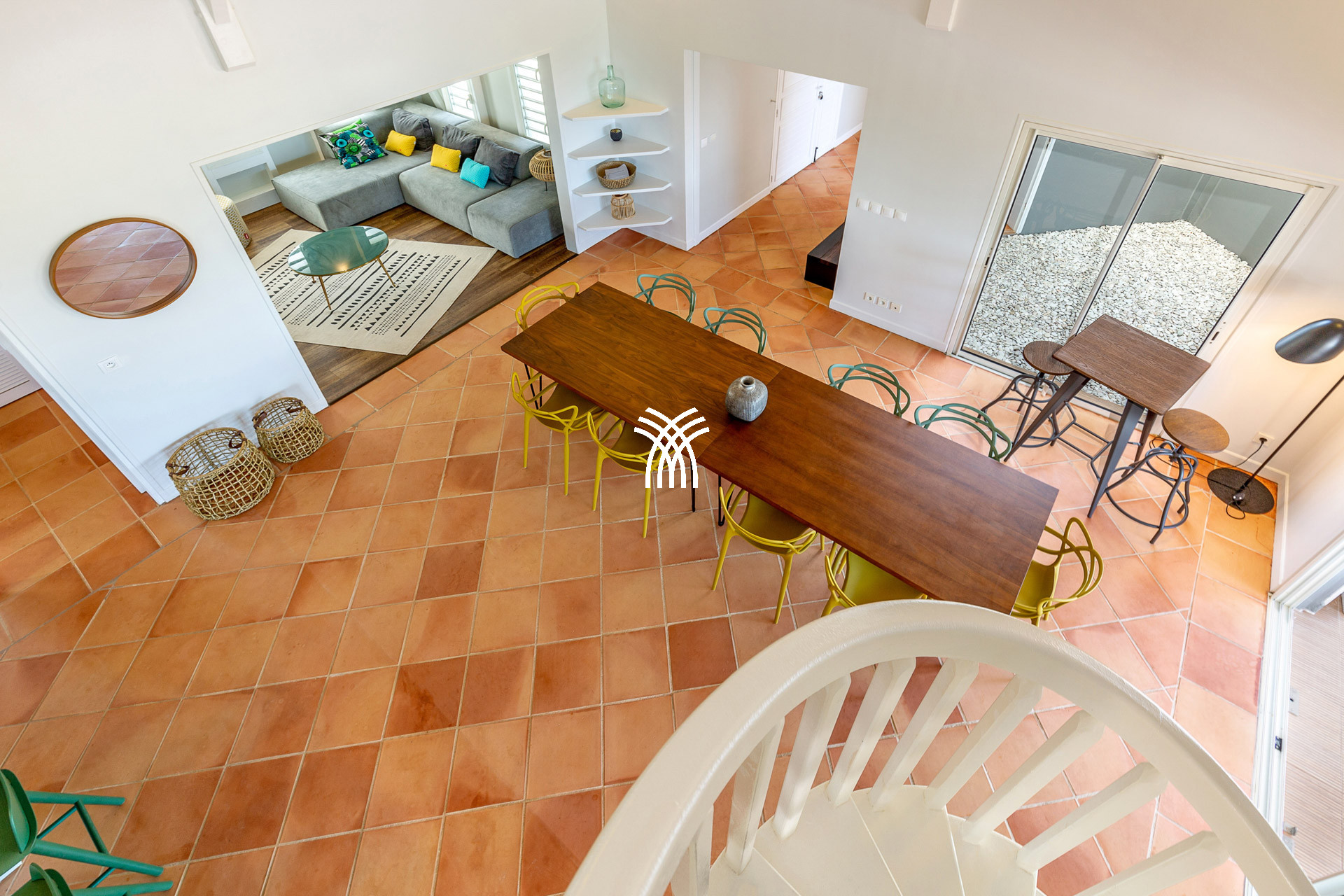L’espace de vie principal s’ouvre majestueusement sur l’extérieur, laissant entrer la lumière naturelle et l’air marin. Le vaste salon, décoré avec soin, invite à la détente, tandis que la cuisine américaine entièrement équipée donne sur une grande table conviviale, parfaite pour des repas en famille ou entre amis. Une buanderie pratique complète les équipements avec lave-linge, sèche-linge et fer à repasser.