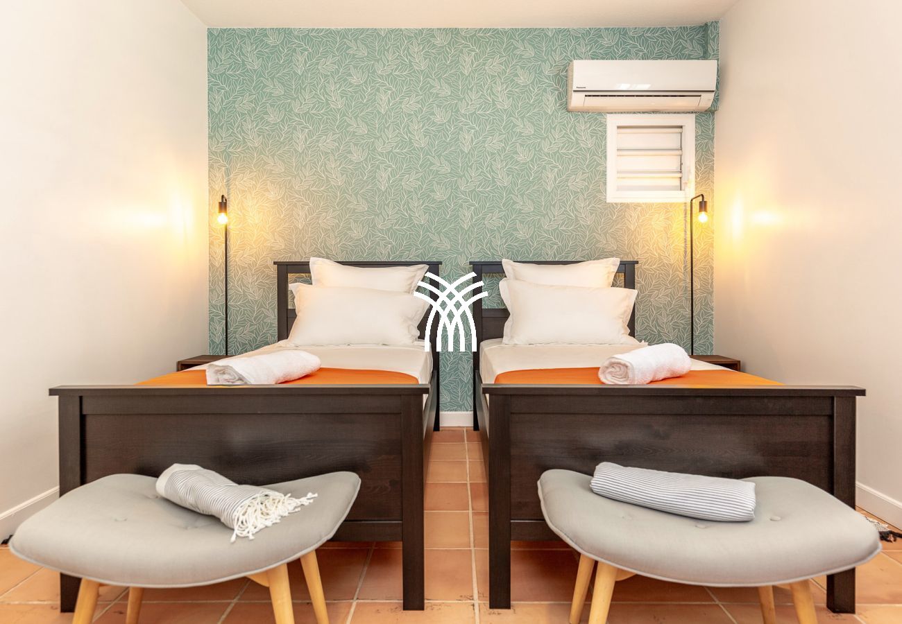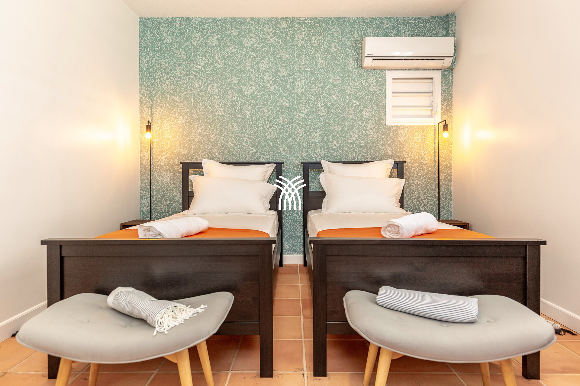 Lits Twin de 100cm (pouvant être joints) + lit simple, air conditionné, dressing, salle de bains avec douche attenante