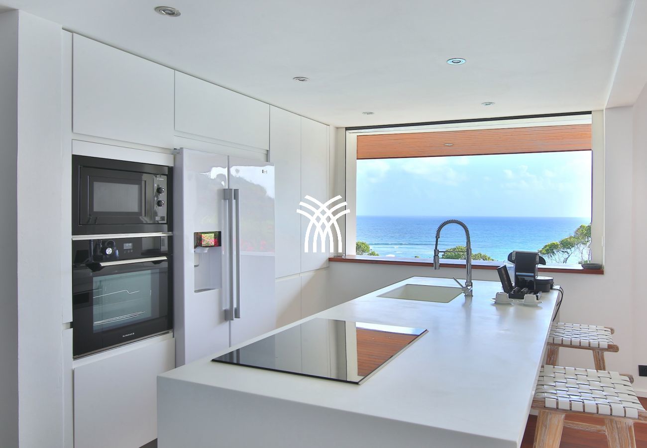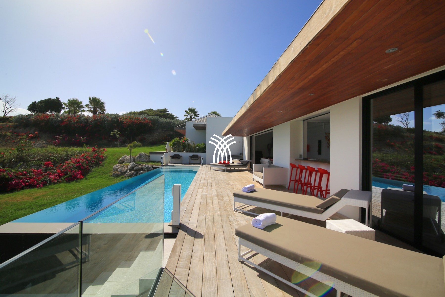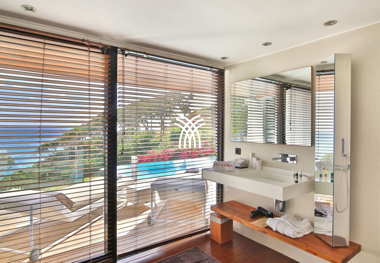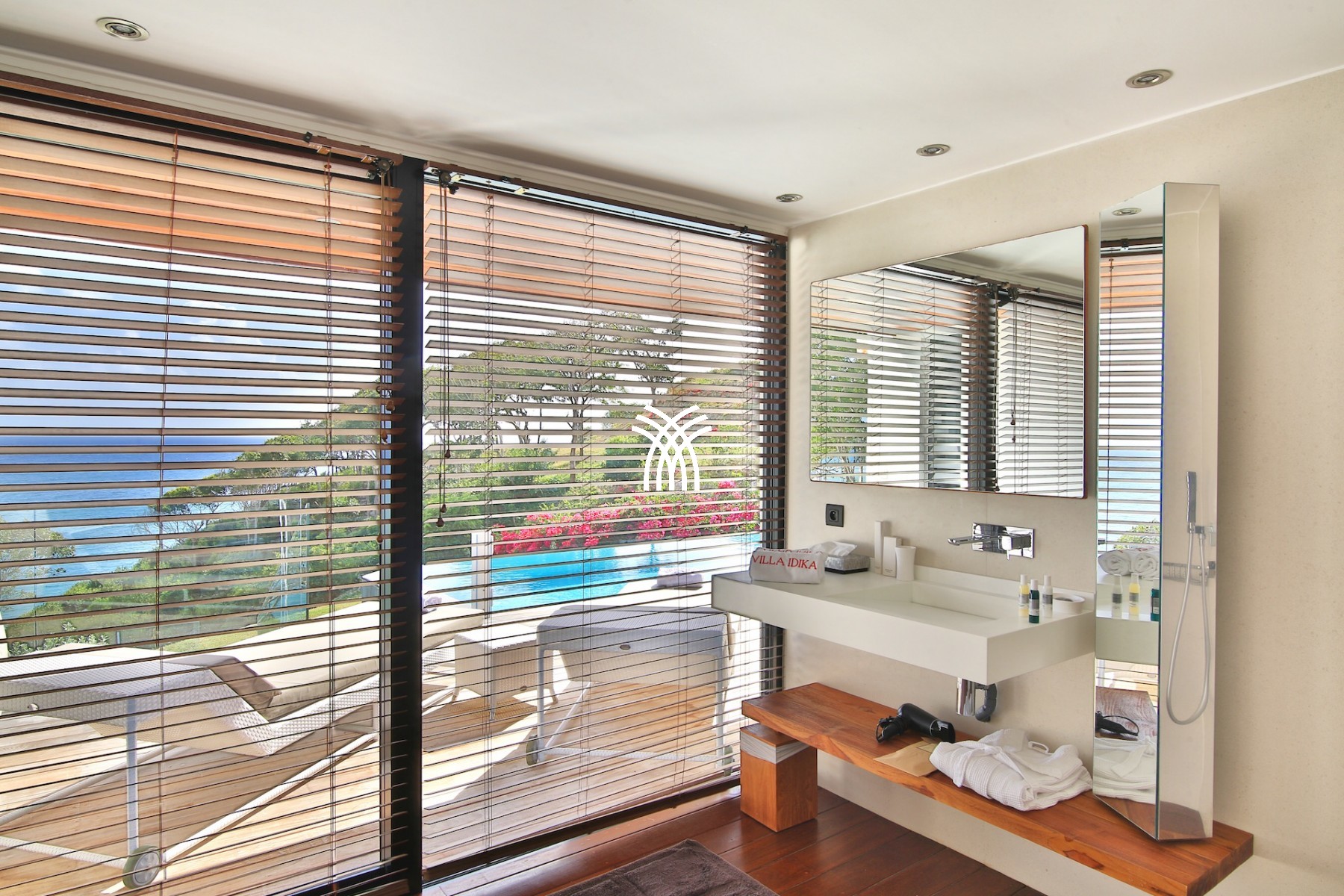 Le calme est partout, l'air circule à travers les hautes jalousies. Où que l’on soit, le regard est constamment attiré par le bleu clair de la piscine et celui plus profond de la mer.