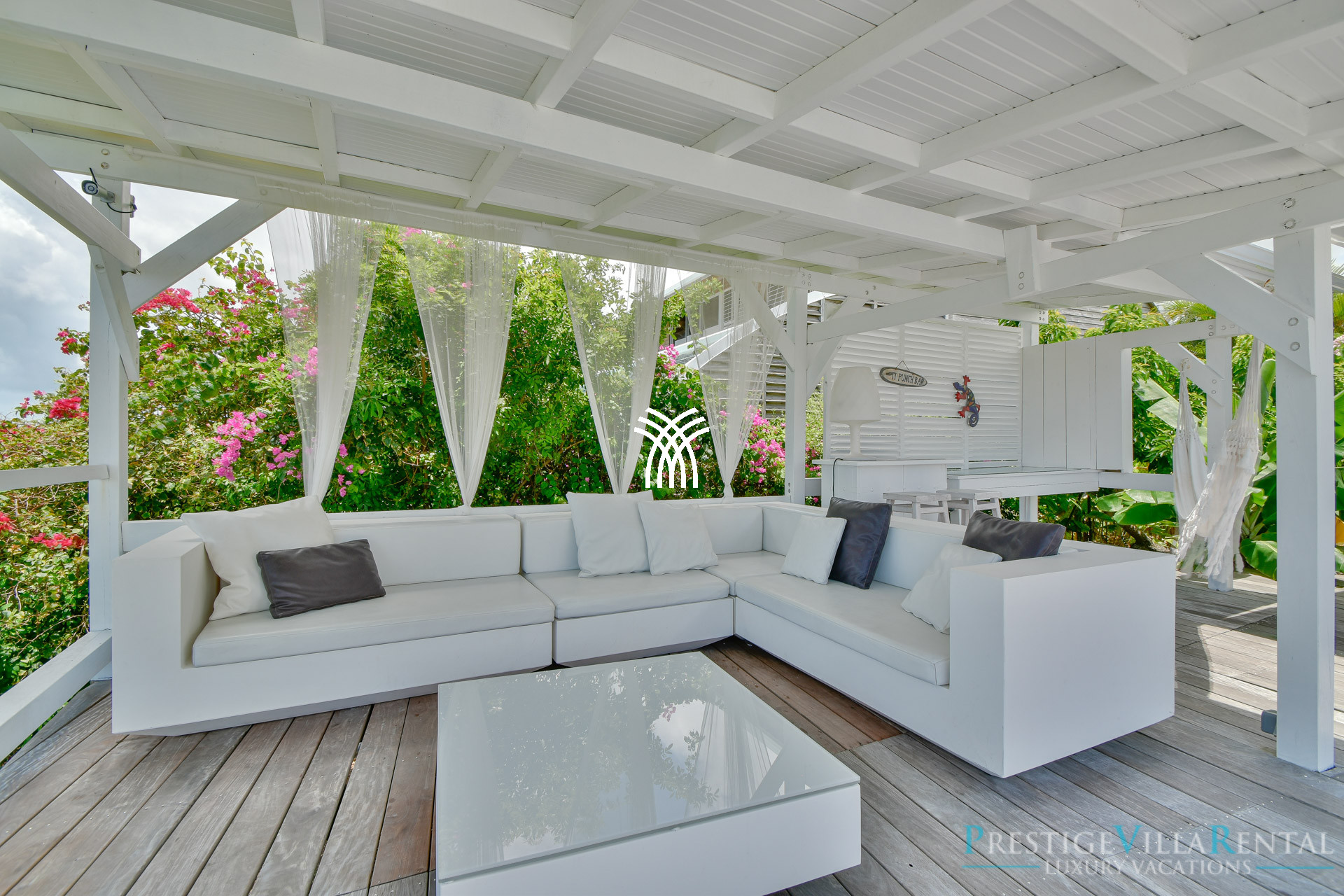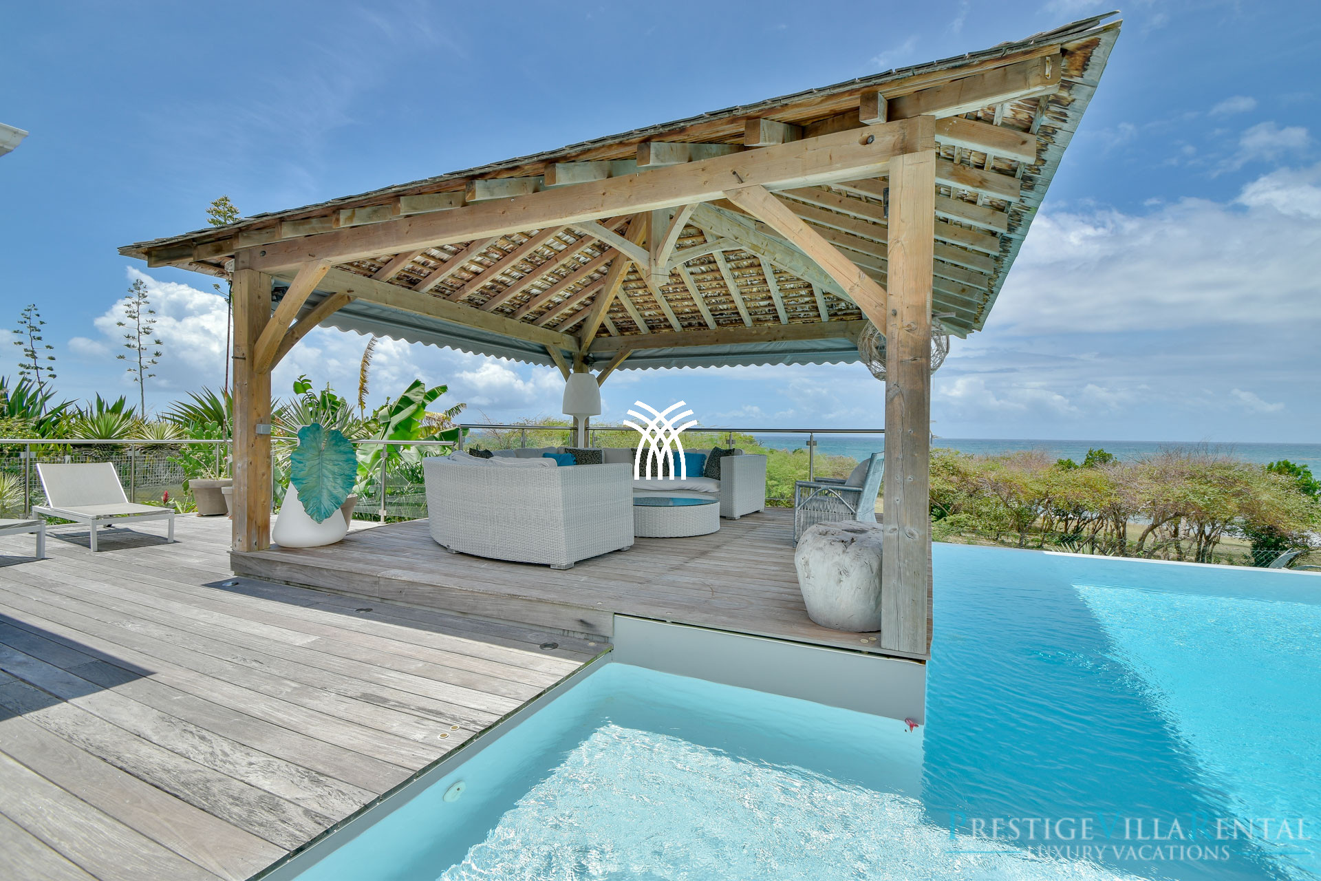 La terrasse en teck de 170 m², tel un immense pont de bateau est une invitation au farniente : se prélasser autour de la piscine, profiter du spa au soleil couchant, prendre un verre à l’ombre de la pergola…