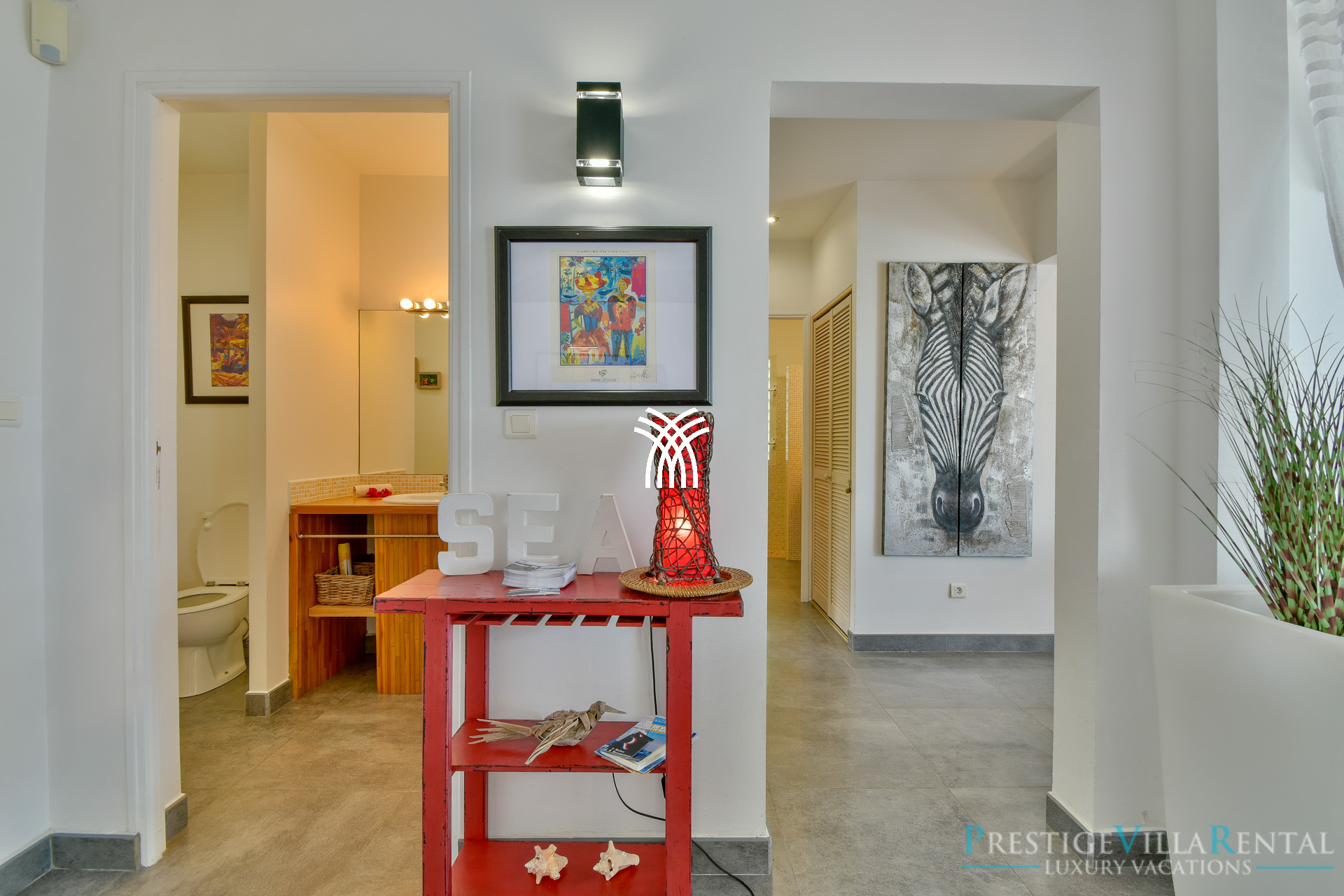 Le calme est partout, l'air circule à travers les hautes jalousies. Où que l’on soit, le regard est constamment attiré par le bleu clair de la piscine et celui plus profond de la mer.
