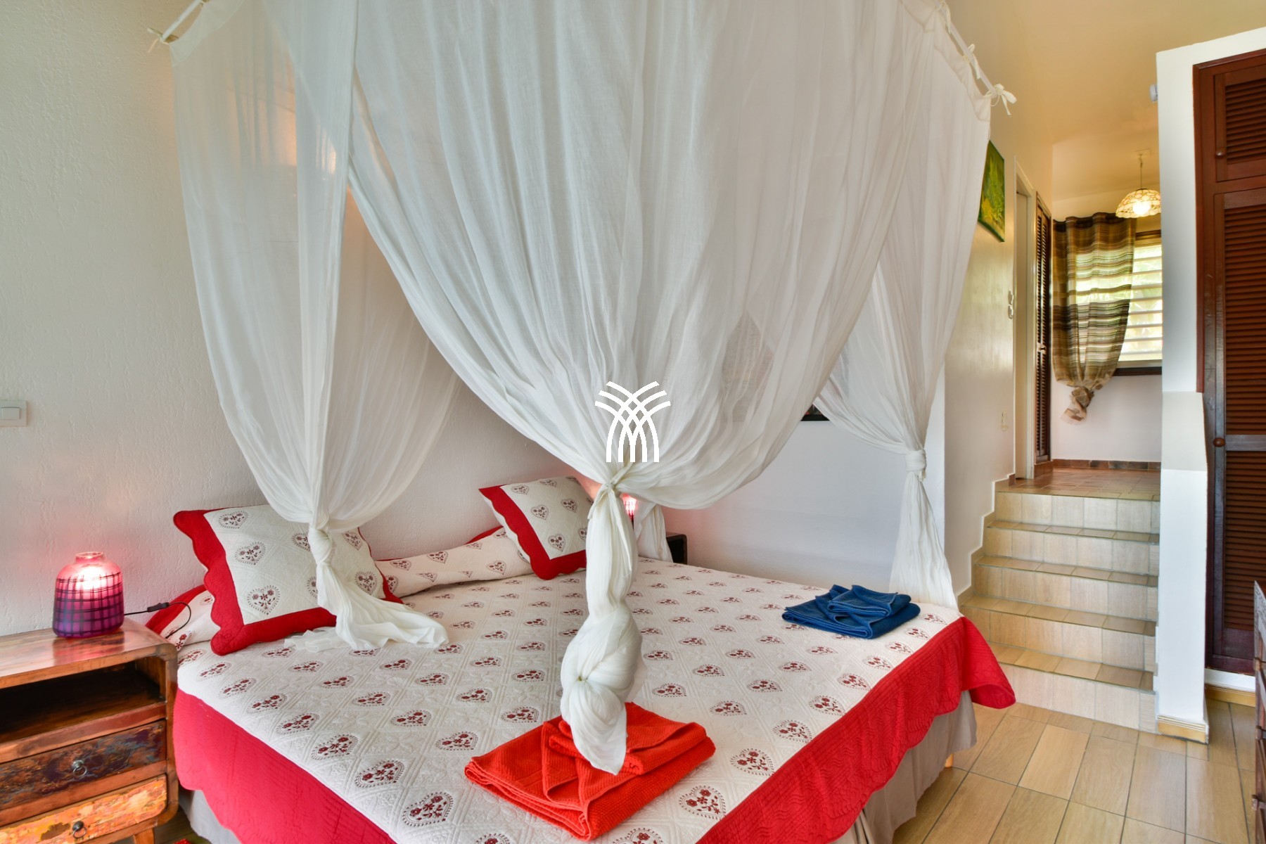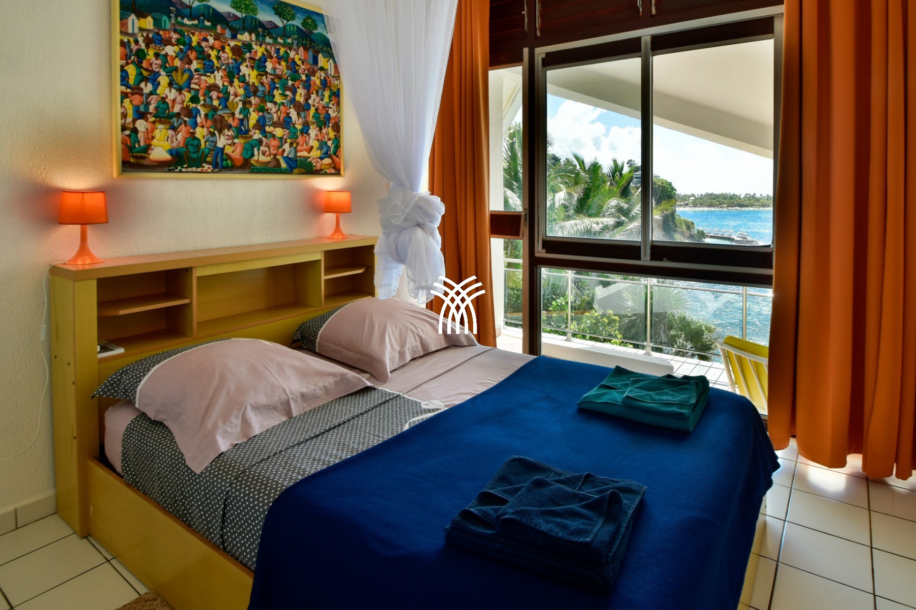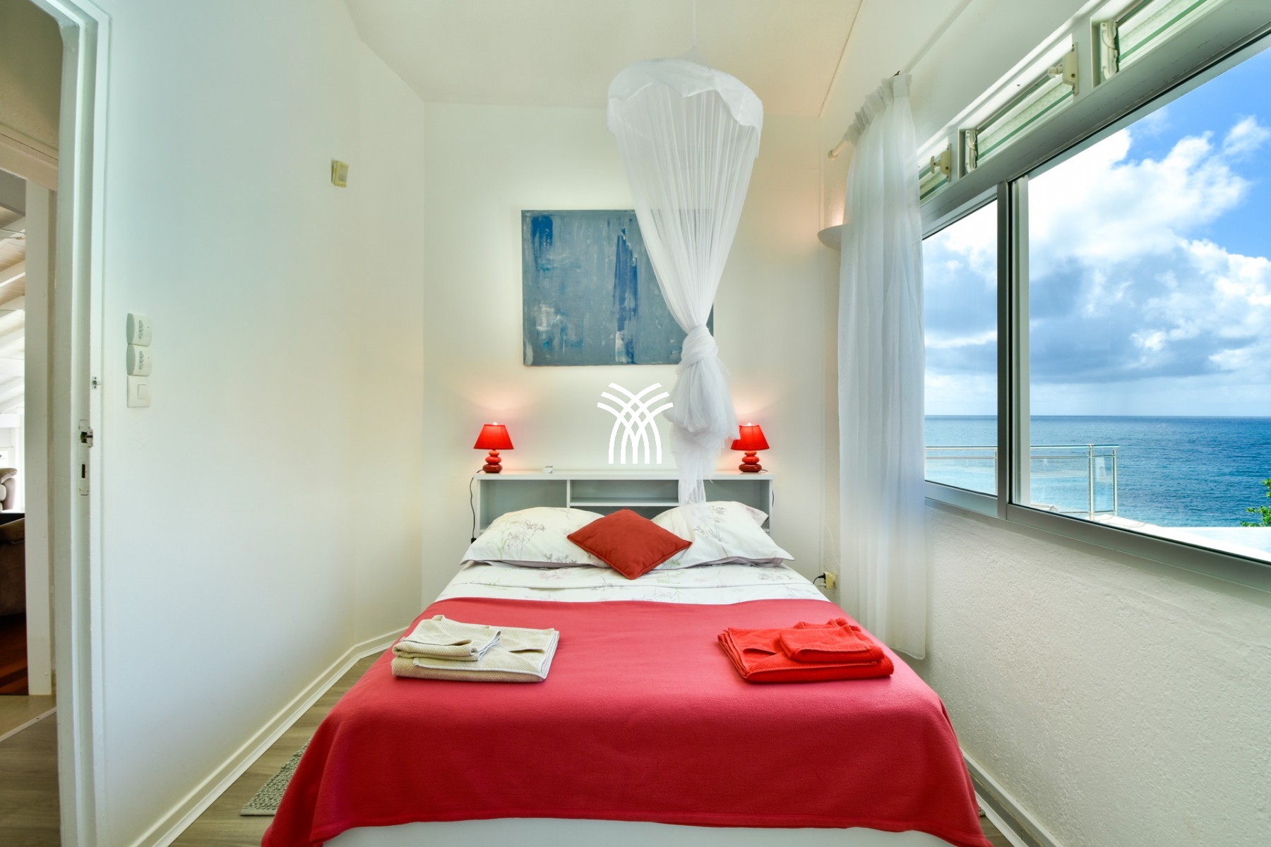 Lit queen size (160 x 200 cm), air-conditionné, moustiquaire, salle de bain avec baignoire et WC partagée avec chambre 2, vue mer