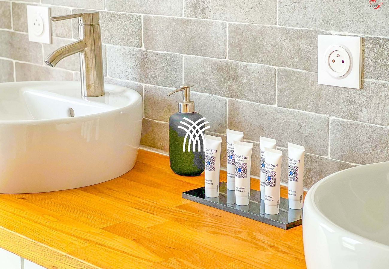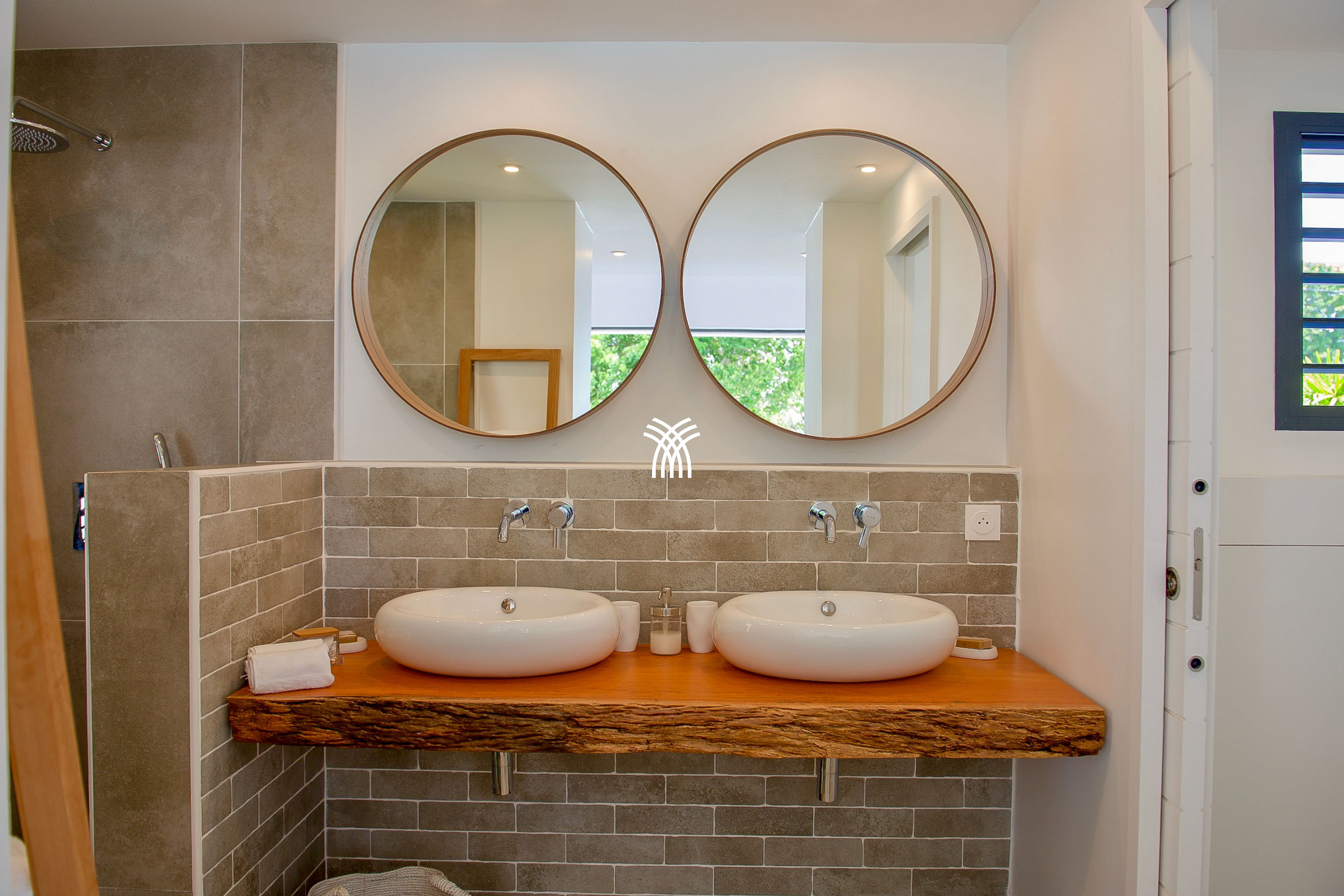 L’aile gauche accueille deux chambres climatisées partageant une salle de bain élégante et spacieuse.