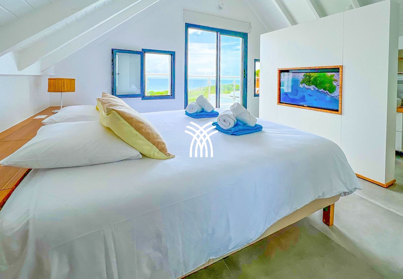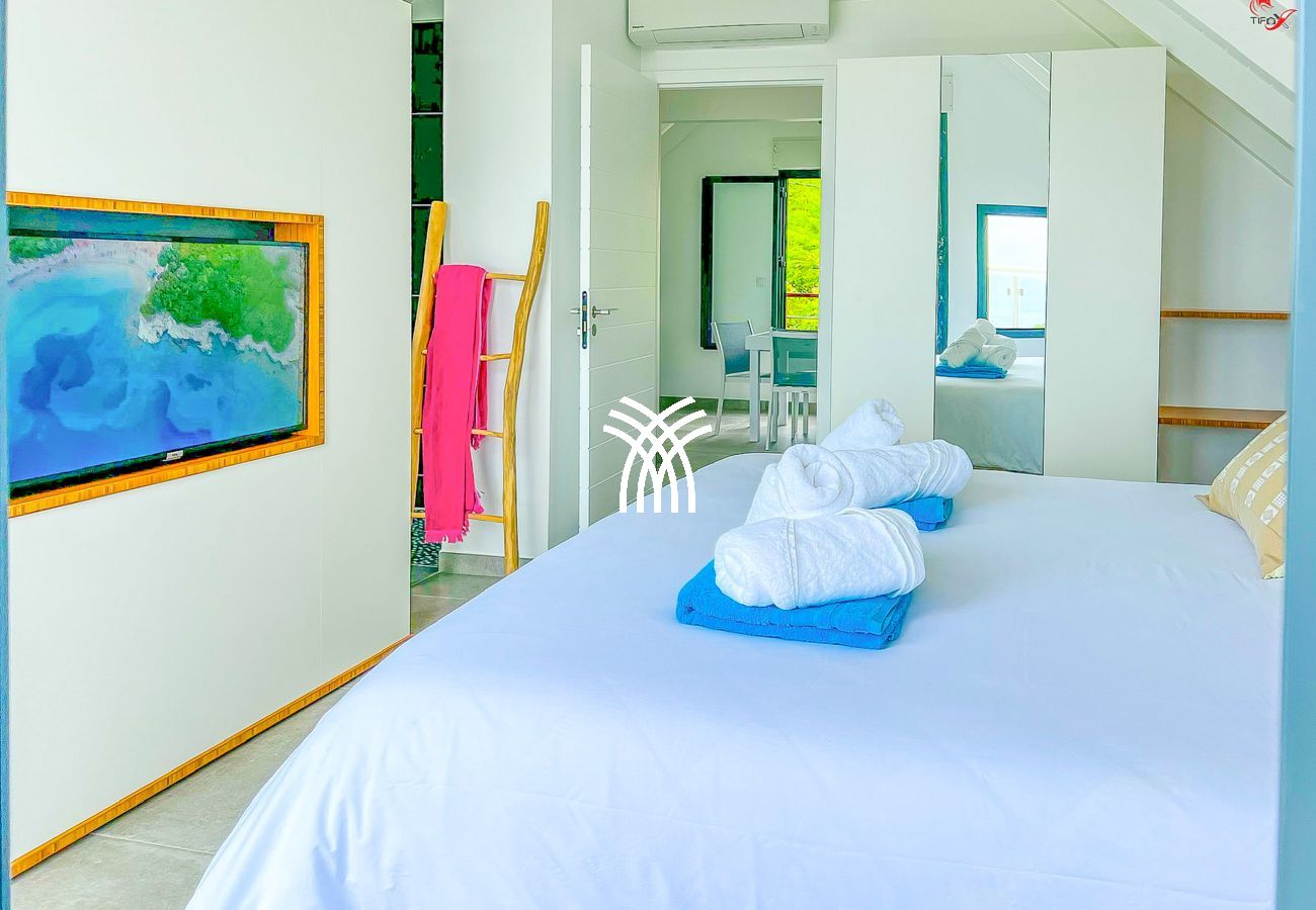 Lit queen size (160 x 200m) avec moustiquaire, air-conditionné, salle d'eau avec douche, dressing, bureau, accès balcon avec vue mer