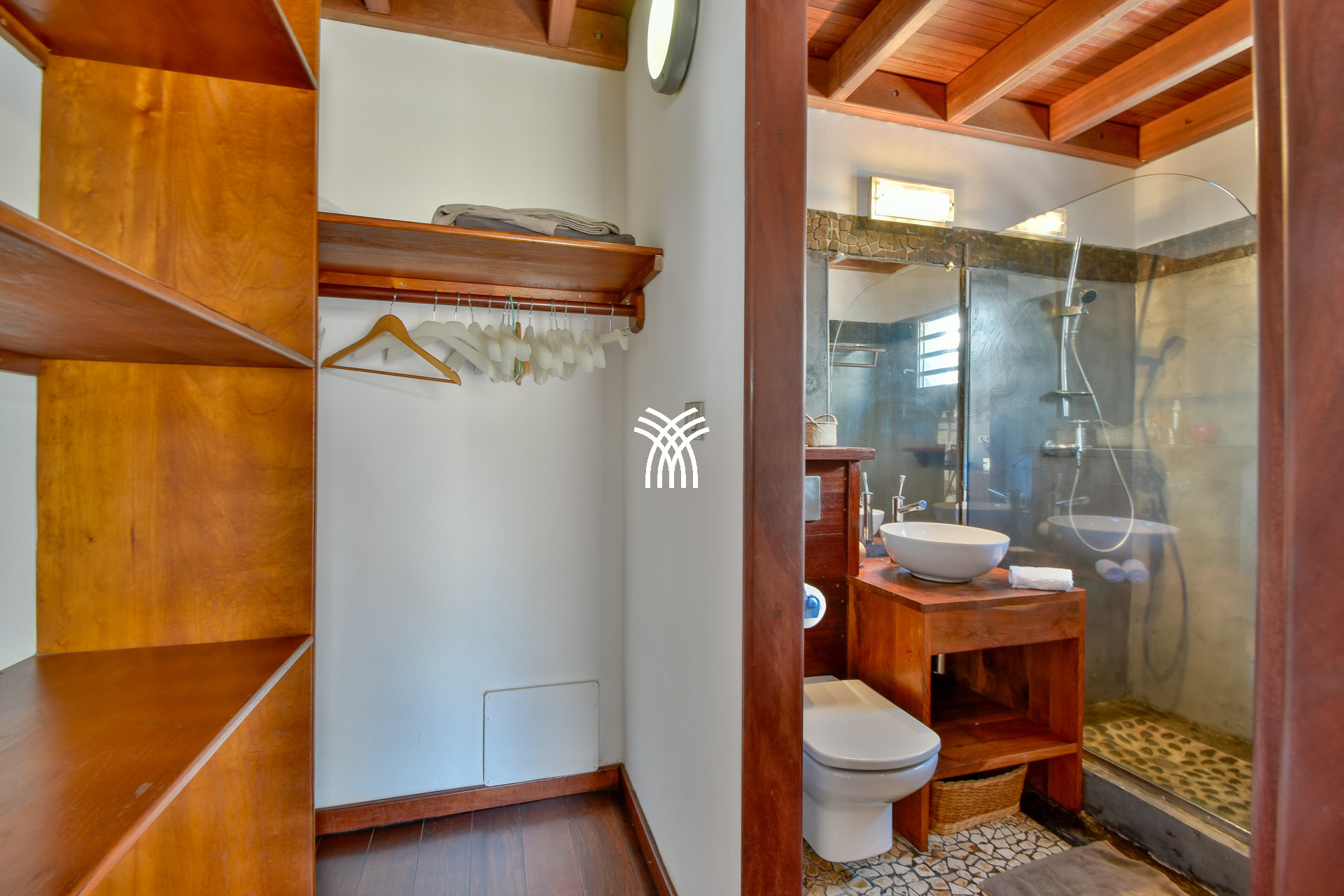 Lit queen size (160 x 200m) avec moustiquaire, 1 Banquette lit (2 matelas de 80 cm de large) adapté pour les enfants, air-conditionné, salle de bain avec douche et WC, dressing, commode