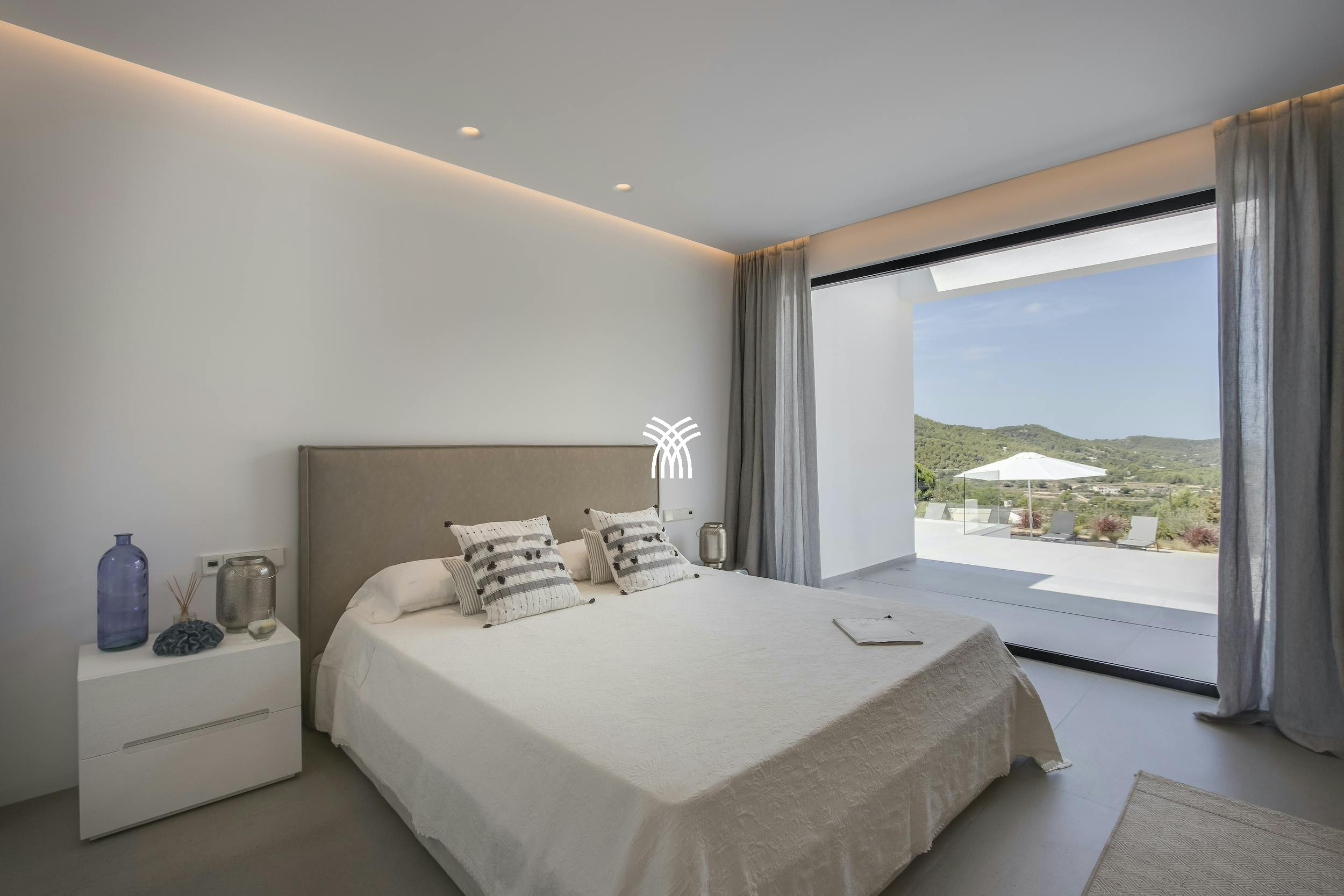 Perché en haut des collines au-dessus de KM5, cette retraite extraordinaire au sommet de la montagne offre une expérience de location de villa de luxe à Ibiza inégalée, avec des vues panoramiques s'étendant sur la côte scintillante jusqu'à Salinas, Formentera, Cala Jondal et Porroig.