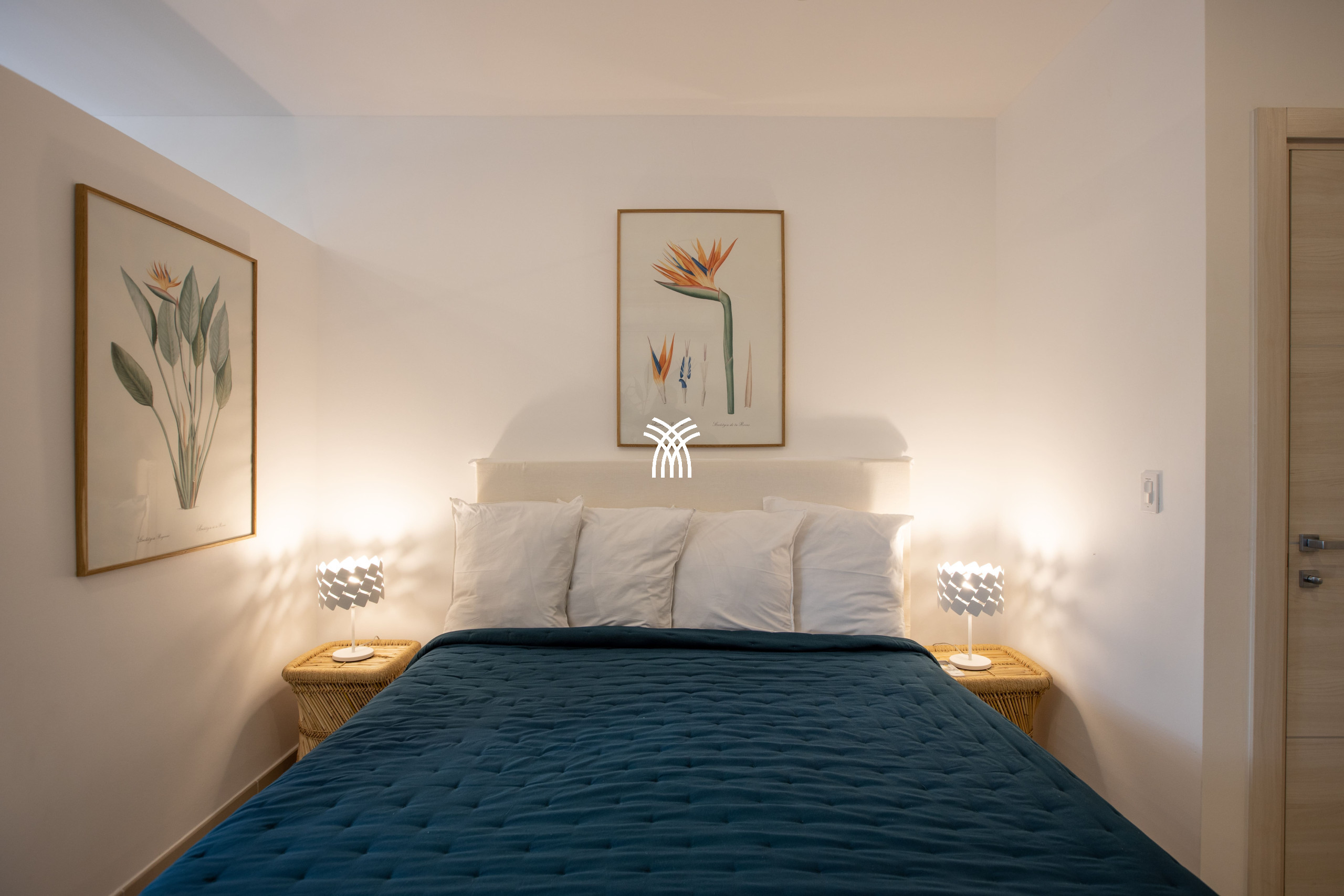 Les chambres spacieuses, équipées de lits king-size et de salles de bains attenantes, garantissent intimité et raffinement. Le vaste espace de vie baigné de lumière naturelle se compose d’un salon élégant, d’une salle à manger conviviale et d’une cuisine moderne entièrement équipée. La fluidité entre intérieur et extérieur offre une expérience immersive où le bleu éclatant de la mer se mêle harmonieusement à l’architecture épurée de la villa.