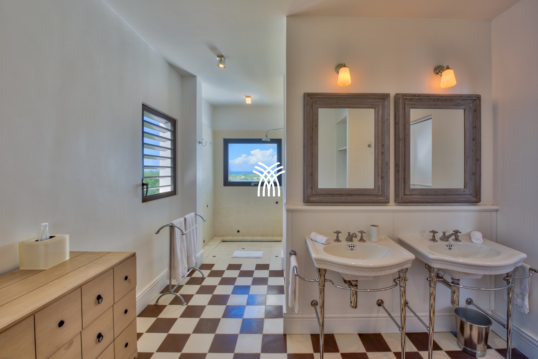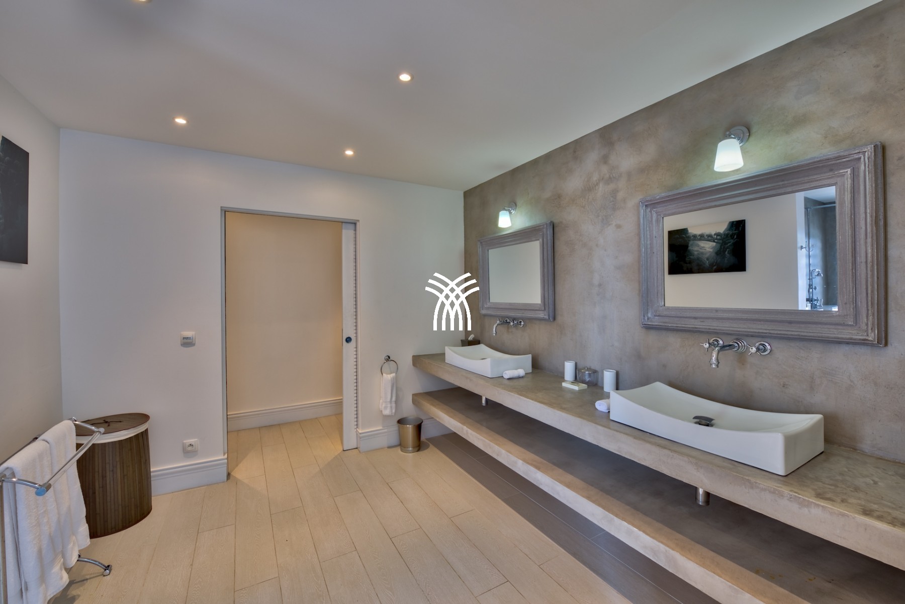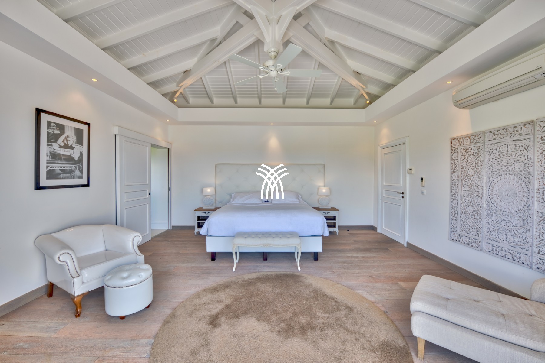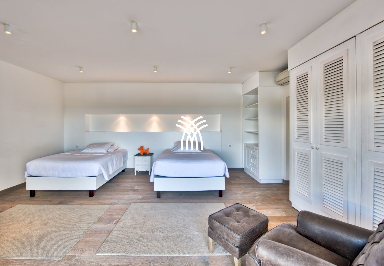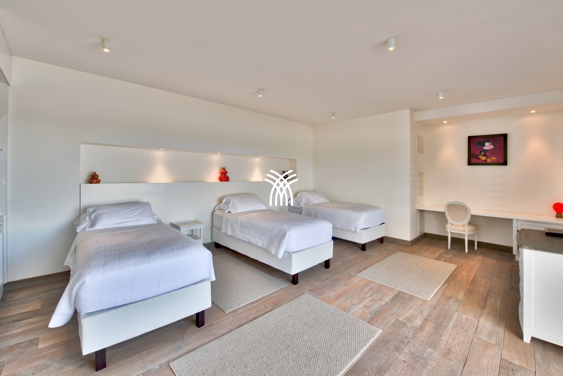 Sur le premier niveau vous trouverez encore deux chambres grandioses, équipées de lits créés spécialement pour la villa et aussi meublées par Blanc d’Ivoire. Chaque chambre est équipée de sa propre terrasse donnant sur la piscine et comporte cela va sans dire leur propre salle de bain dessinée et équipée par Devon & Devon.