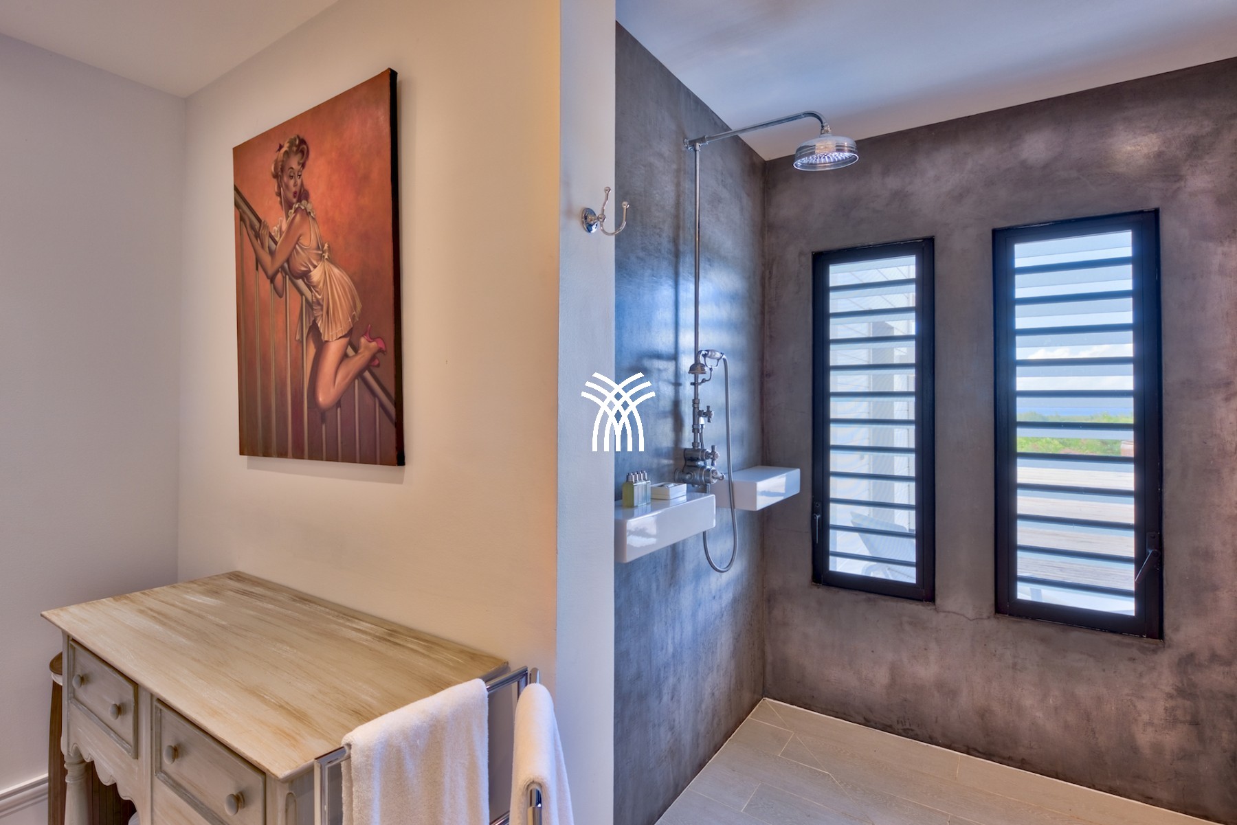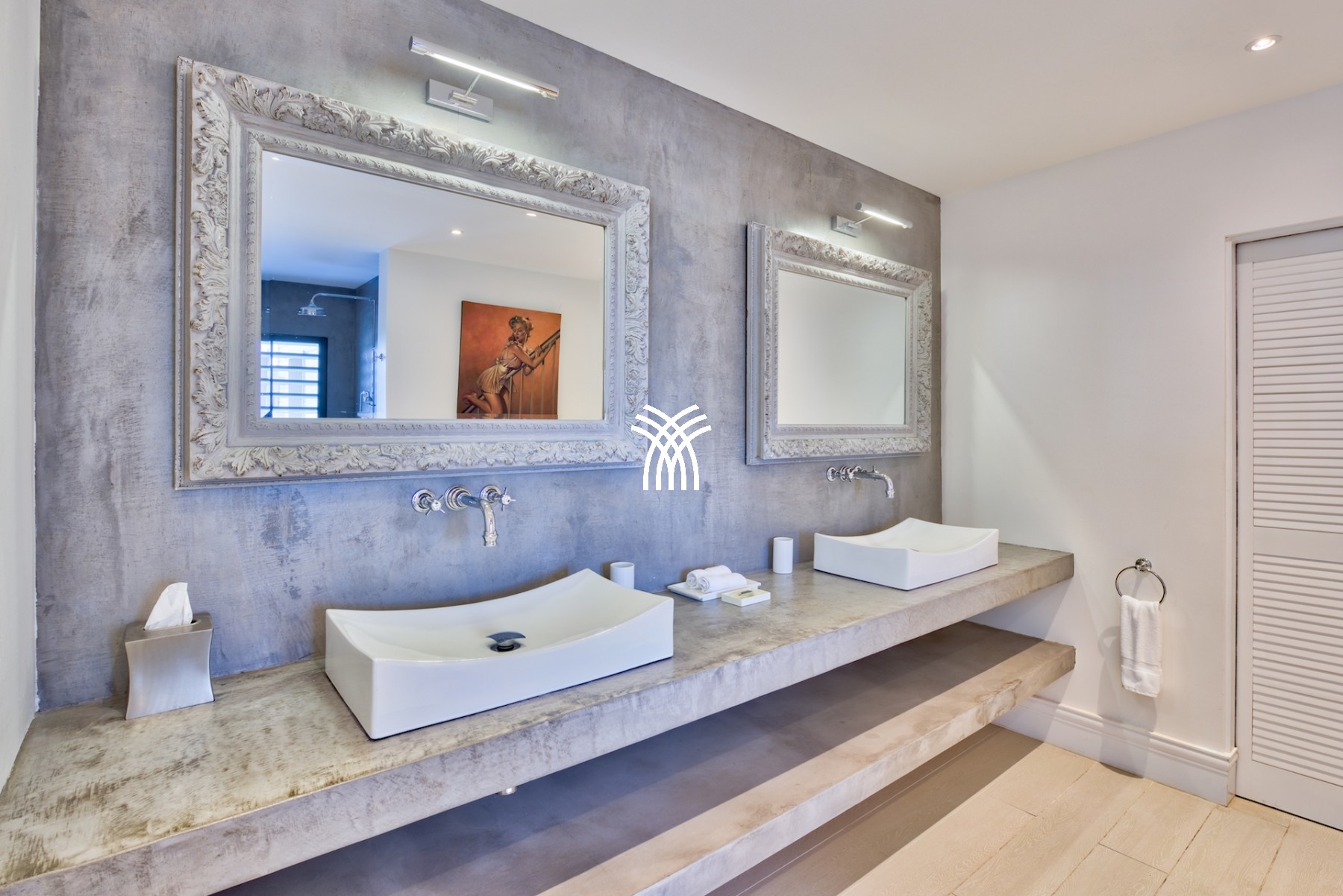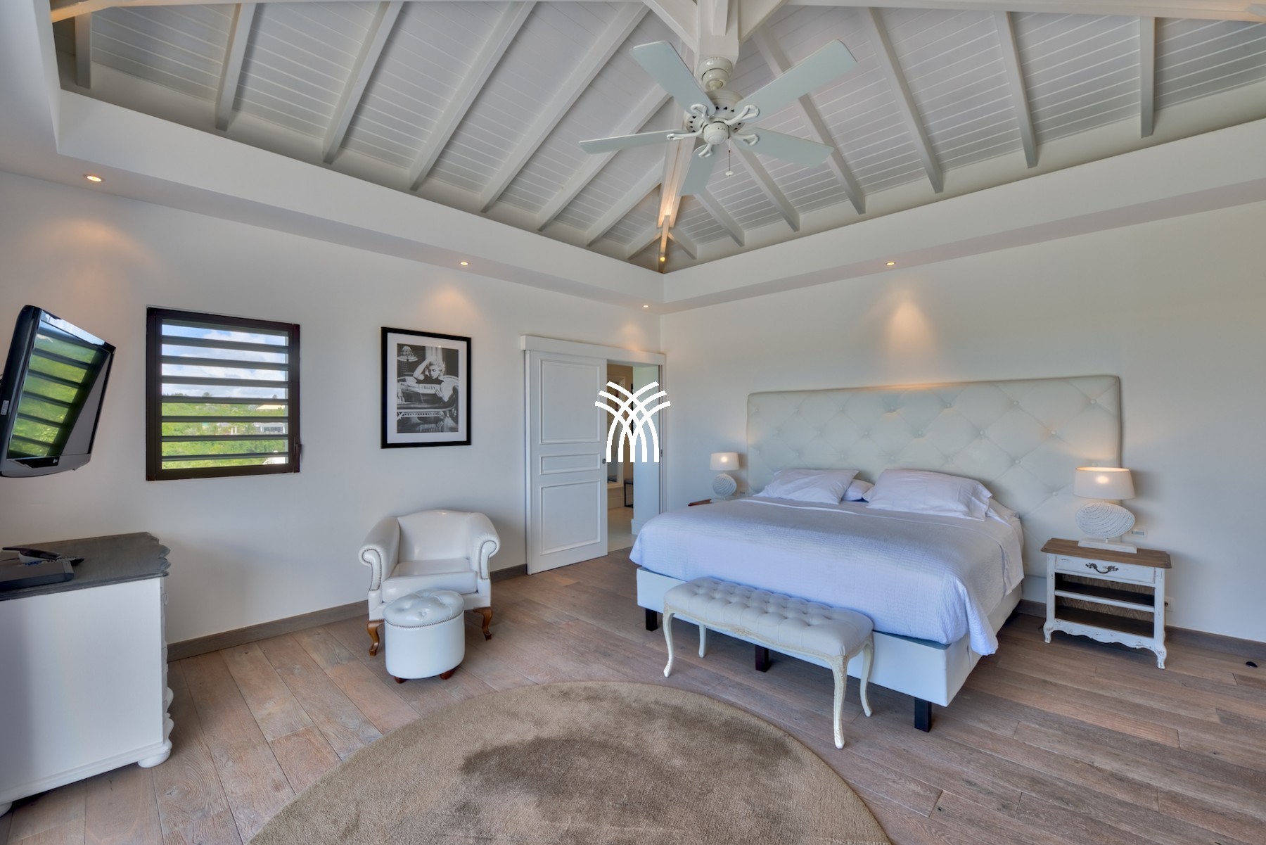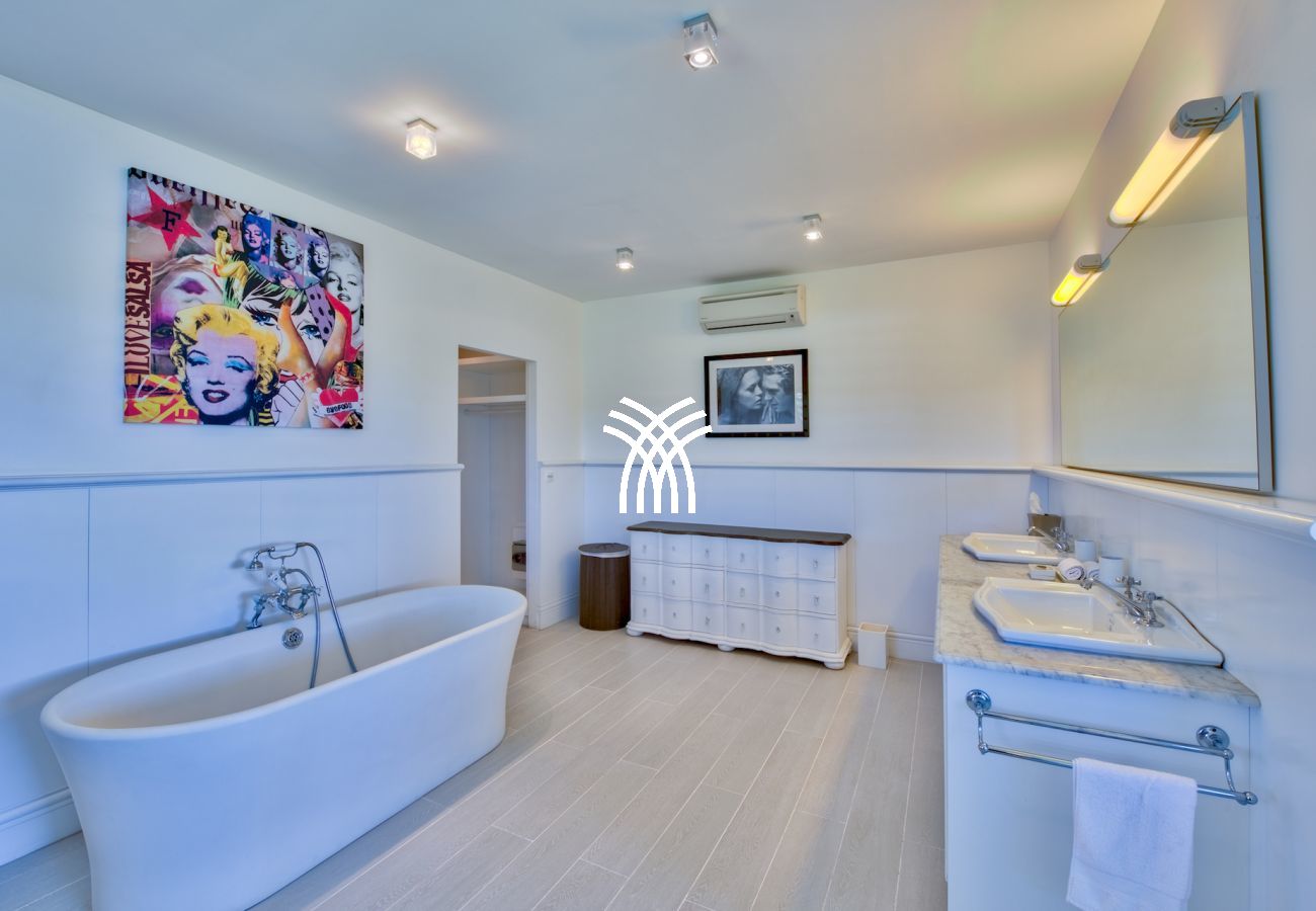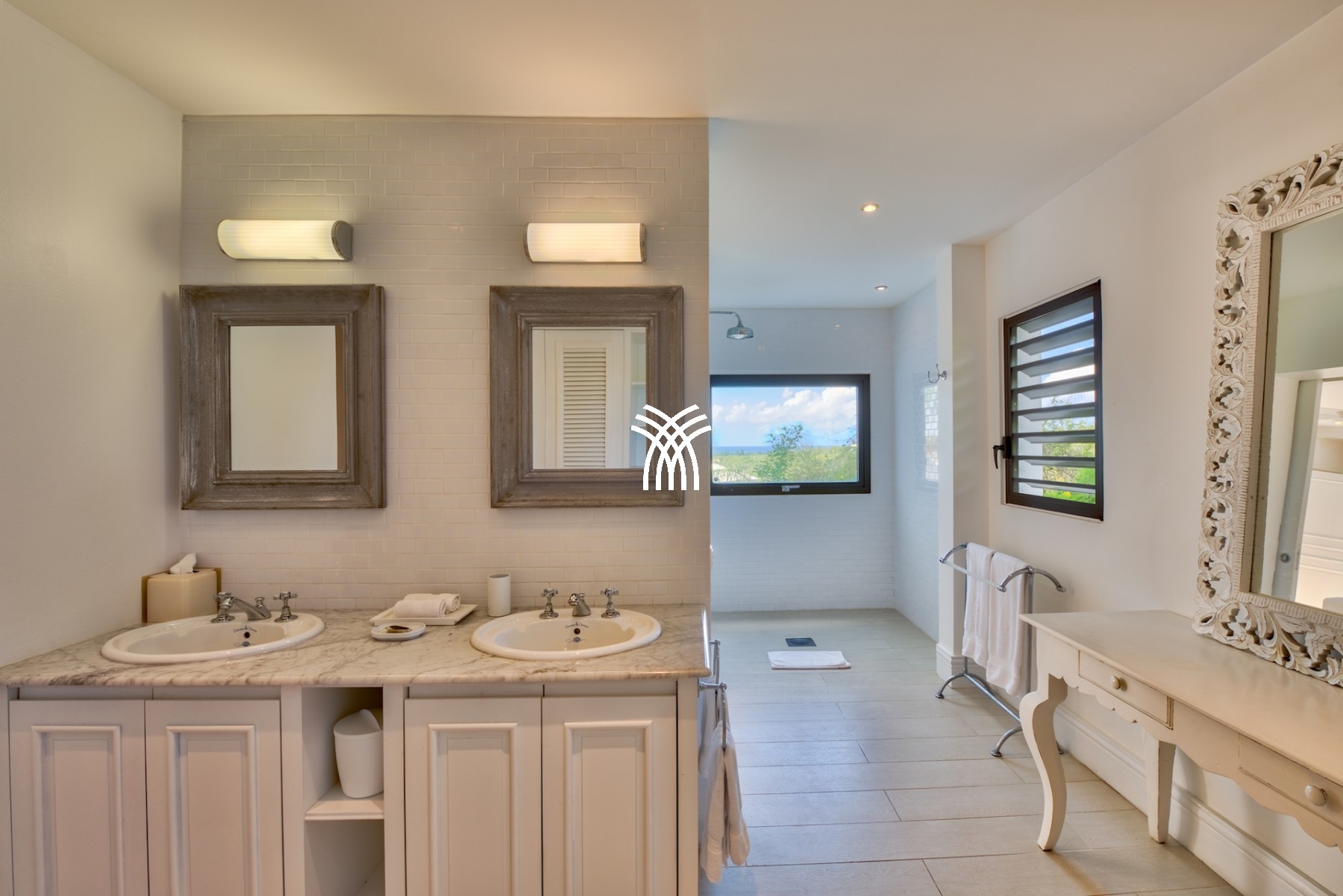 Sur le premier niveau vous trouverez encore deux chambres grandioses, équipées de lits créés spécialement pour la villa et aussi meublées par Blanc d’Ivoire. Chaque chambre est équipée de sa propre terrasse donnant sur la piscine et comporte cela va sans dire leur propre salle de bain dessinée et équipée par Devon & Devon.