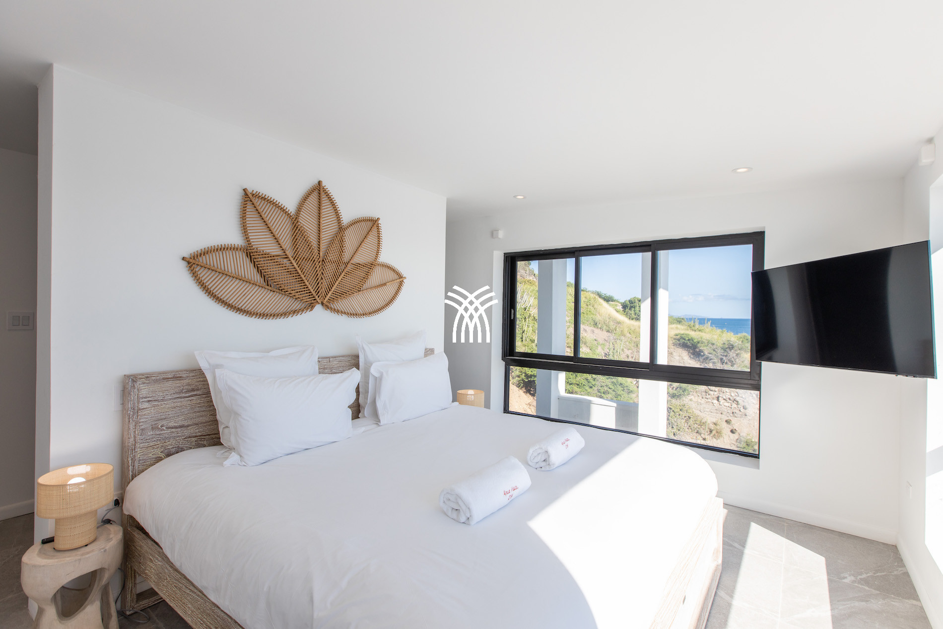 Cette location de villa de luxe à Saint-Martin propose six chambres spacieuses, toutes dotées de salles de bains privatives. La suite principale se distingue par ses vues spectaculaires sur la mer et son ambiance apaisante. Quatre chambres sont situées au rez-de-chaussée, une cinquième au niveau inférieur, attenante aux espaces de vie, tandis que la sixième chambre, indépendante et accessible par un escalier extérieur, bénéficie d’une vue panoramique unique depuis le lit.