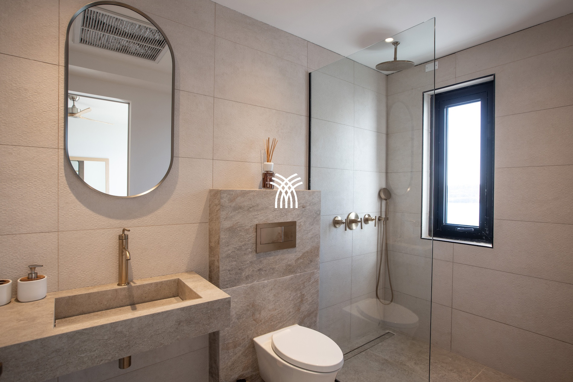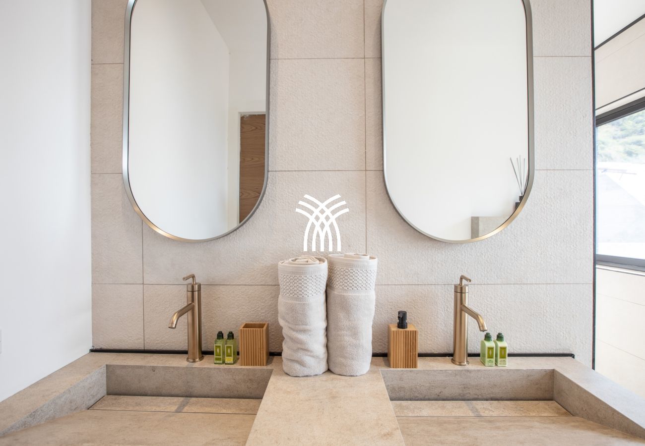 Les six chambres, réparties sur trois niveaux, offrent une intimité absolue et un confort inégalé. Chacune dispose de sa propre salle de bain attenante, avec des finitions raffinées et une vue panoramique sur l’océan. La suite principale se distingue par sa baignoire élégante, invitant à des instants de détente face à un paysage à couper le souffle. L’expérience est sublimée par des douches à l’italienne et des espaces de repos conçus pour un bien-être absolu.