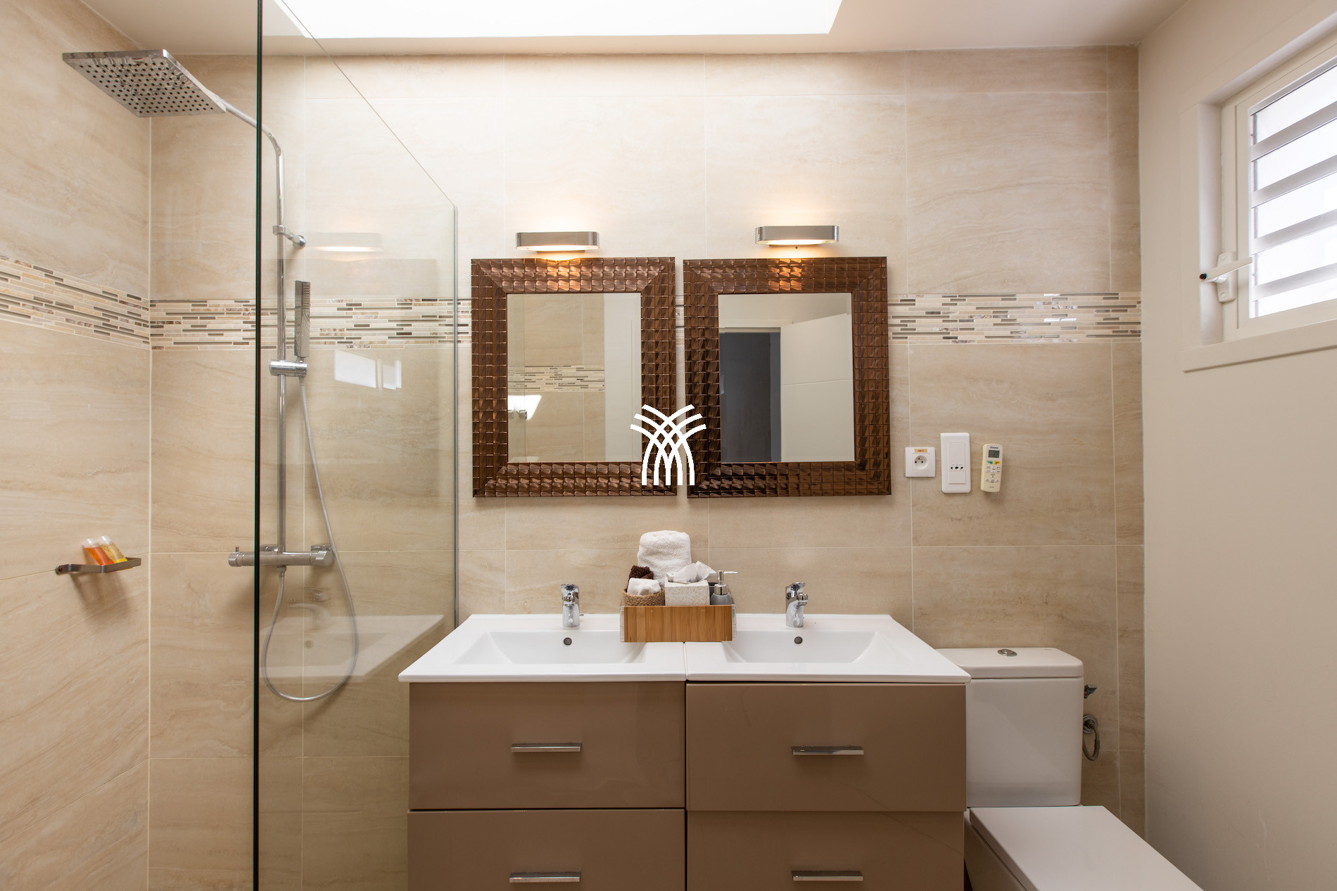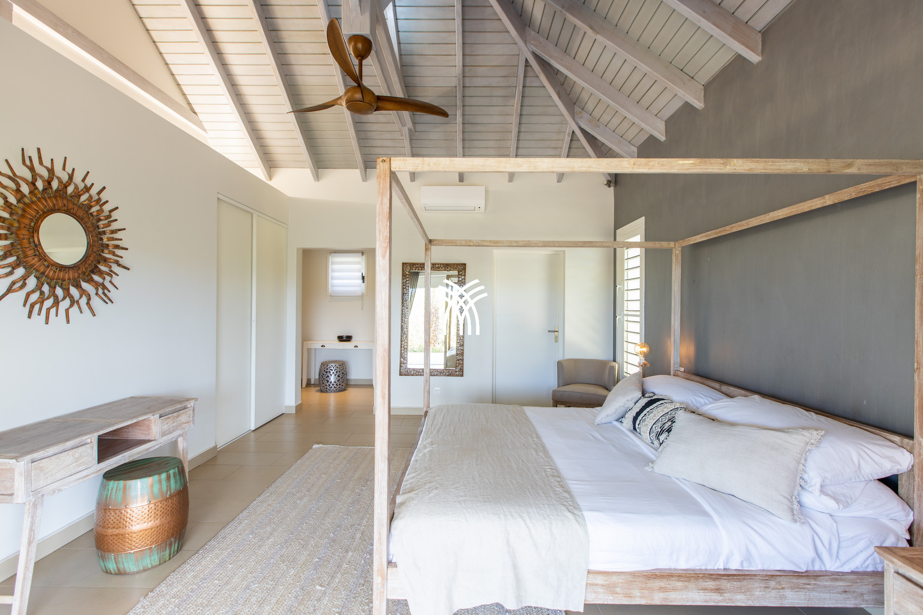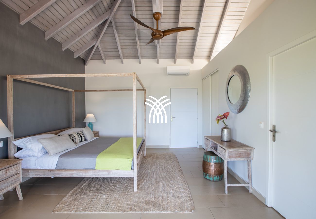 À l’intérieur, cette villa de luxe à louer à Saint-Martin dévoile un espace de vie spacieux et raffiné, décoré avec goût dans des tons chaleureux. Le mobilier haut de gamme et les équipements modernes assurent un confort optimal. La Villa Amber dispose de quatre chambres climatisées, chacune avec sa salle de bains privative, garantissant intimité et bien-être à tous les invités. Trois chambres, dont la suite principale, s’ouvrent directement sur la terrasse et la piscine. La quatrième chambre, située à l’étage inférieur avec accès indépendant, constitue un espace idéal pour ceux qui recherchent plus d’intimité.