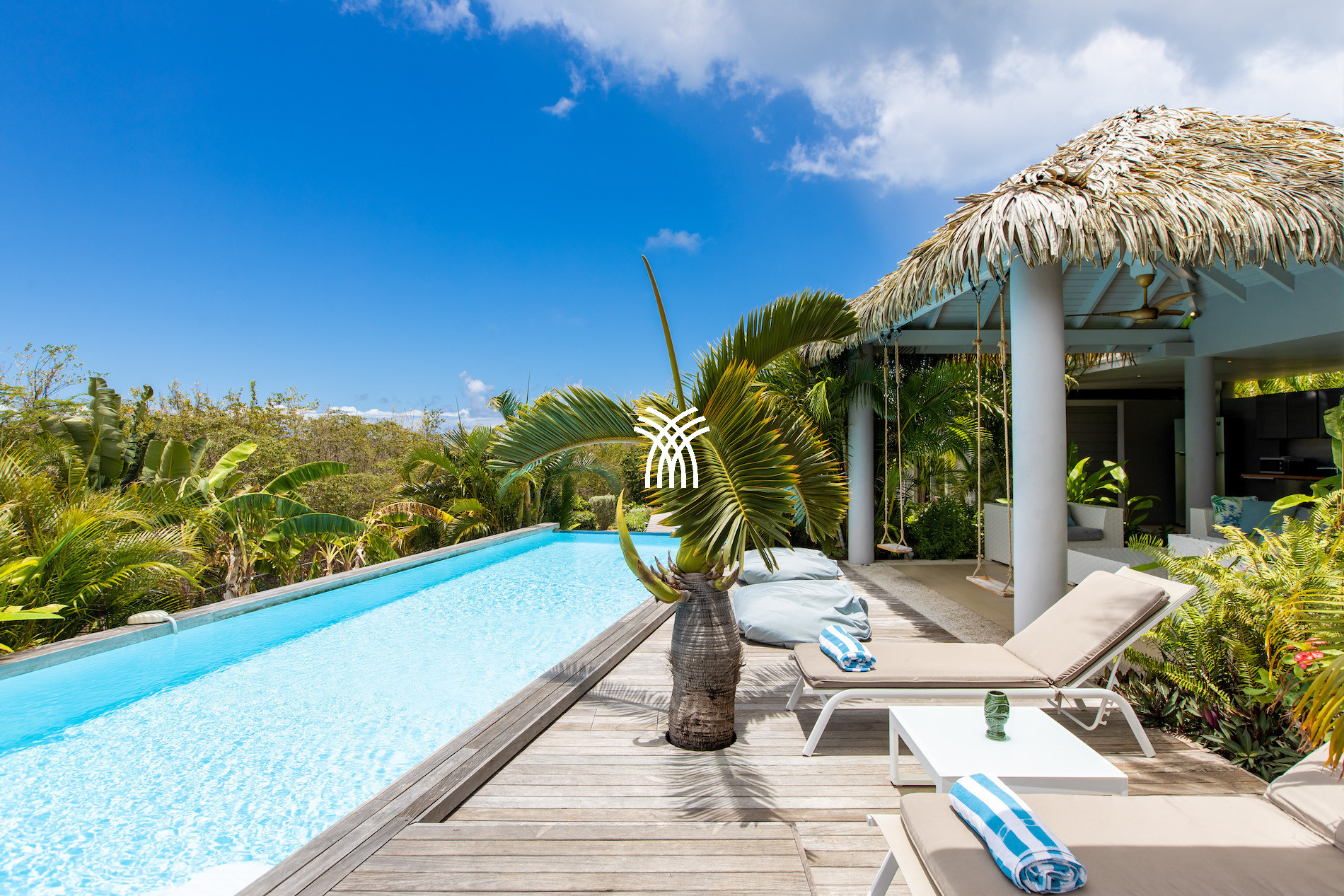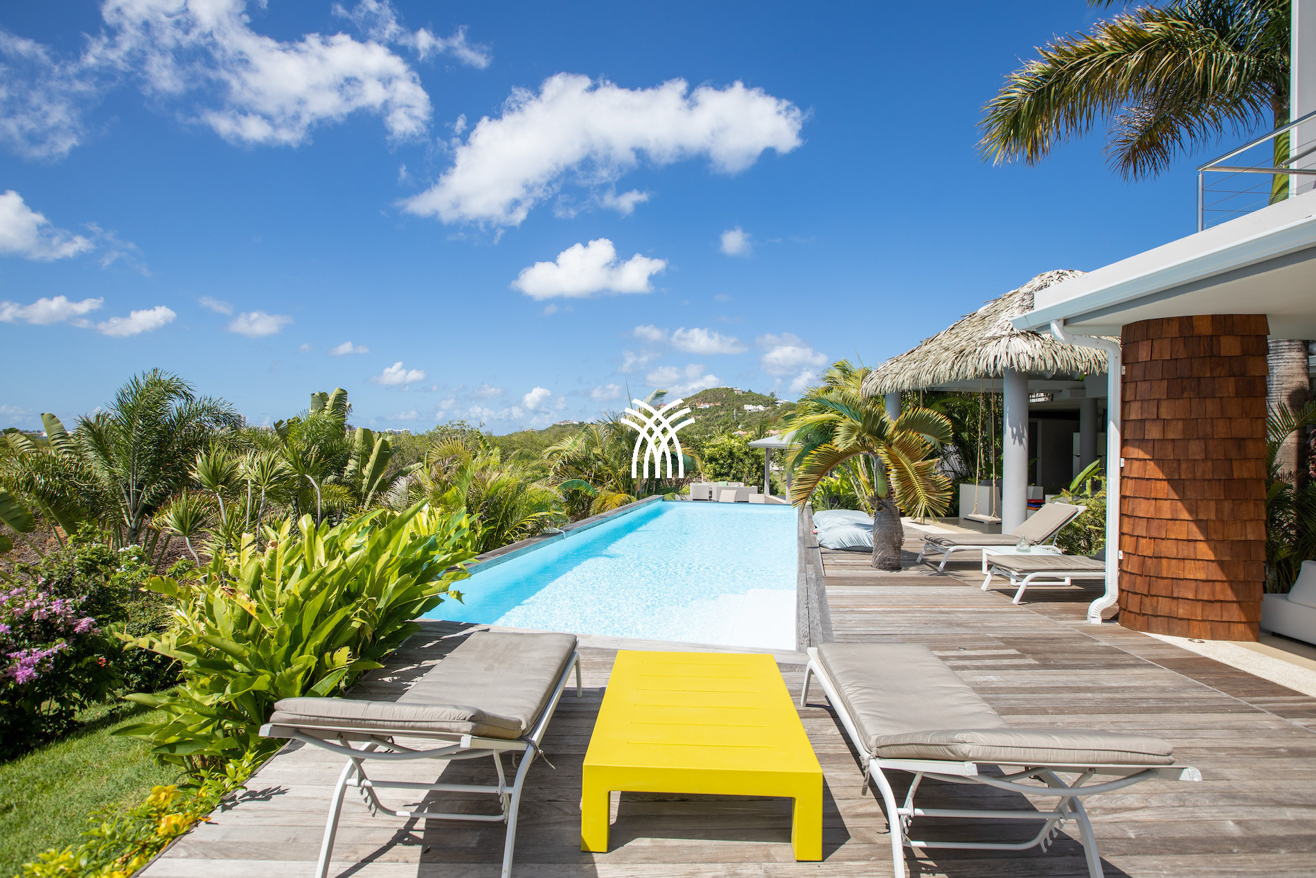 Cette location de villa luxe à Saint Martin dispose d’une superbe piscine à débordement chauffée avec vue panoramique sur la végétation environnante. Un second bassin, plus petit, situé au niveau inférieur de la terrasse, permet également de se rafraîchir et de profiter pleinement de l’extérieur.