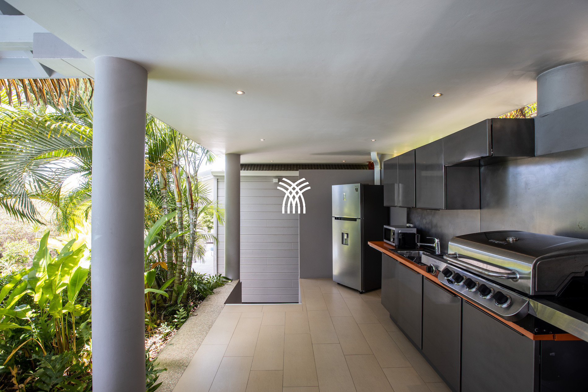La grande terrasse extérieure est un véritable lieu de vie avec ses espaces lounge, son barbecue, et sa salle à manger extérieure. La cuisine moderne et entièrement équipée s’ouvre directement sur la terrasse, créant un espace convivial idéal pour partager des moments en famille ou entre amis.