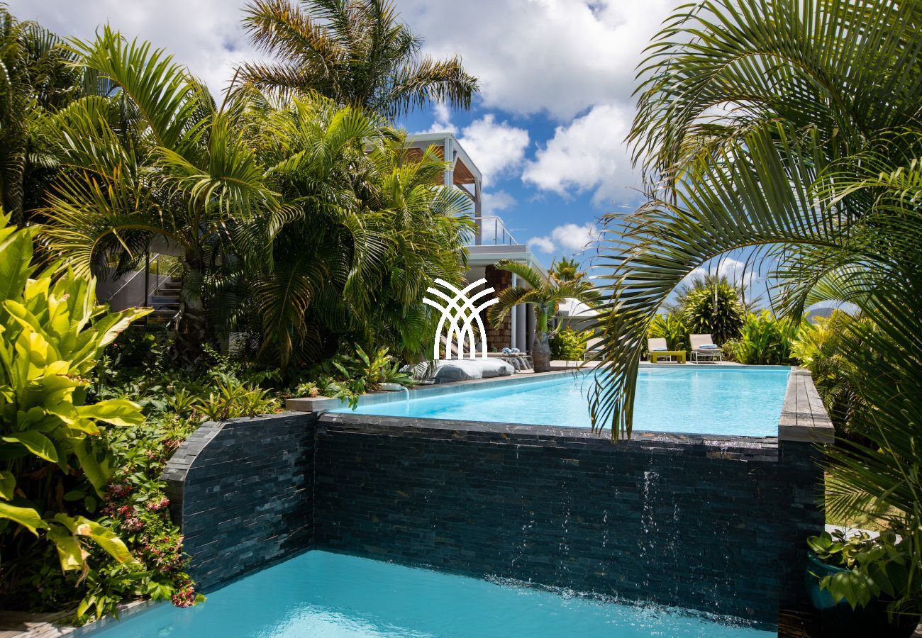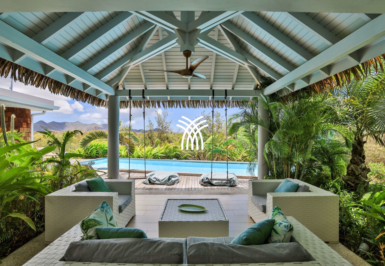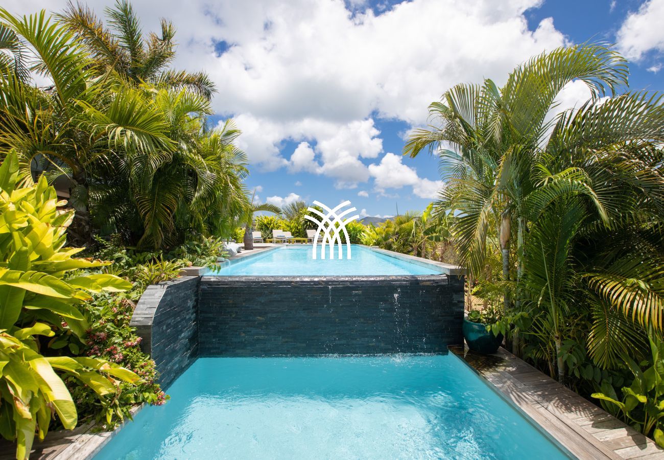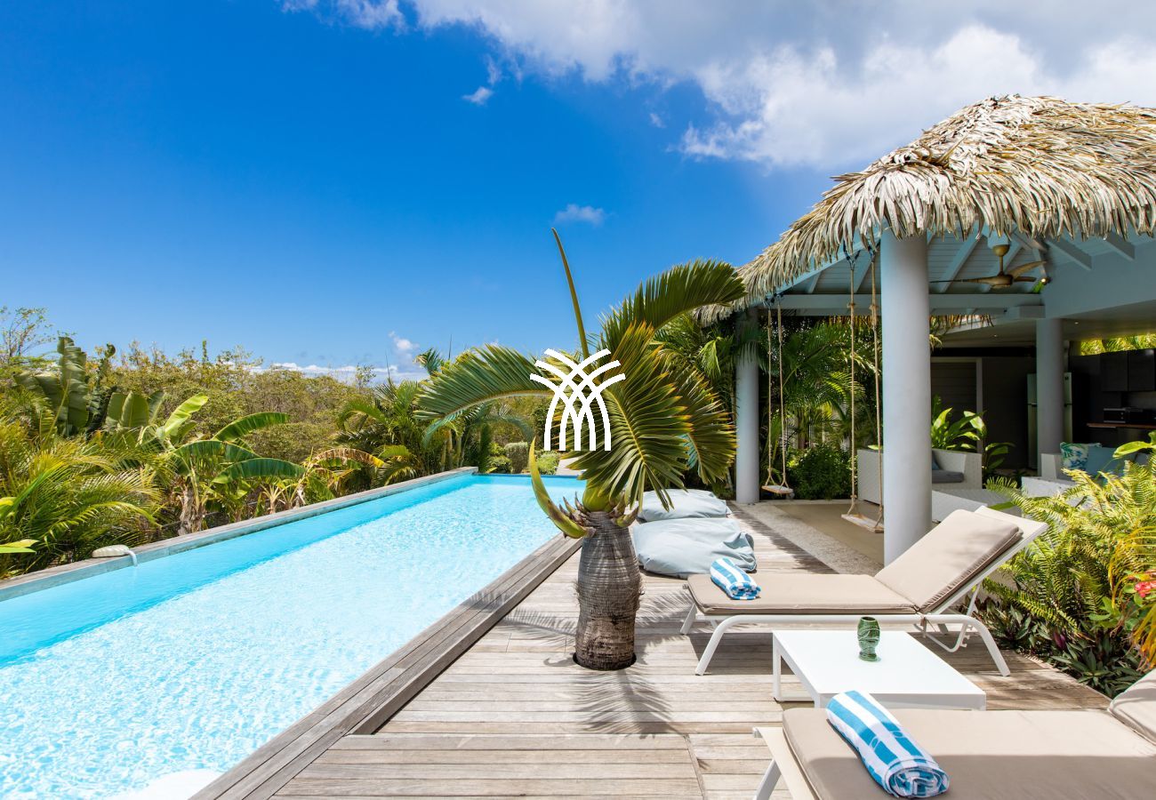 Nichée au cœur des Terres Basses, vous offrant une vue sur la nouvelle piscine à débordement, Baie Longue et la mer des Caraïbes.