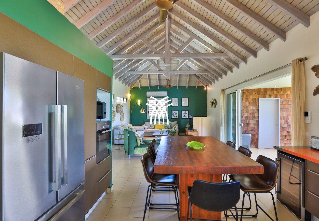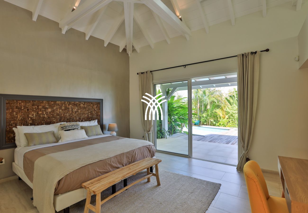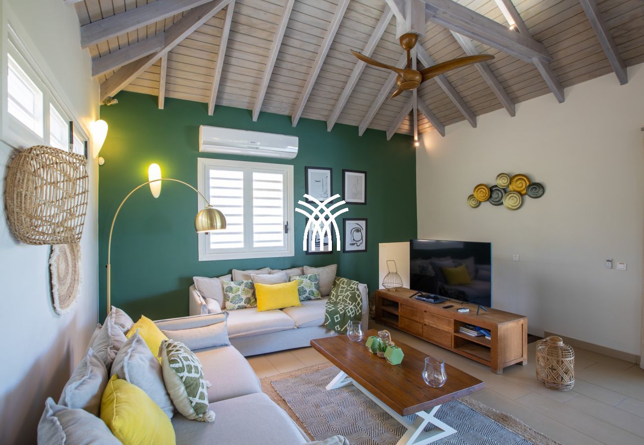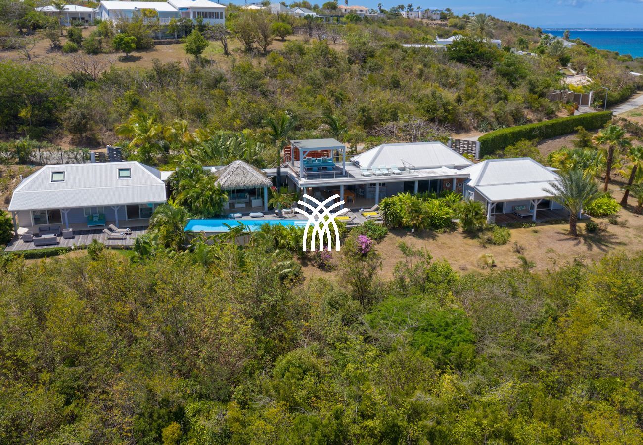 Nichée au cœur des Terres Basses, vous offrant une vue sur la nouvelle piscine à débordement, Baie Longue et la mer des Caraïbes.