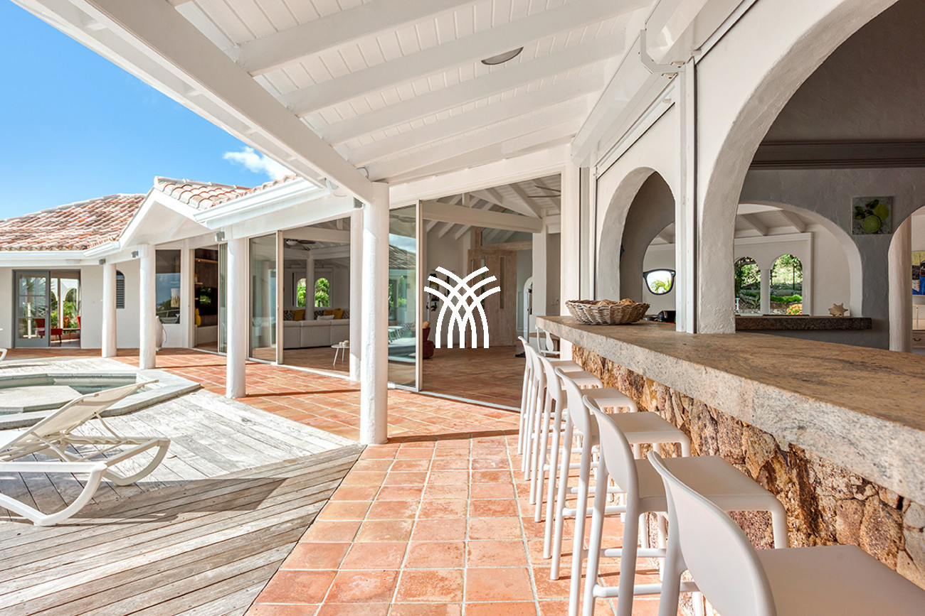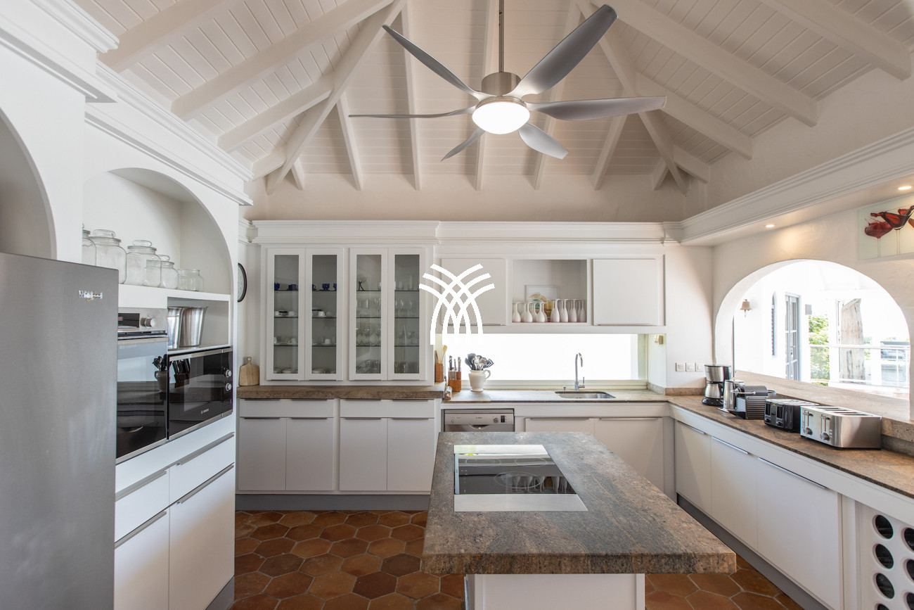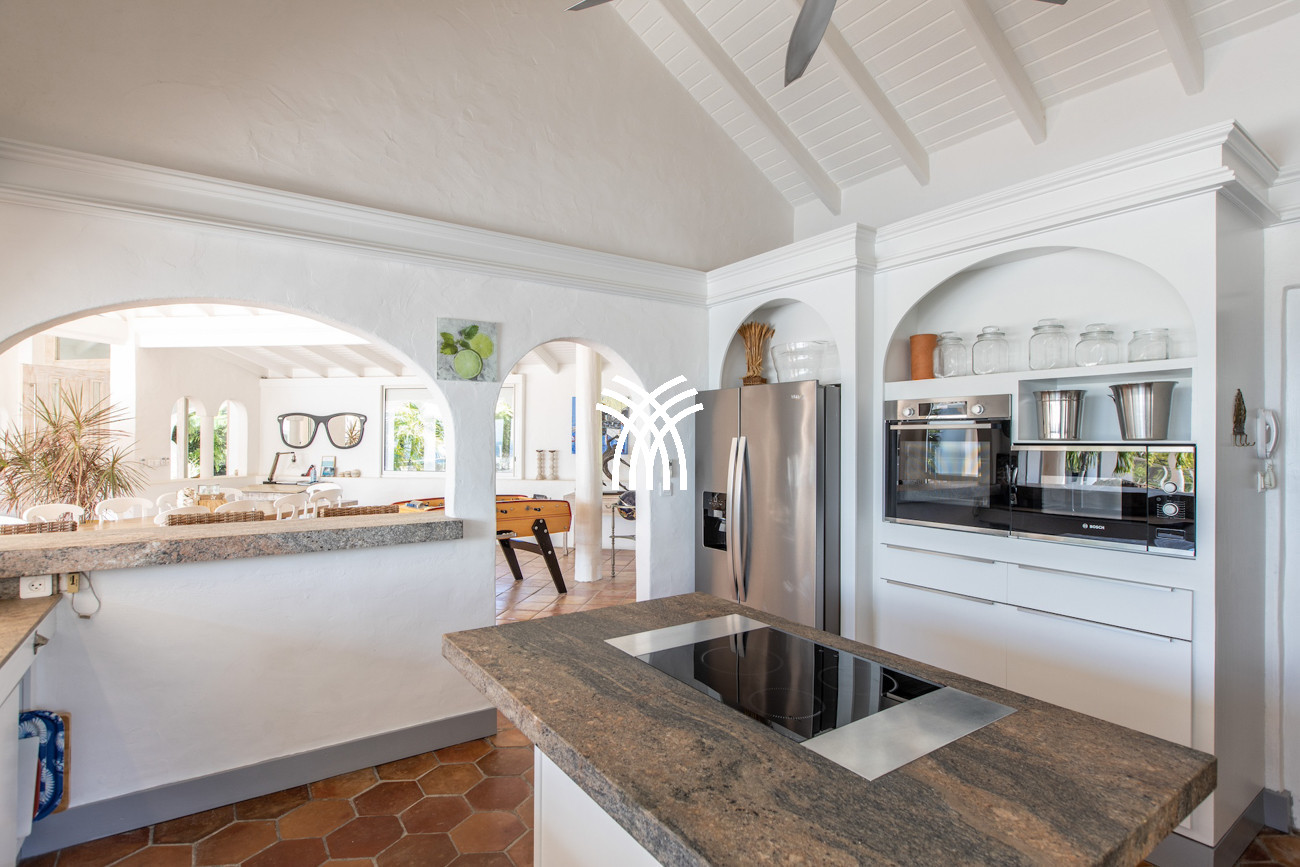 La cuisine gourmet est un autre atout de cette villa de luxe à louer à Saint Martin. Son design élégant, ses équipements haut de gamme et ses grandes fenêtres cintrées ouvertes sur la terrasse en font un lieu de vie central et lumineux.