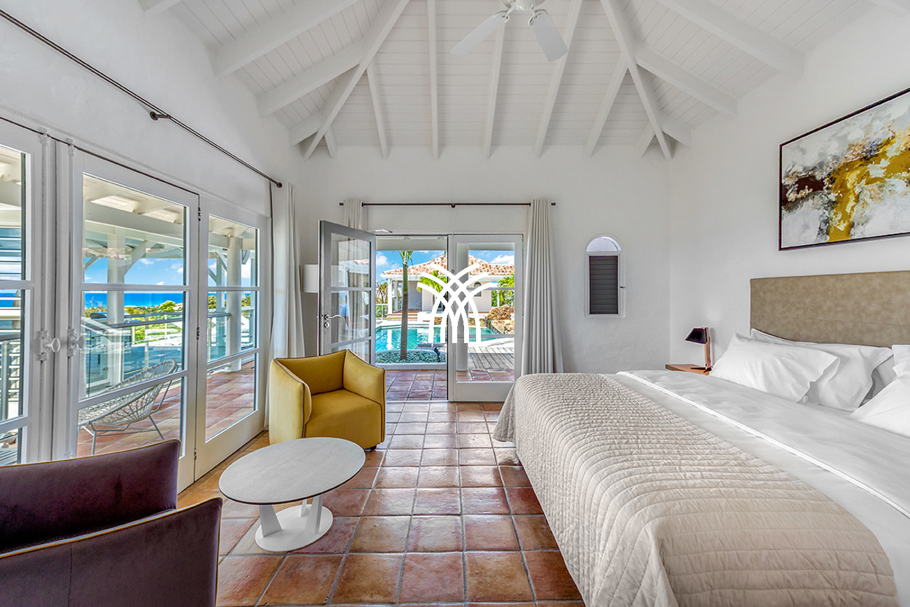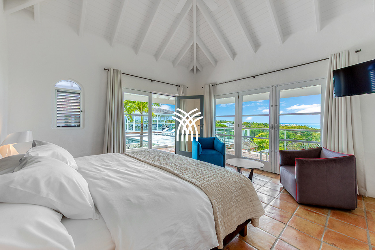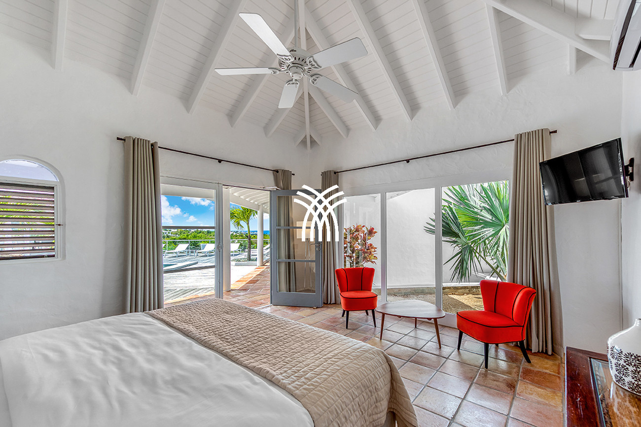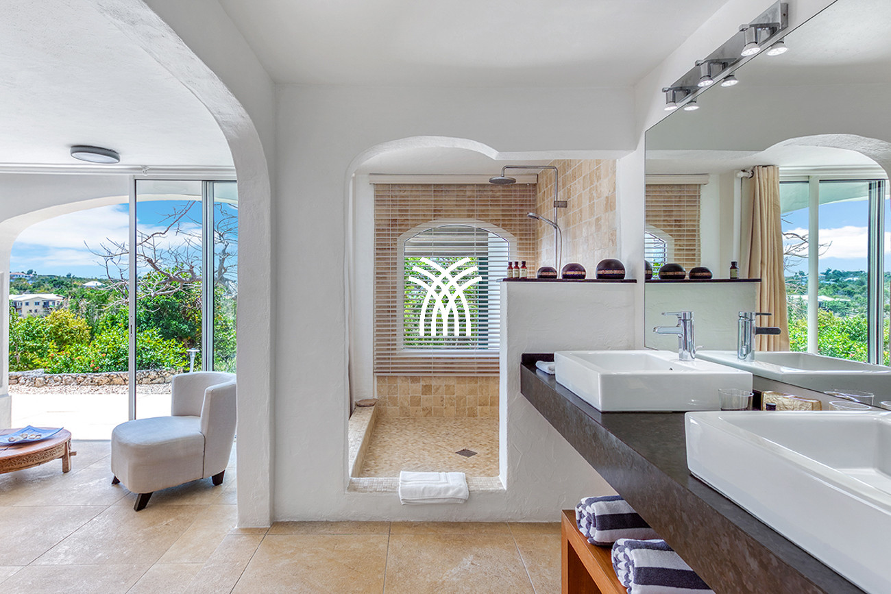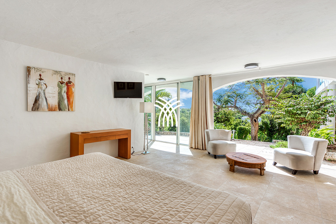 4 chambres de tailles égales ont la vue sur la mer des Caraïbes et sont au niveau de la terrasse de la piscine. La 5ème chambre et sa salle de bains attenante sont au niveau inférieur avec vue sur la mer des Caraïbes. Cette chambre comprend aussi une kitchenette.