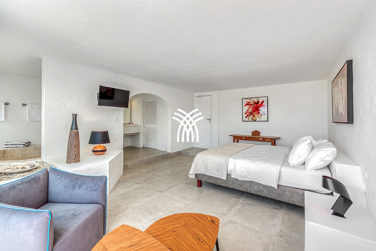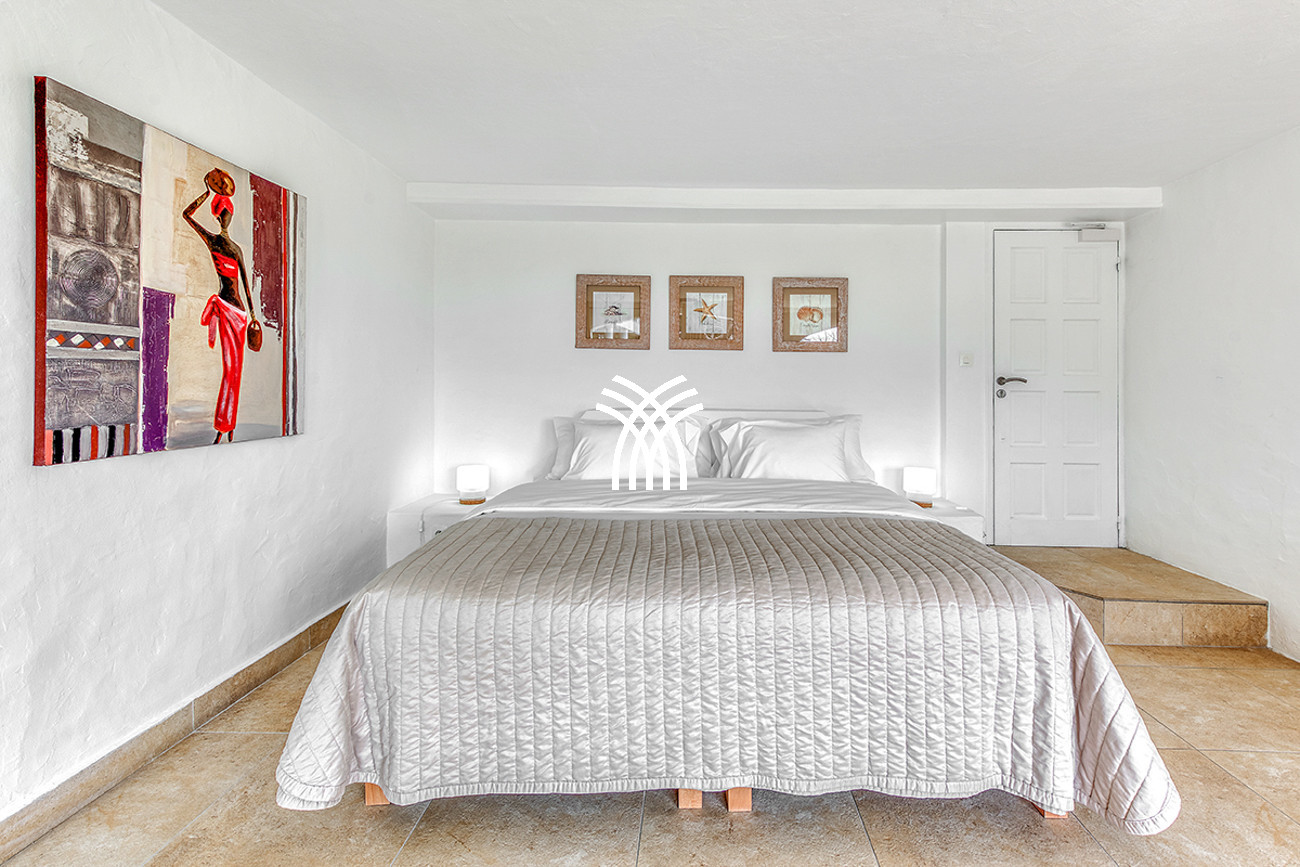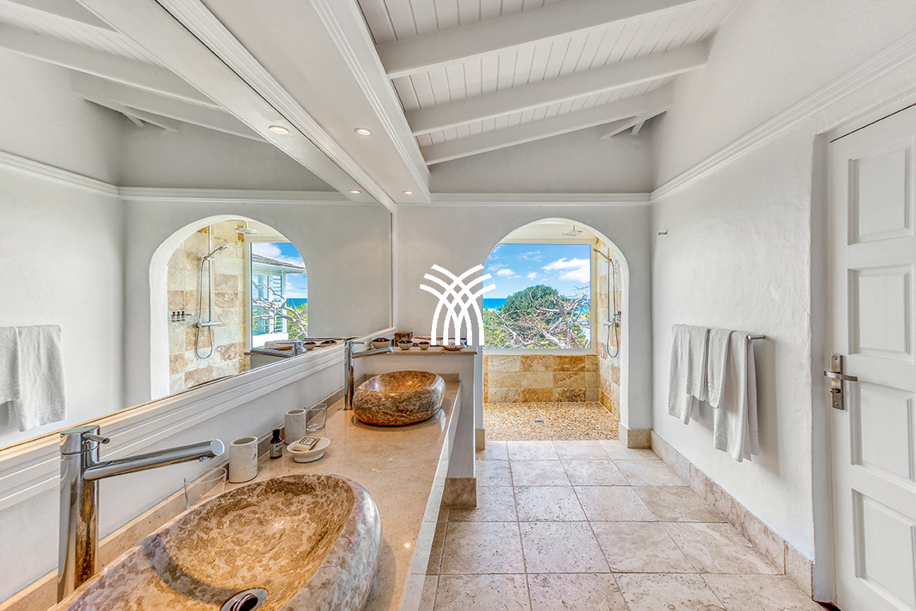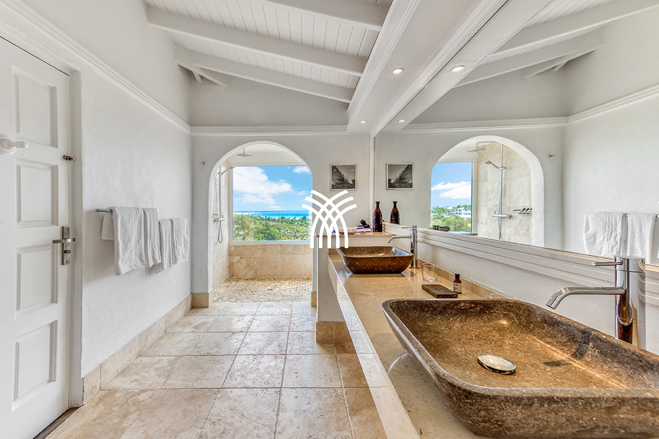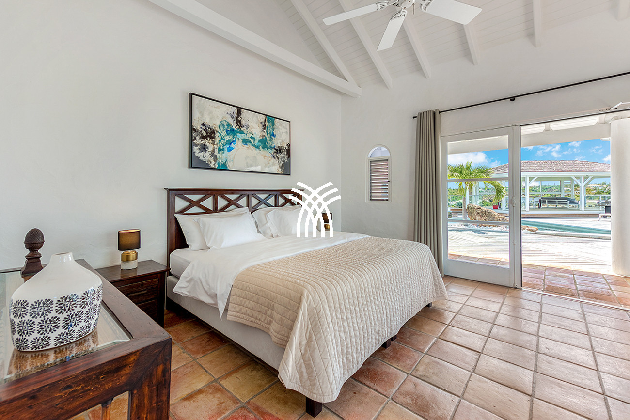 4 chambres de tailles égales ont la vue sur la mer des Caraïbes et sont au niveau de la terrasse de la piscine. La 5ème chambre et sa salle de bains attenante sont au niveau inférieur avec vue sur la mer des Caraïbes. Cette chambre comprend aussi une kitchenette.