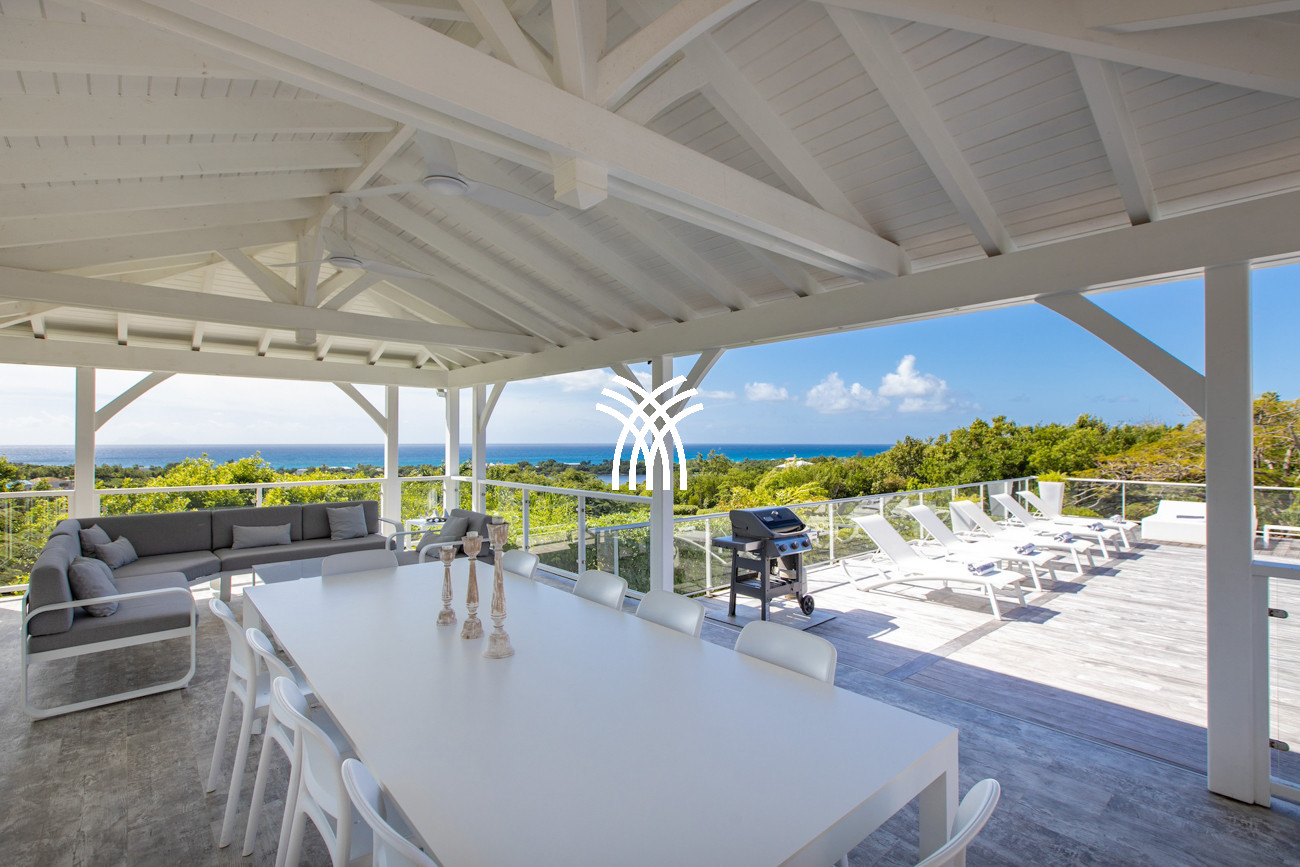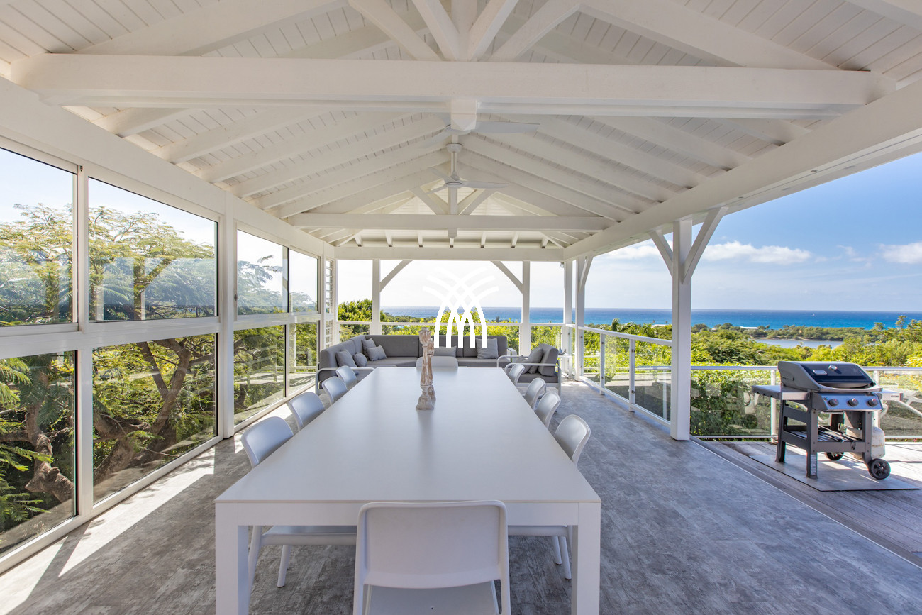 Un grand gazebo abrite un espace repas extérieur et un barbecue intégré pour des soirées détendues en plein air face à la mer des Caraïbes.