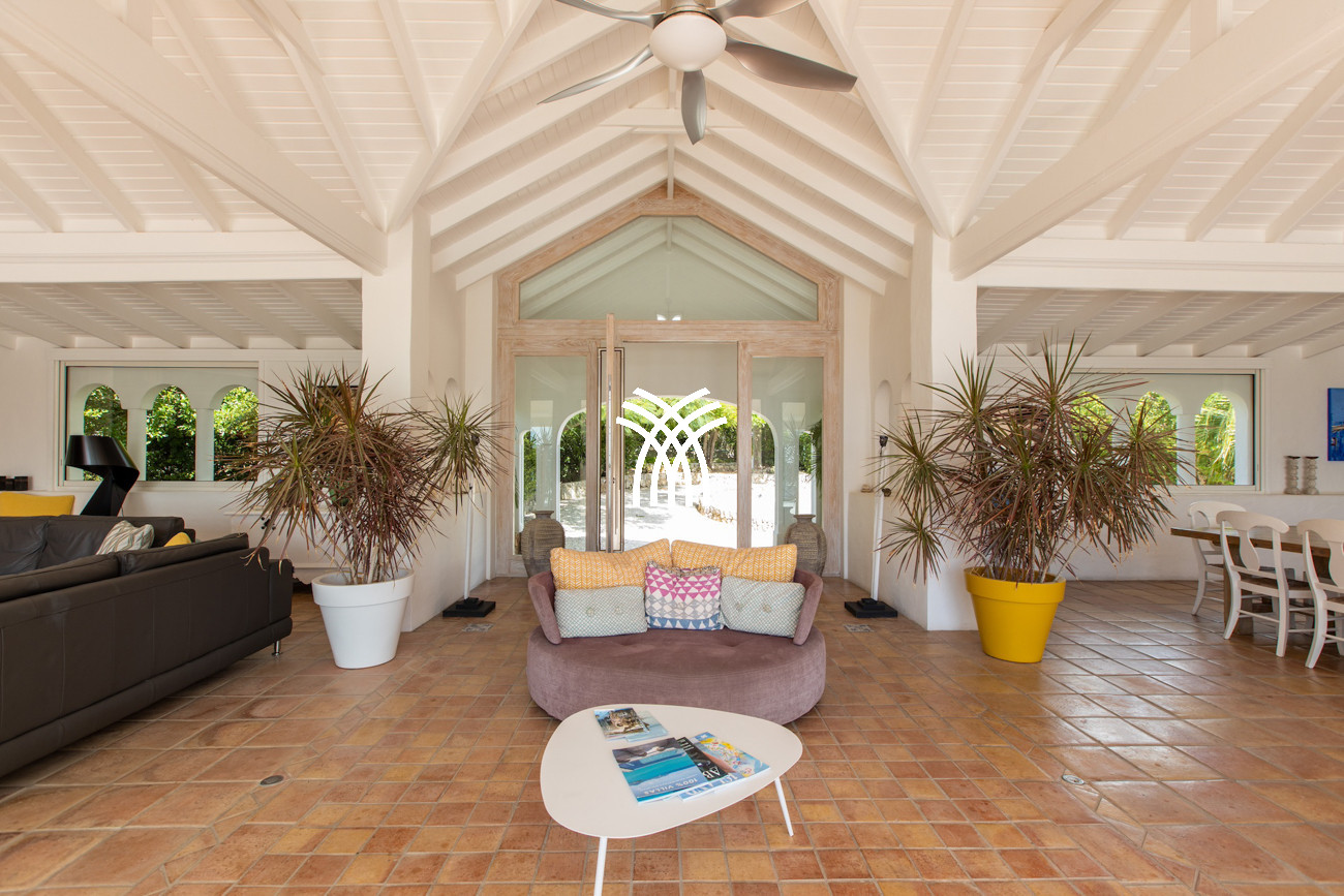 L’extérieur de cette villa de luxe à louer à Saint Martin est un véritable havre de paix. La grande terrasse aménagée avec salon extérieur d’inspiration marocaine, piscine à débordement et salle à manger en plein air permet de vivre pleinement l’art de vivre caribéen, entre détente et convivialité.