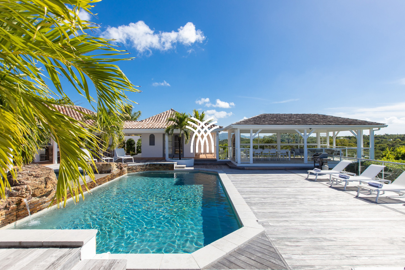 Parfaite pour une location villa luxe à Saint Martin, la Villa Belle Fontaine séduit par ses grands espaces extérieurs, sa vue mer et son atmosphère conviviale. Sa vaste terrasse accueille une superbe piscine double : une grande piscine idéale pour nager et se rafraîchir, complétée par une petite piscine originale entourée d’une grande table carrelée parfaite pour les apéritifs et les moments de partage.
