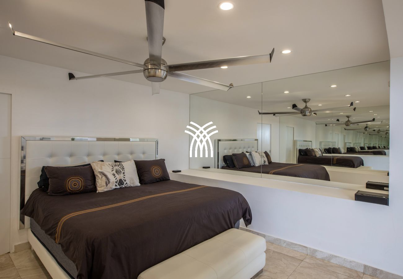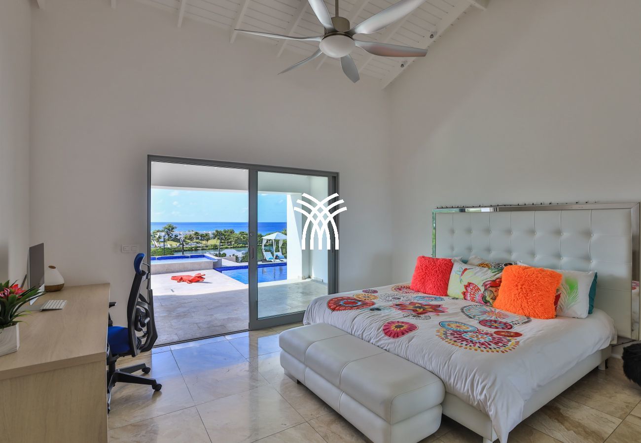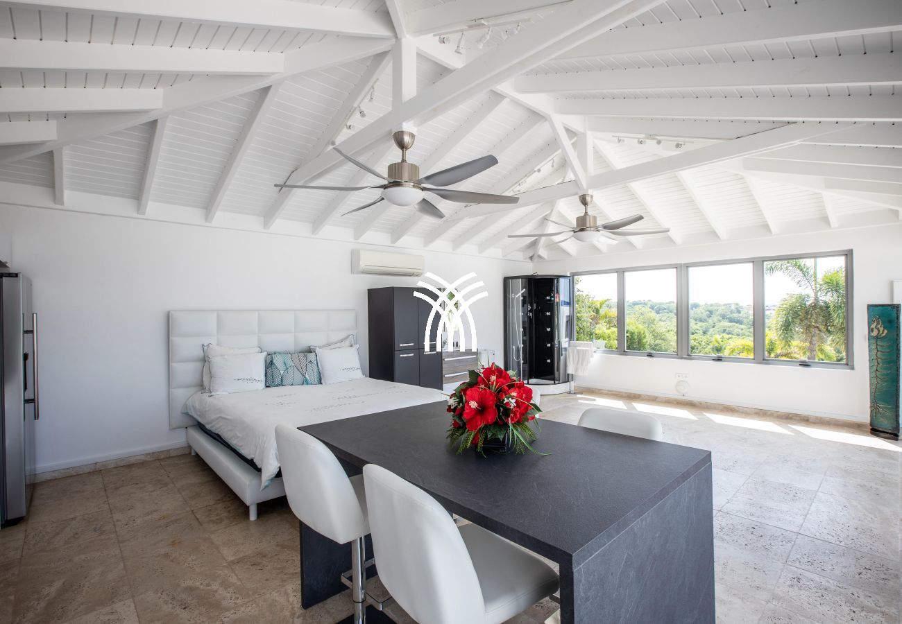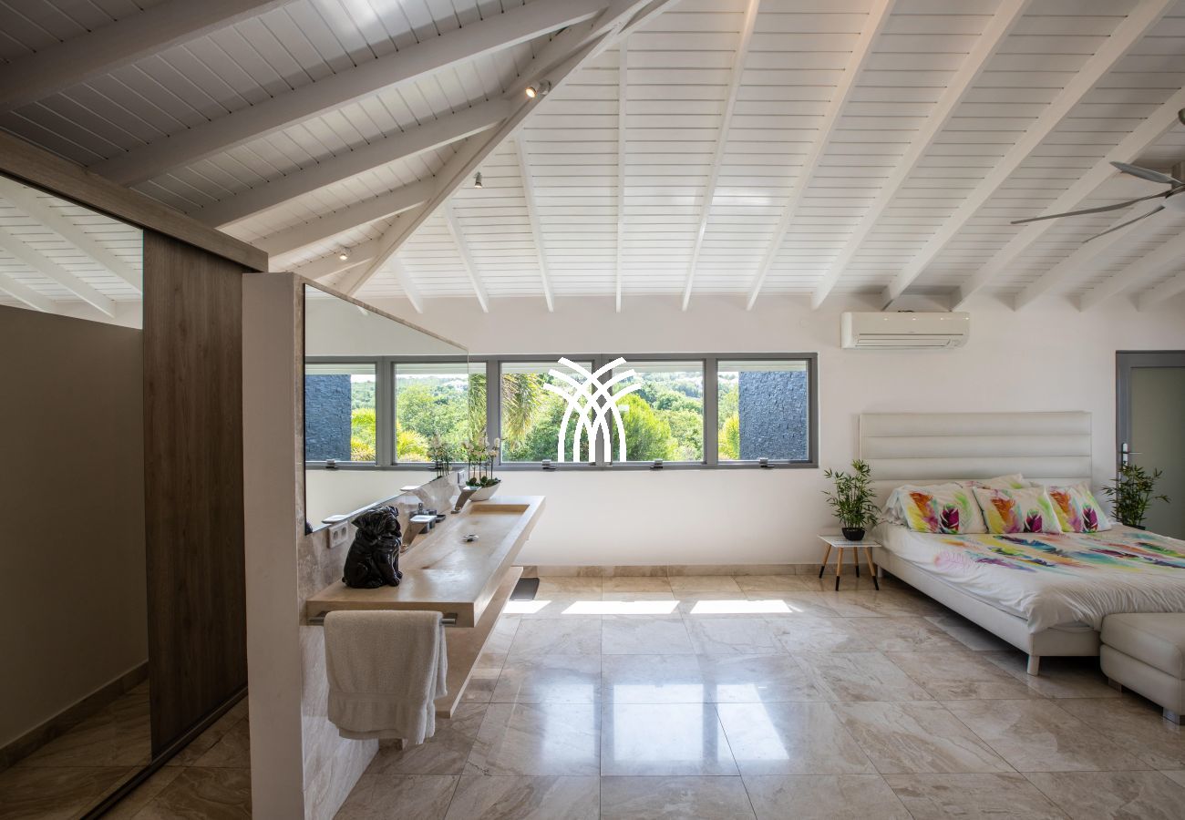 Parfaite pour un séjour en famille ou entre amis, cette location de villa luxe à Saint Martin propose 5 chambres, toutes avec salle de bain privative. Trois chambres se situent au niveau de la piscine et des terrasses extérieures. La suite principale, un véritable appartement privé, se trouve à un niveau inférieur avec sa propre cuisine, un grand dressing et un espace nuit offrant calme et intimité.