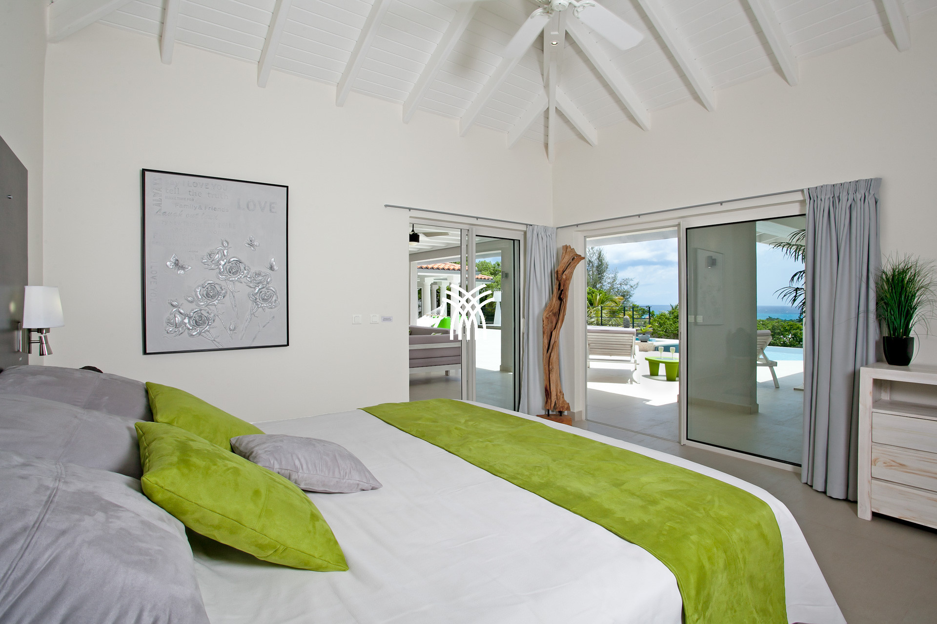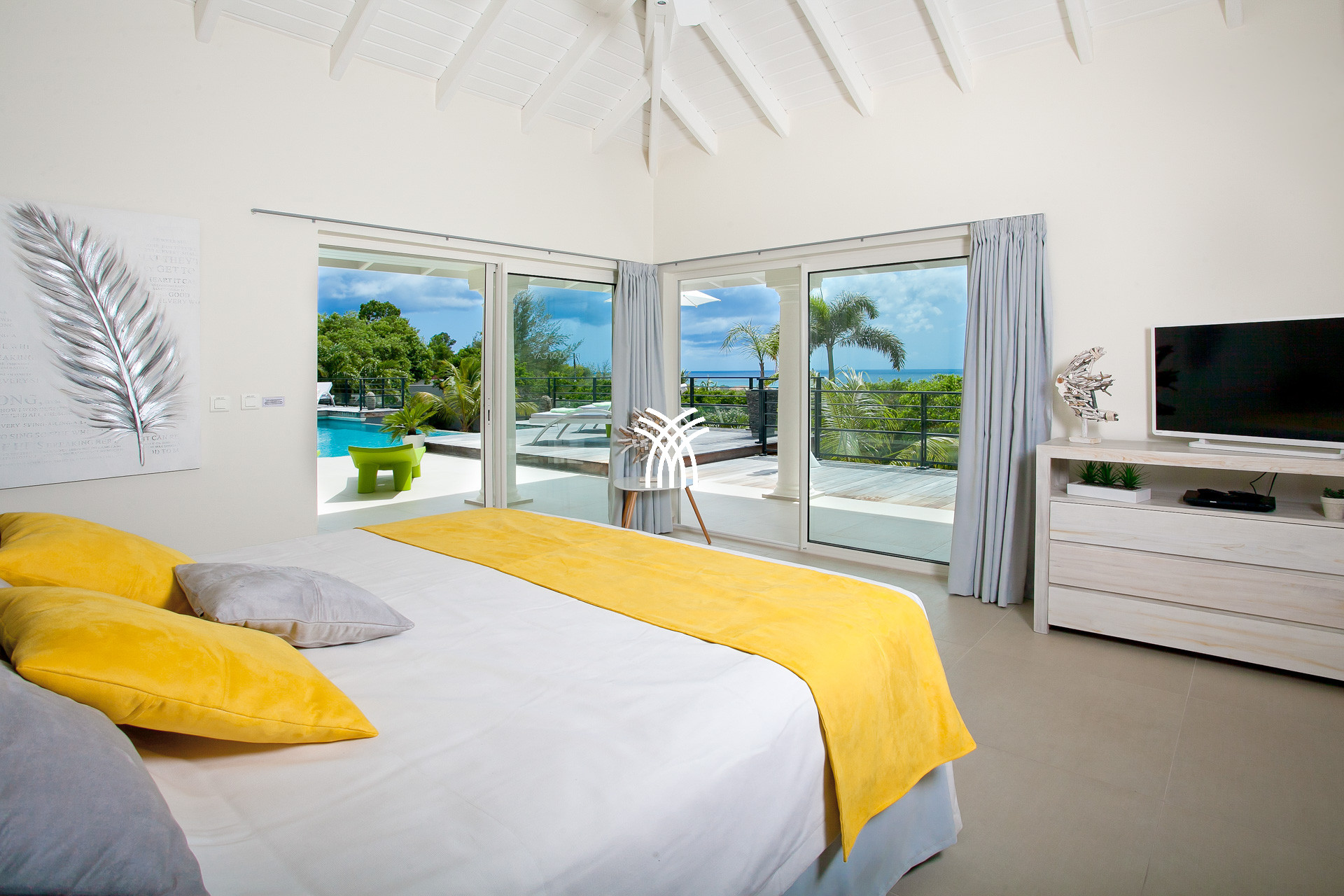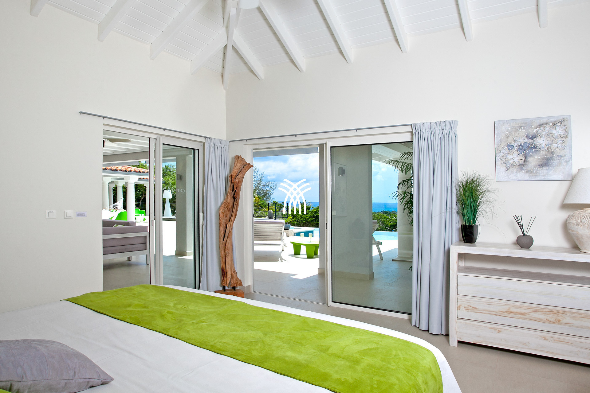 4 chambres de tailles égales ont la vue sur la mer des Caraïbes et sont au niveau de la terrasse de la piscine. La 5ème chambre et sa salle de bains attenante sont au niveau inférieur avec vue sur la mer des Caraïbes. Cette chambre comprend aussi une kitchenette.