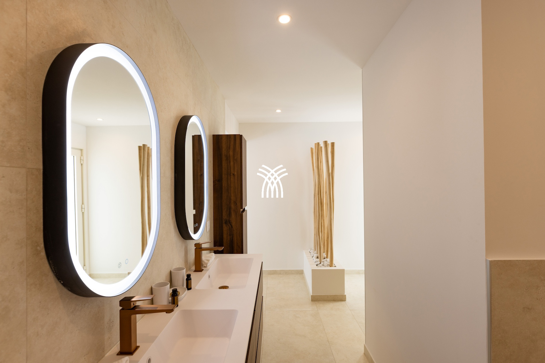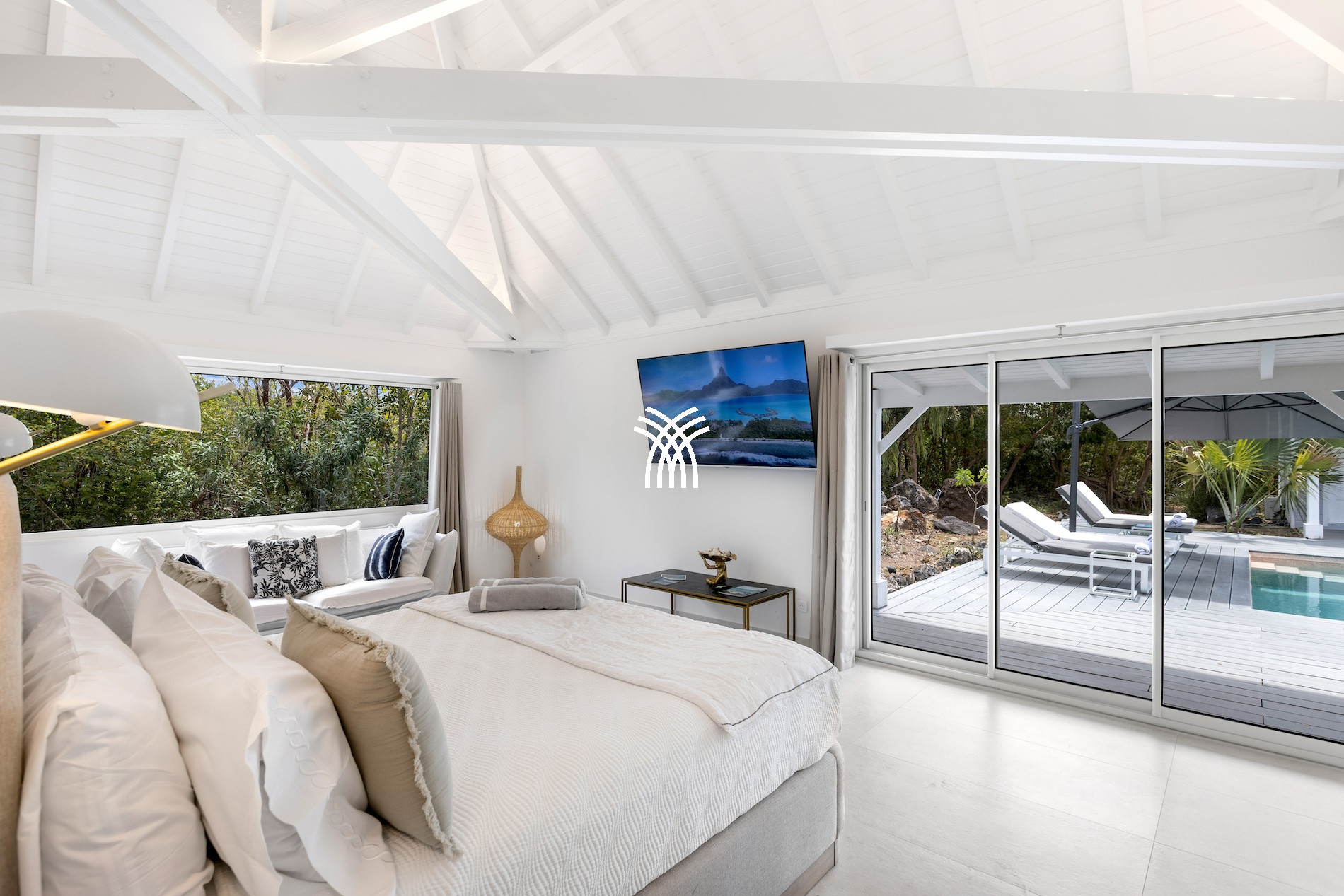 Le cœur de la villa s’organise autour d’une magnifique piscine centrale, véritable lieu de vie baigné de lumière. Le salon et la cuisine, regroupés dans un bungalow indépendant, sont entièrement climatisés et parfaitement équipés pour savourer de longs repas, se reposer à l’abri du soleil ou partager un apéritif raffiné. Cet espace convivial s’ouvre généreusement sur la terrasse et la piscine, renforçant cette sensation constante de vivre dedans-dehors.
