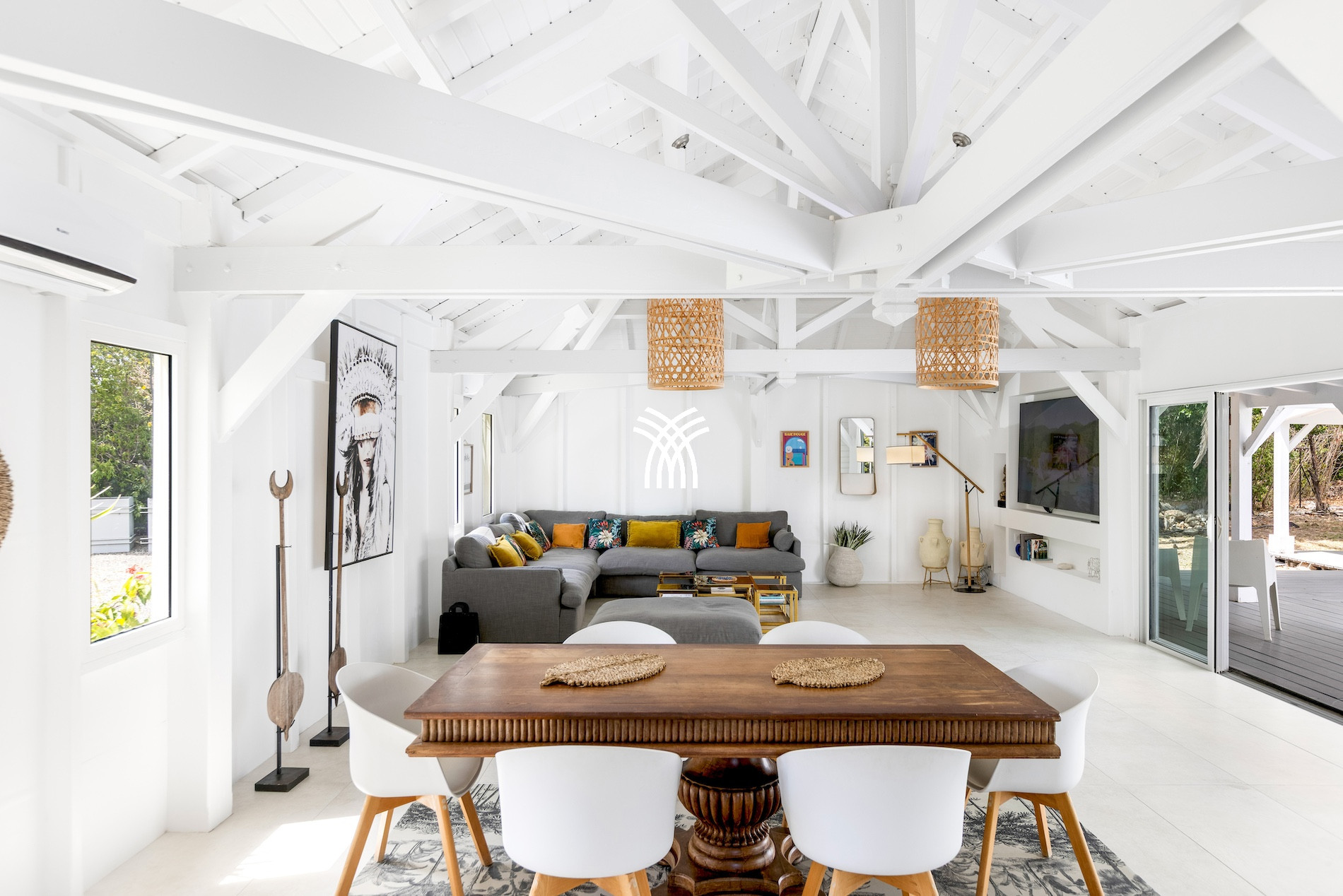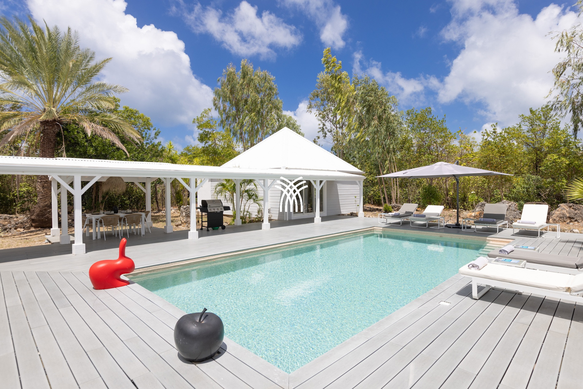 Dès l’arrivée, le charme opère. Protégée par une végétation luxuriante, la propriété dévoile une architecture inspirée des Caraïbes françaises, mêlant esprit traditionnel et touches contemporaines. L’agencement en plusieurs bungalows distincts, signature rare et recherchée dans l’univers de la location de villa luxe Terres Basses, offre à chaque hôte un sentiment de liberté, de calme et d’espace.