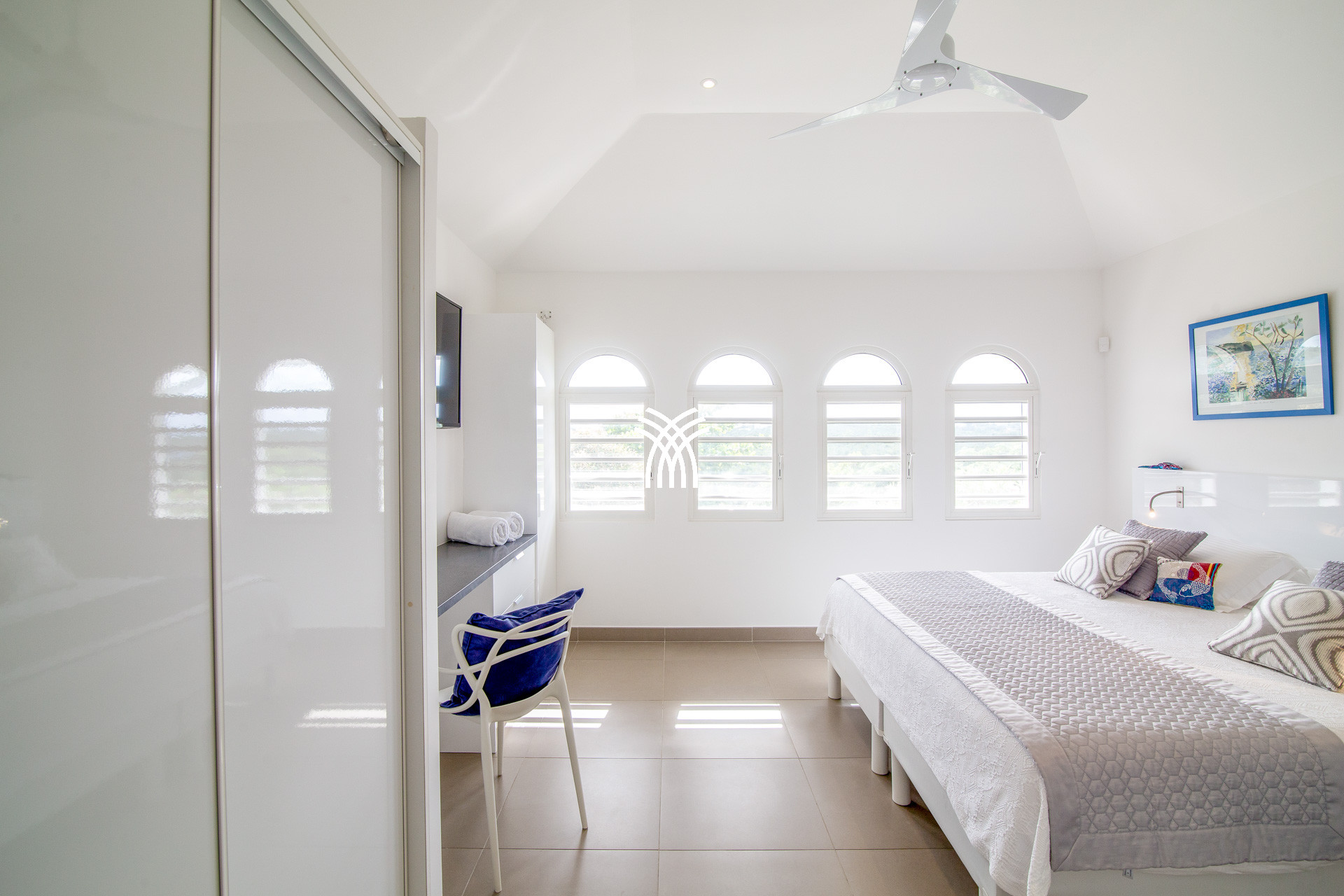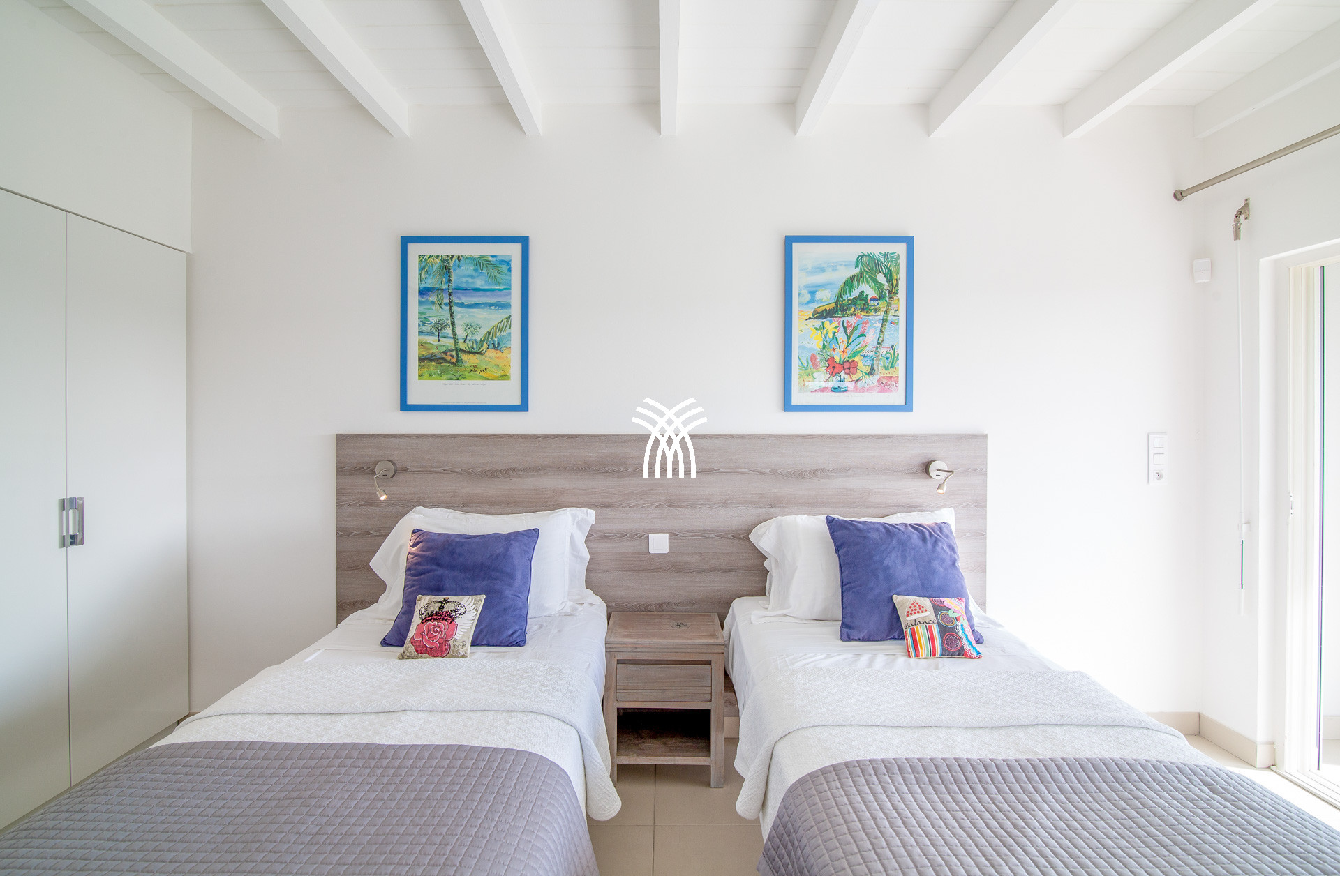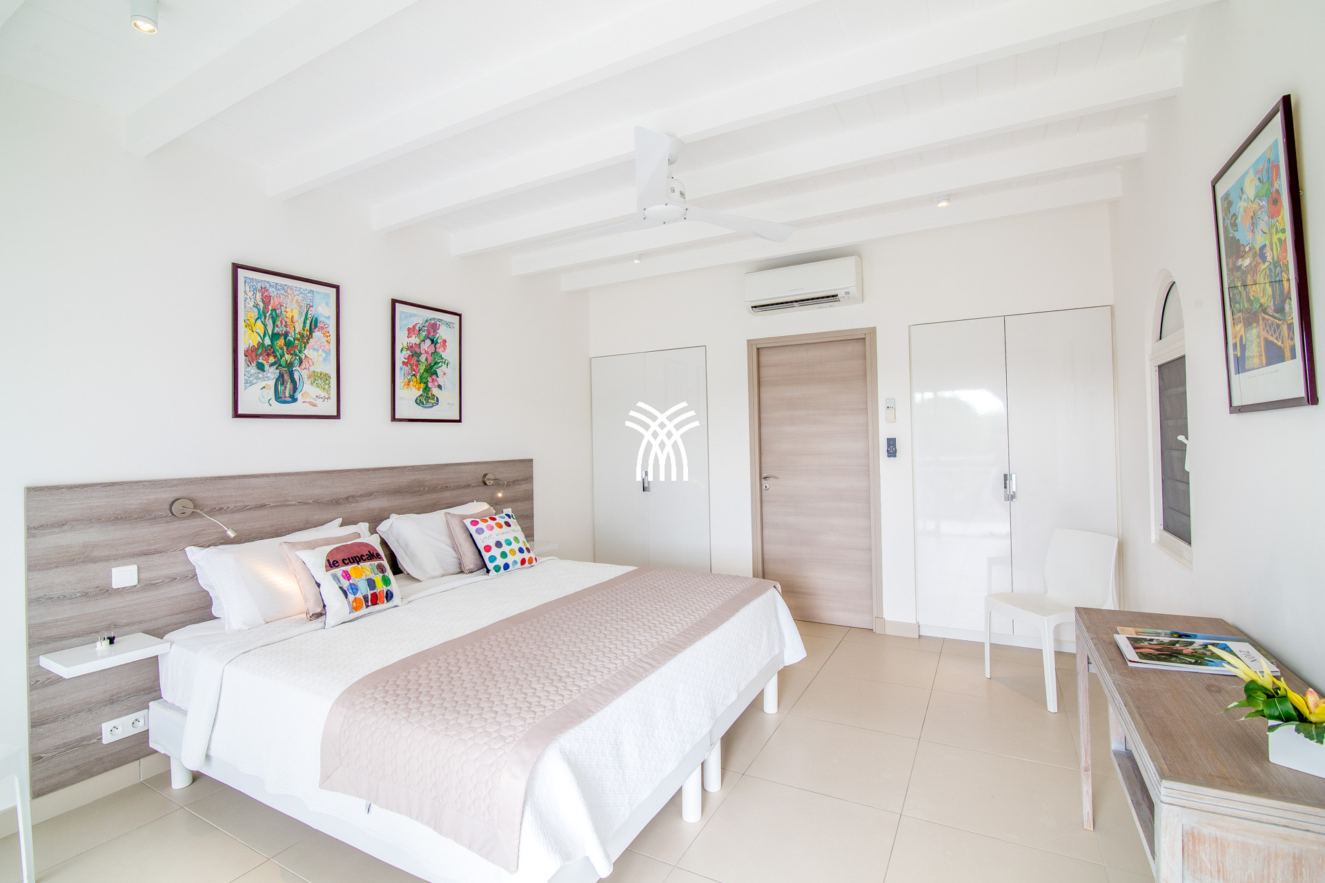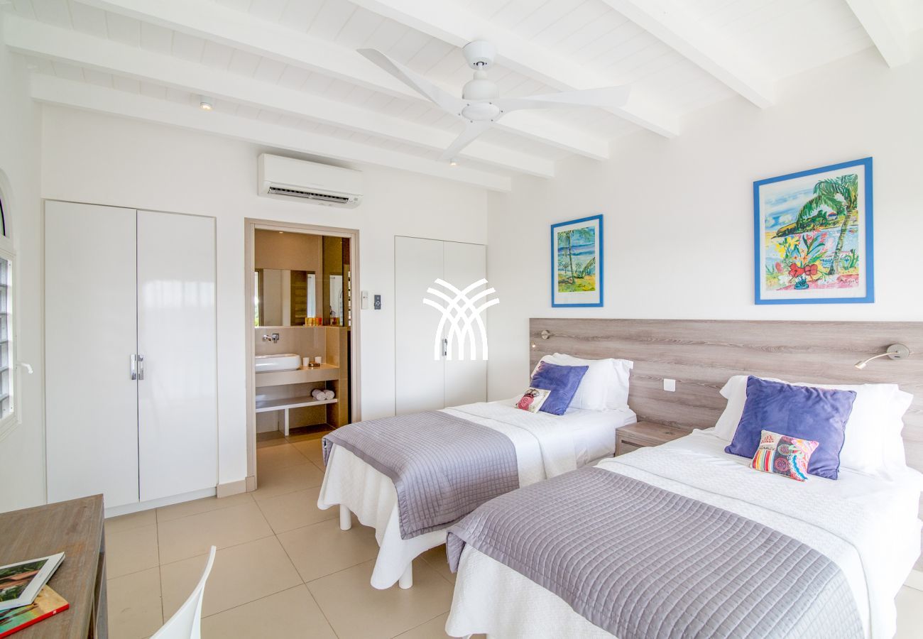 4 chambres de tailles égales ont la vue sur la mer des Caraïbes et sont au niveau de la terrasse de la piscine. La 5ème chambre et sa salle de bains attenante sont au niveau inférieur avec vue sur la mer des Caraïbes. Cette chambre comprend aussi une kitchenette.