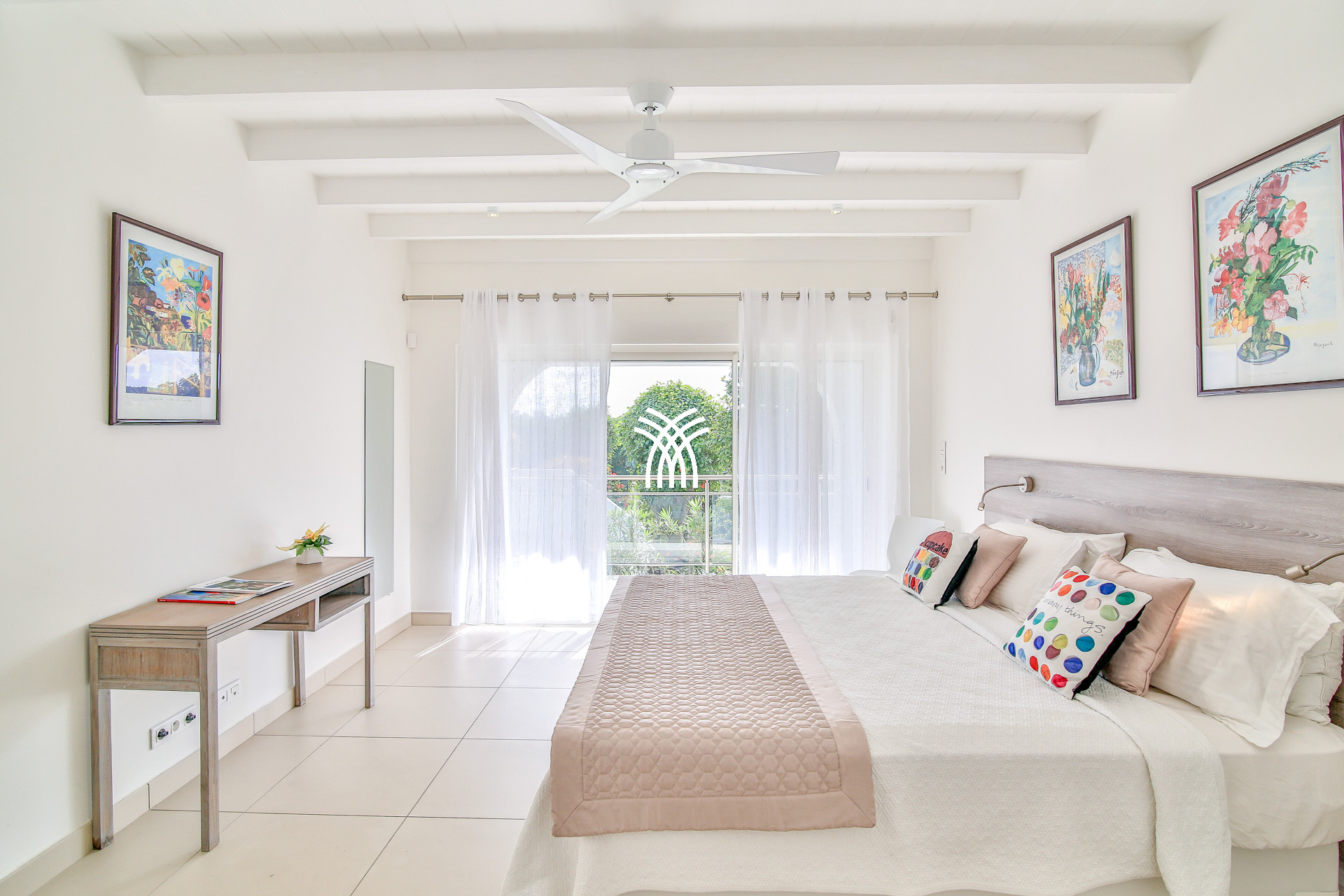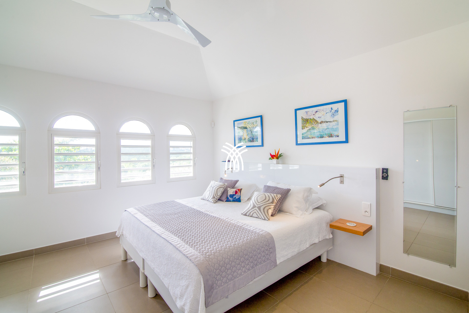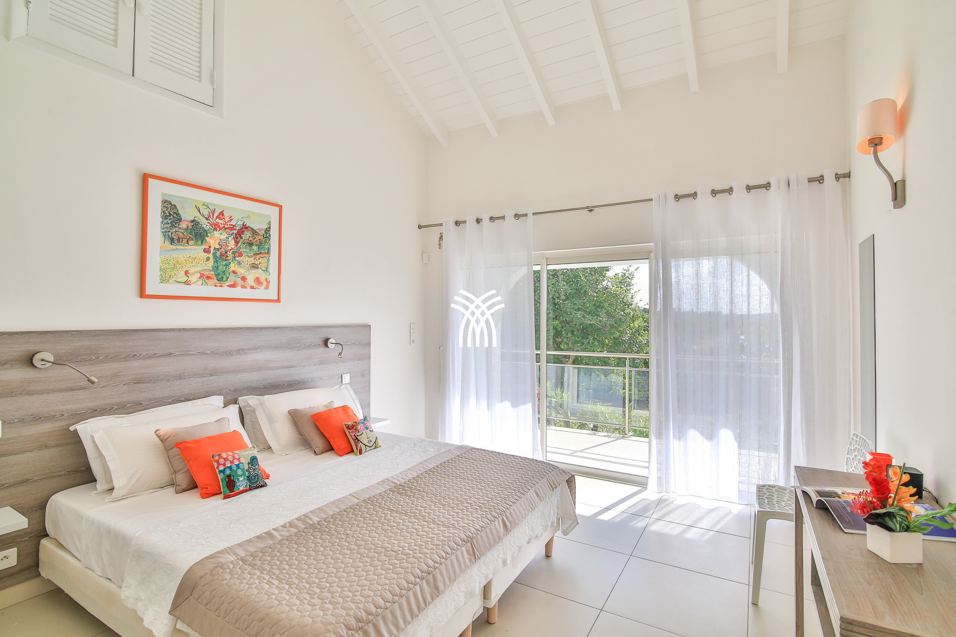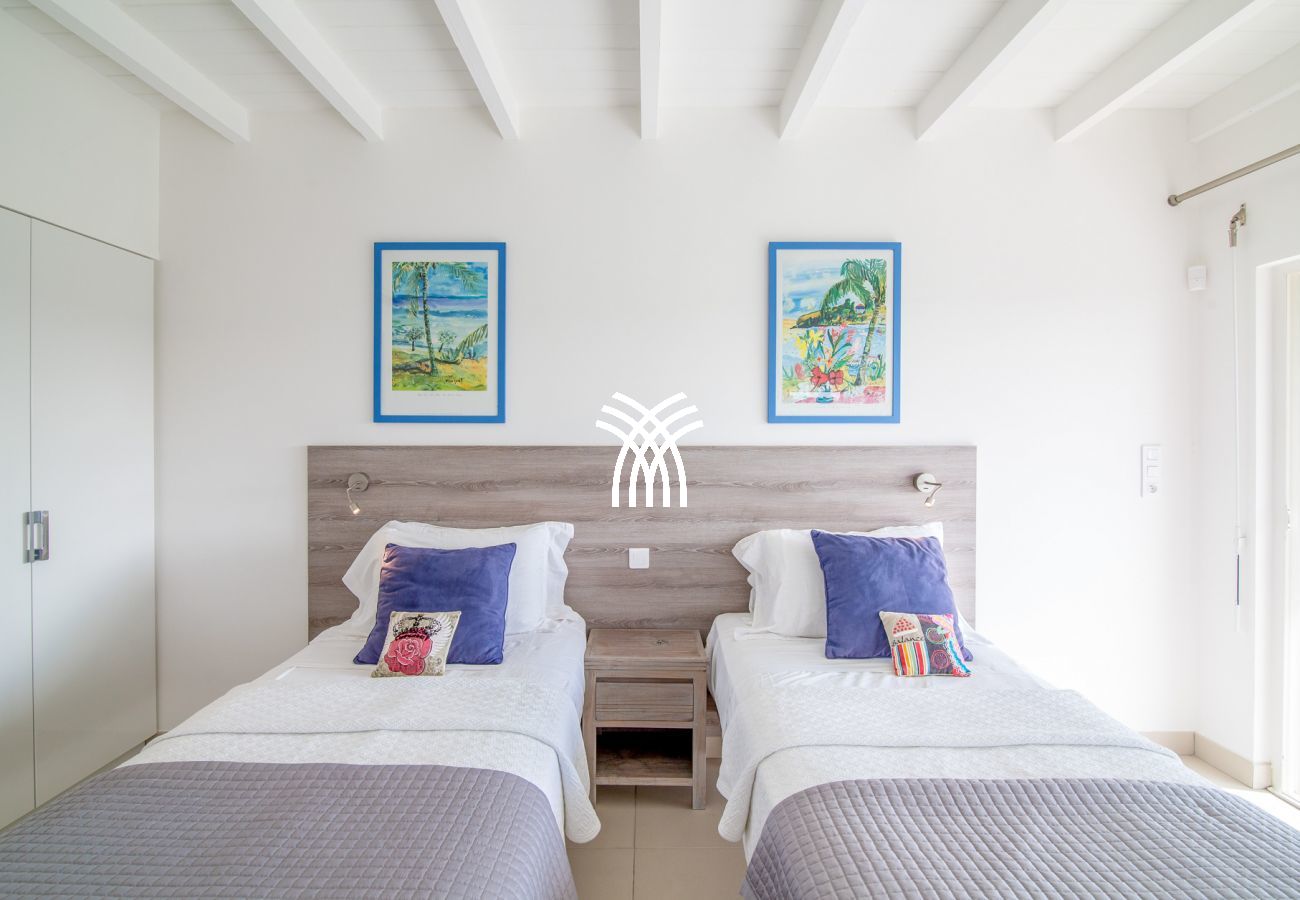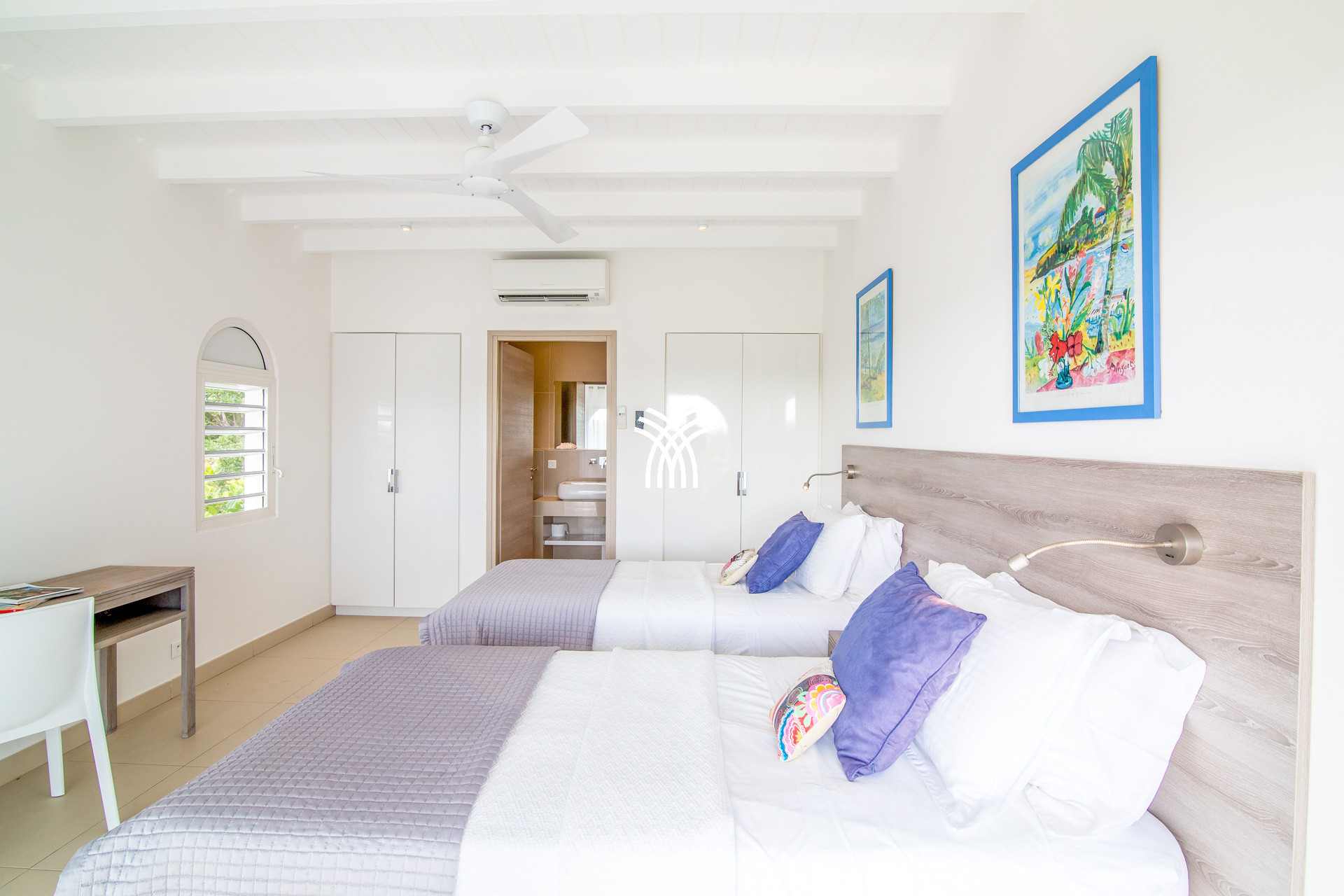 4 chambres de tailles égales ont la vue sur la mer des Caraïbes et sont au niveau de la terrasse de la piscine. La 5ème chambre et sa salle de bains attenante sont au niveau inférieur avec vue sur la mer des Caraïbes. Cette chambre comprend aussi une kitchenette.