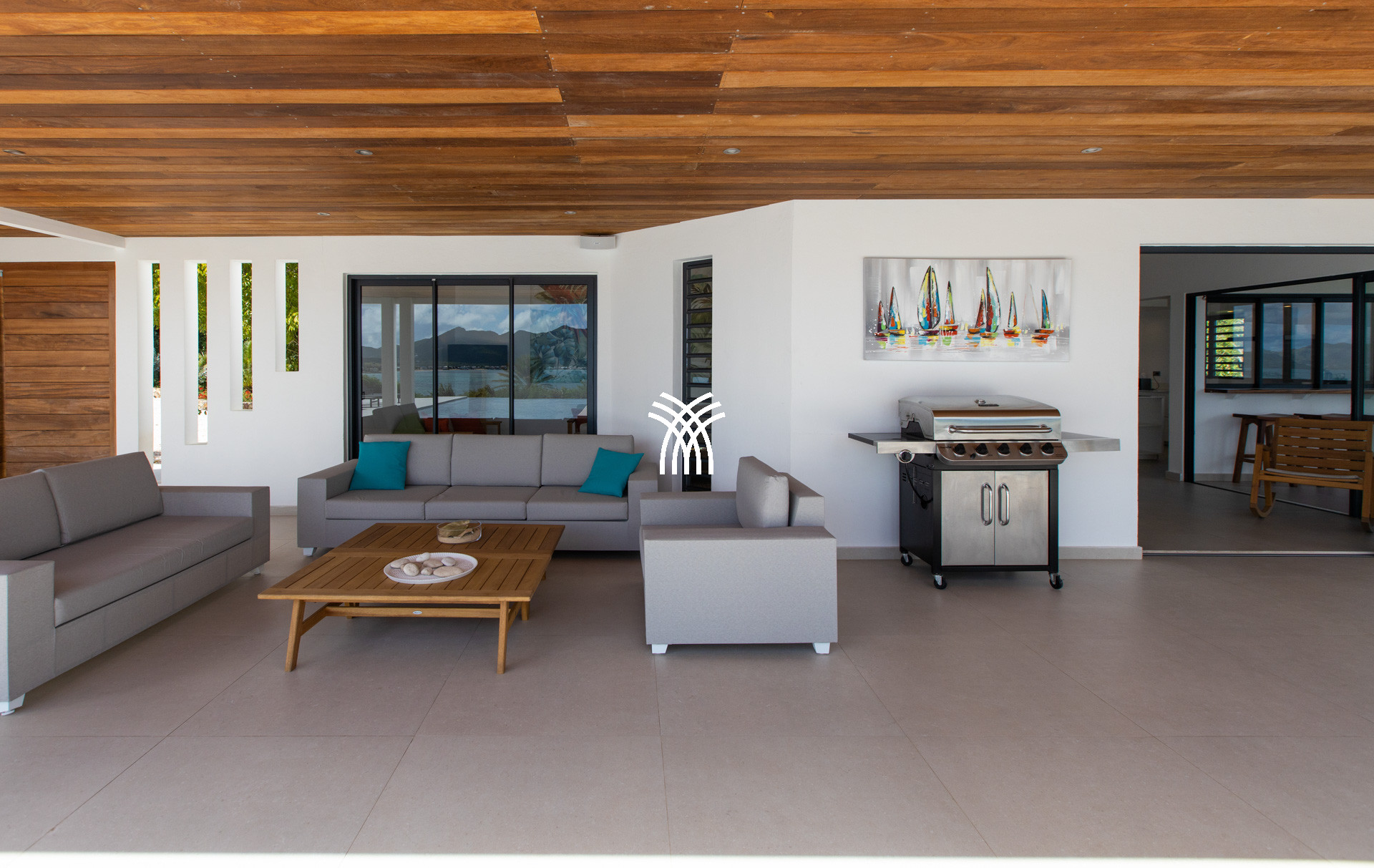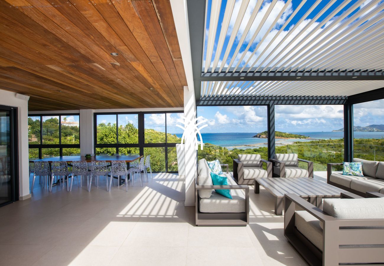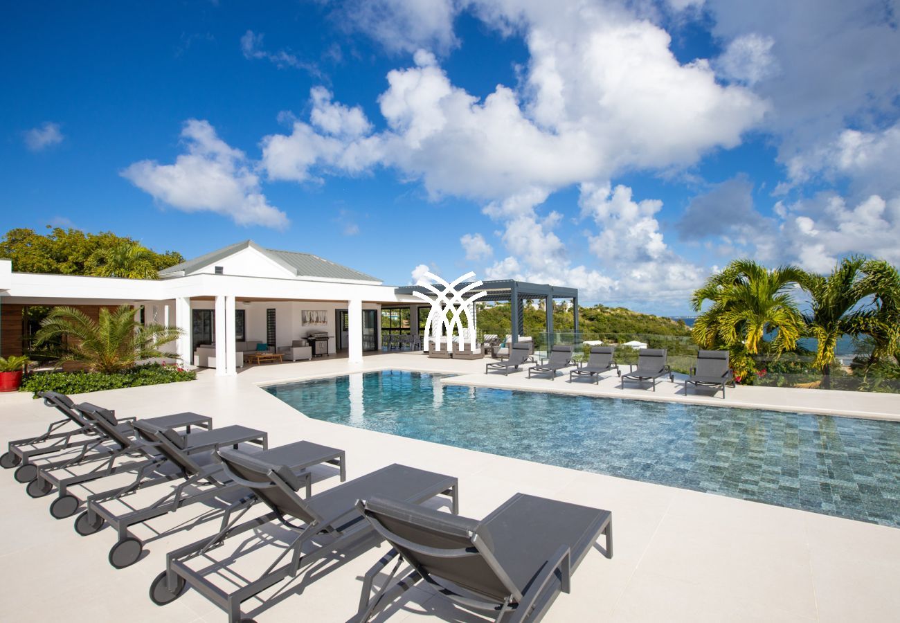 L’extérieur de cette villa de luxe à louer à Saint Martin est un véritable havre de paix. La grande terrasse aménagée avec salon extérieur d’inspiration marocaine, piscine à débordement et salle à manger en plein air permet de vivre pleinement l’art de vivre caribéen, entre détente et convivialité.