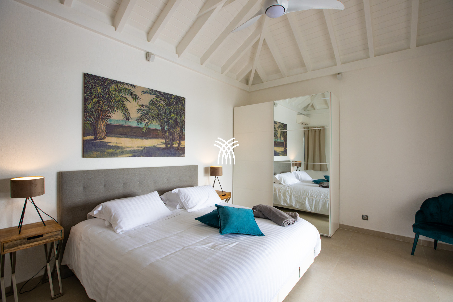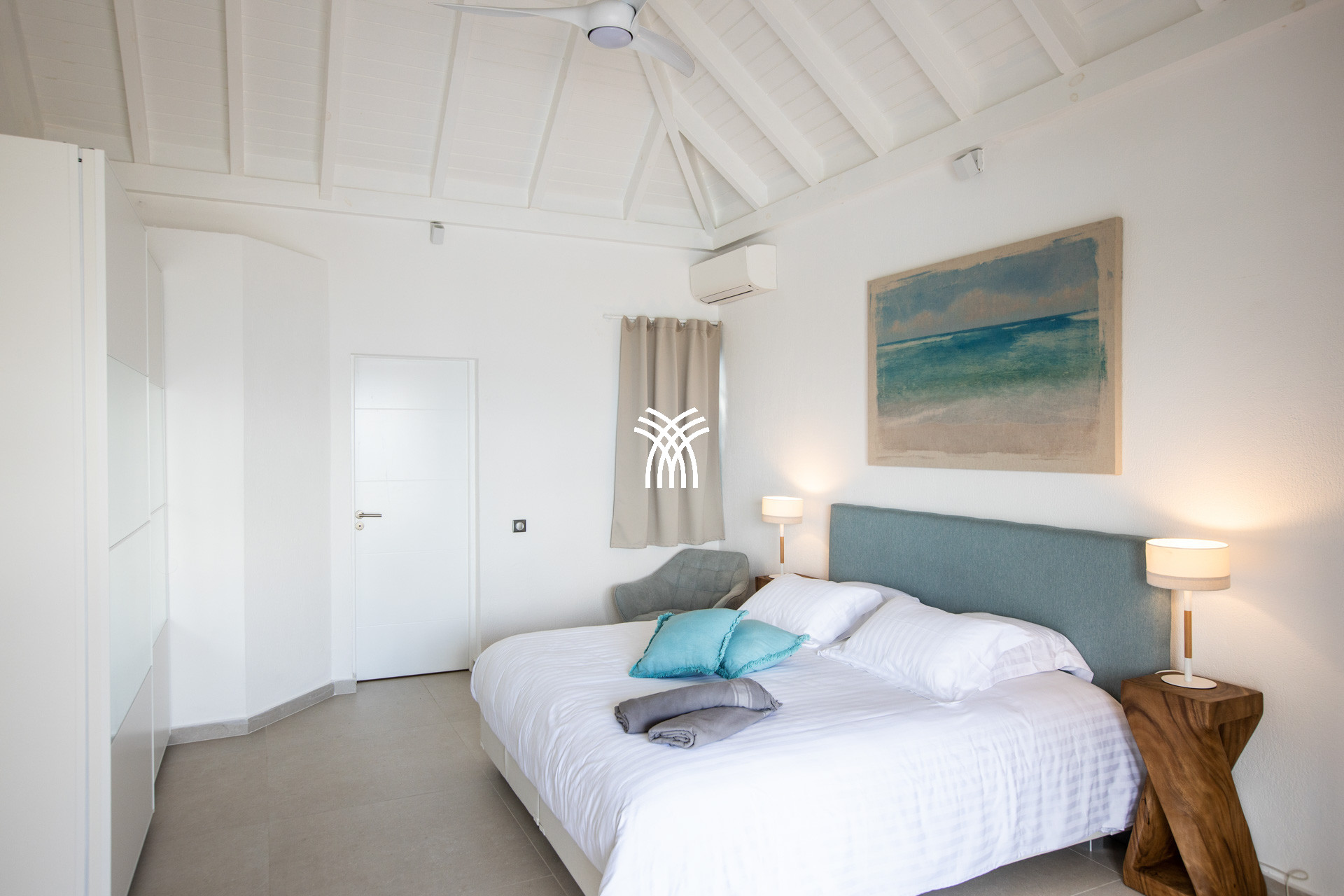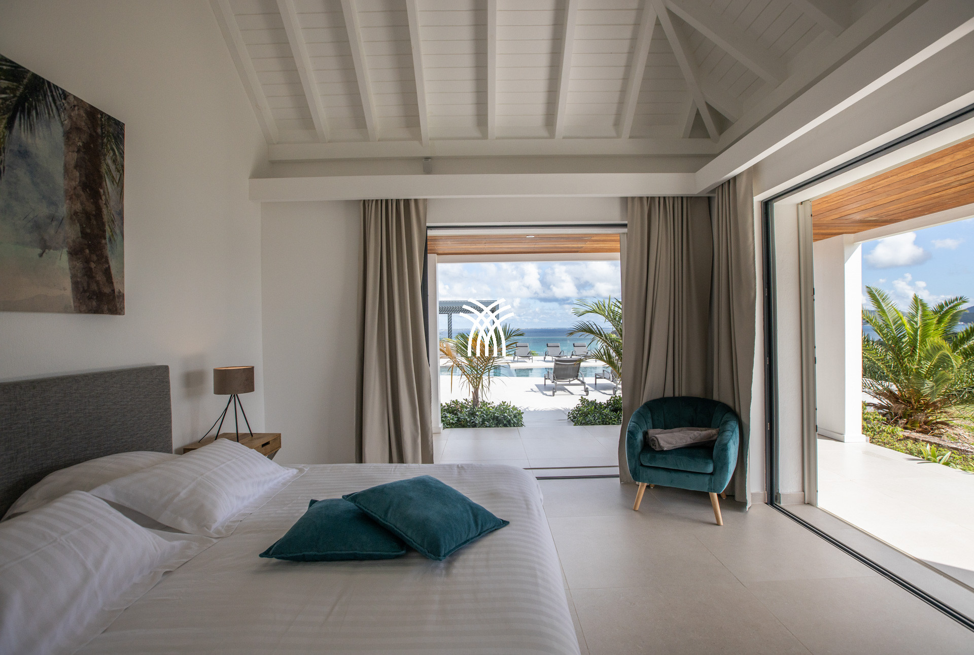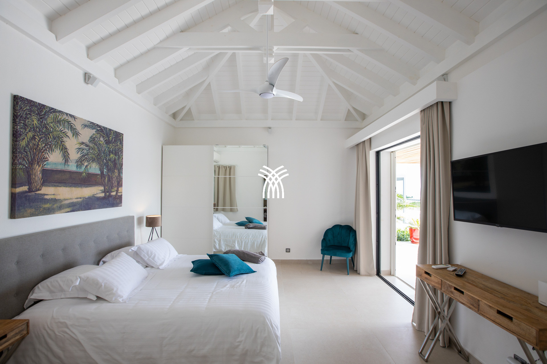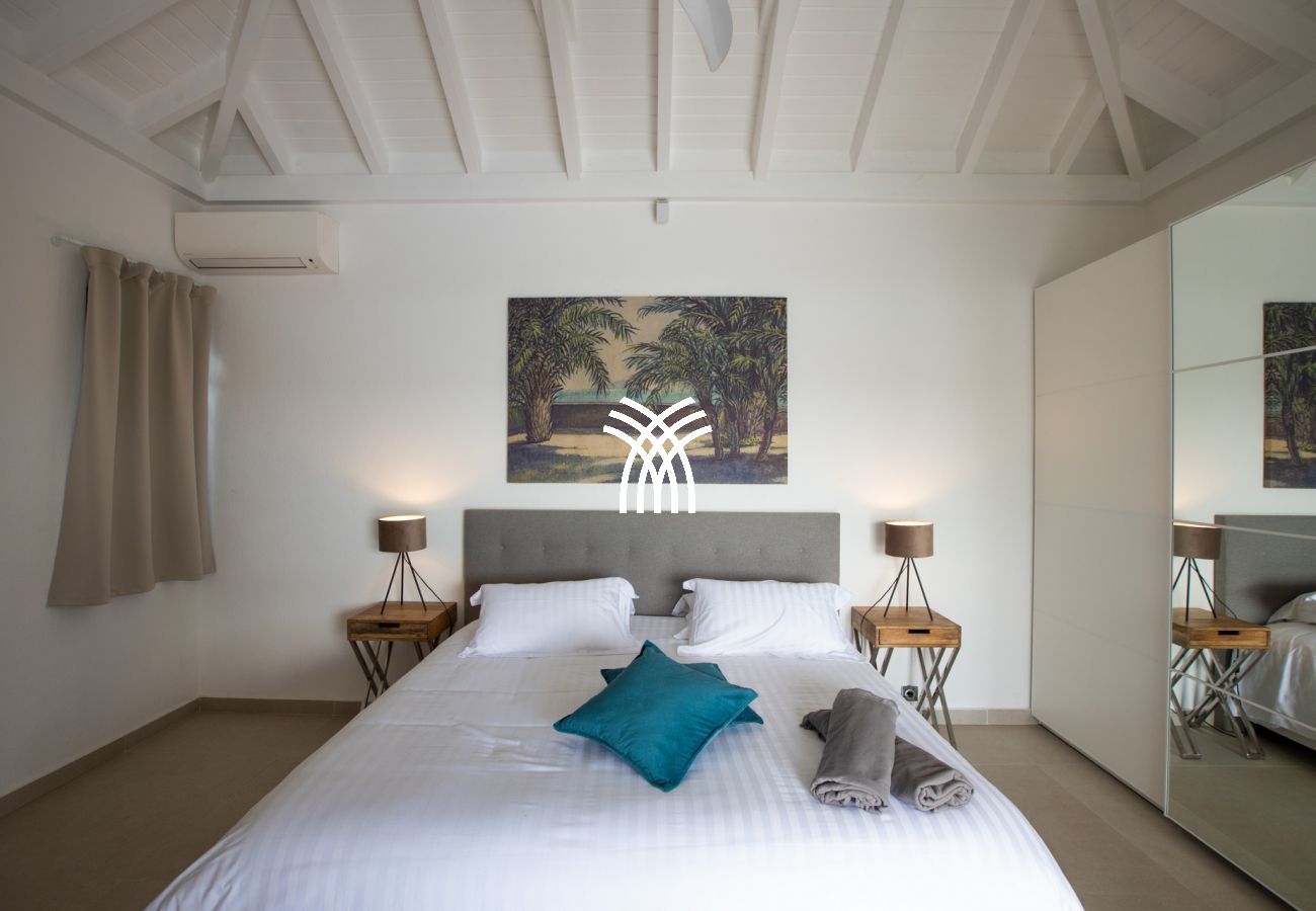 4 chambres de tailles égales ont la vue sur la mer des Caraïbes et sont au niveau de la terrasse de la piscine. La 5ème chambre et sa salle de bains attenante sont au niveau inférieur avec vue sur la mer des Caraïbes. Cette chambre comprend aussi une kitchenette.